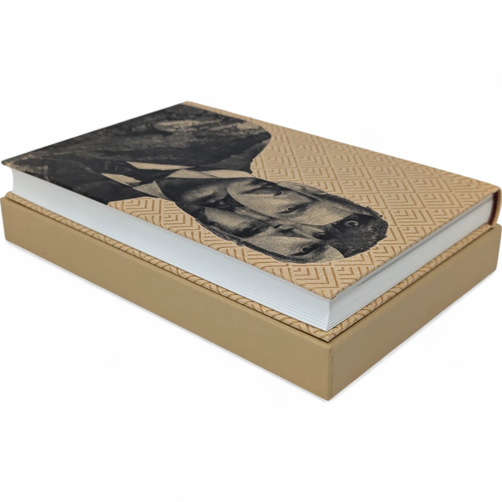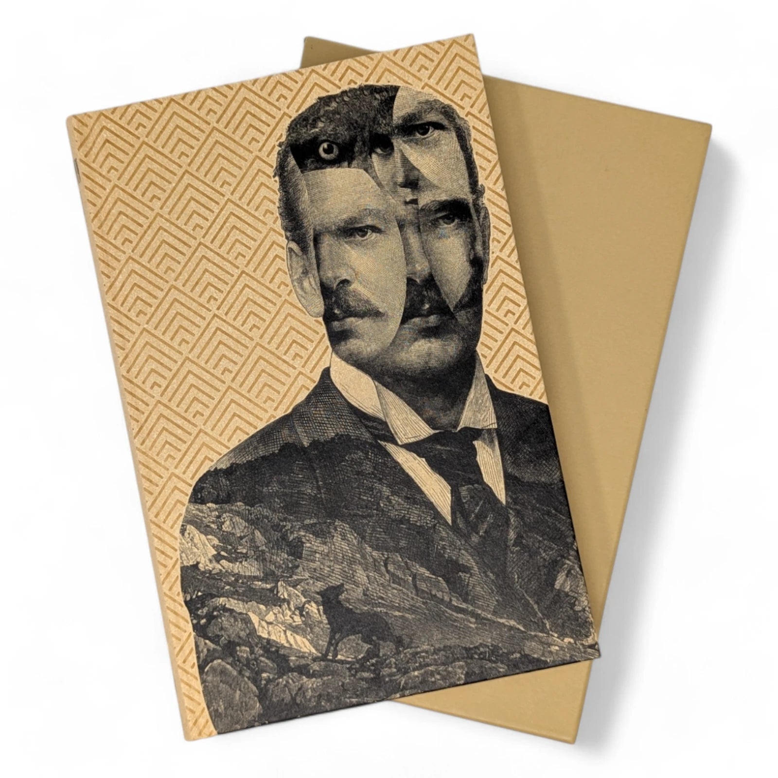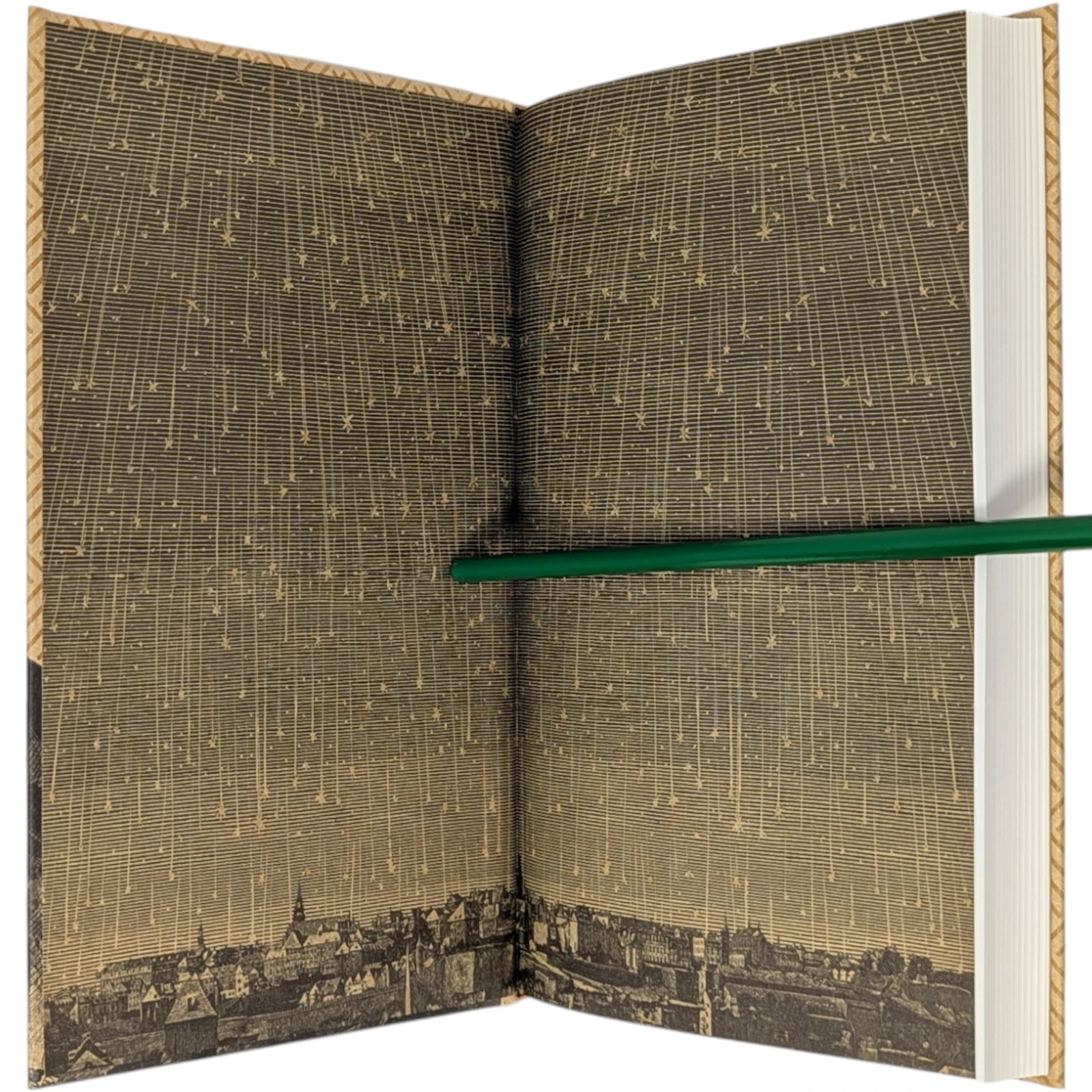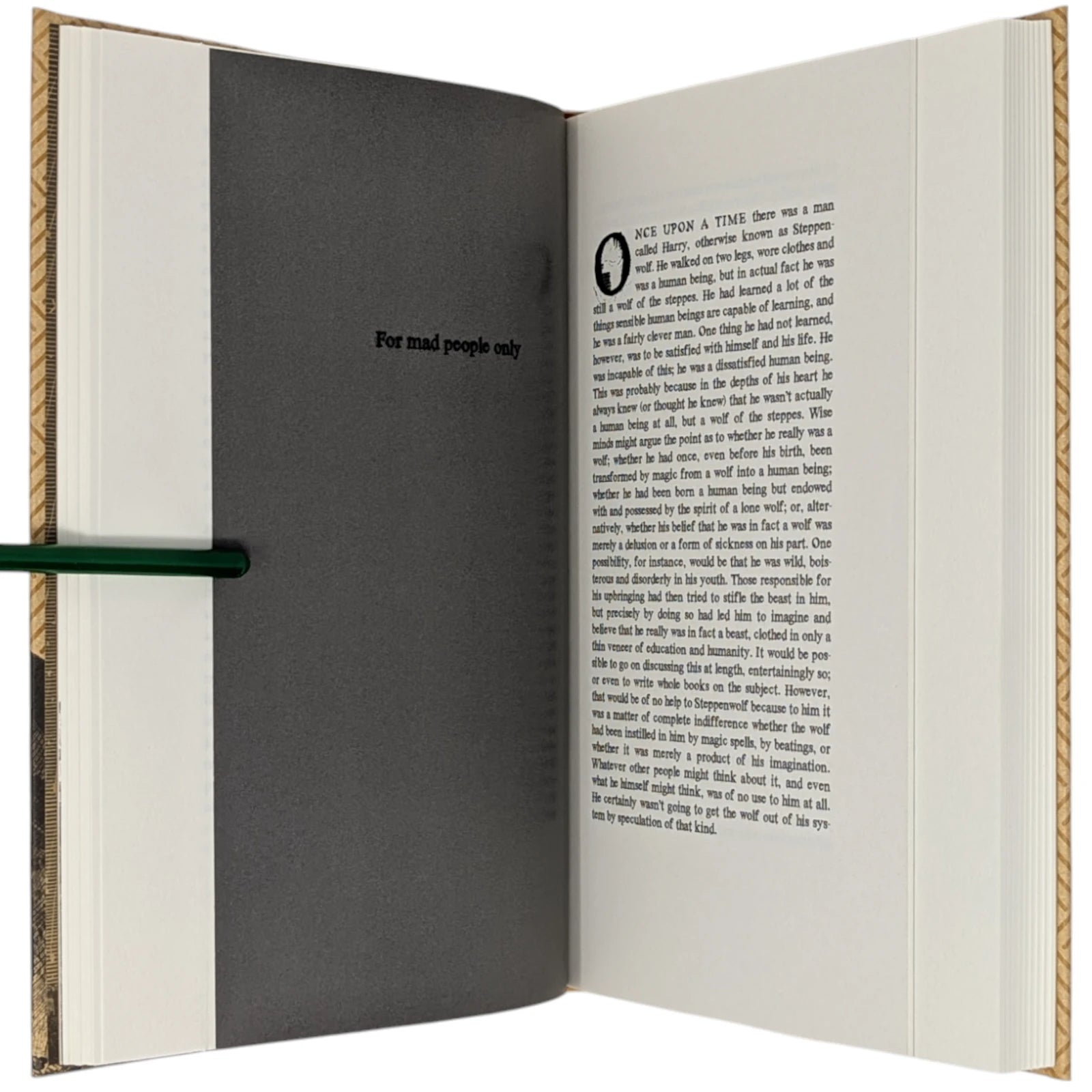 Hermann Hesse, Steppenwolf. London: The Folio Society, 2018. First Print Thus. Translated by David Horrocks, illustrations by Dan Hillier. 227 × 150 × 23 mm. Pp. [i–xii], [1–3] 4–194 [195–198]. Type: Sabon. Printed and bound by Kösel in full pale brown paper printed in black and blocked in brown with a design by the artist; pale brown endleaves with rooftop view printed in black with stars in spot varnish. Cream slip case. Bound in between pp. 38–39 is a 28-page pamphlet with decorative wrappers titled On Steppenwolf, a tract. The title-page spread and pamphlet cover are by Hillier.