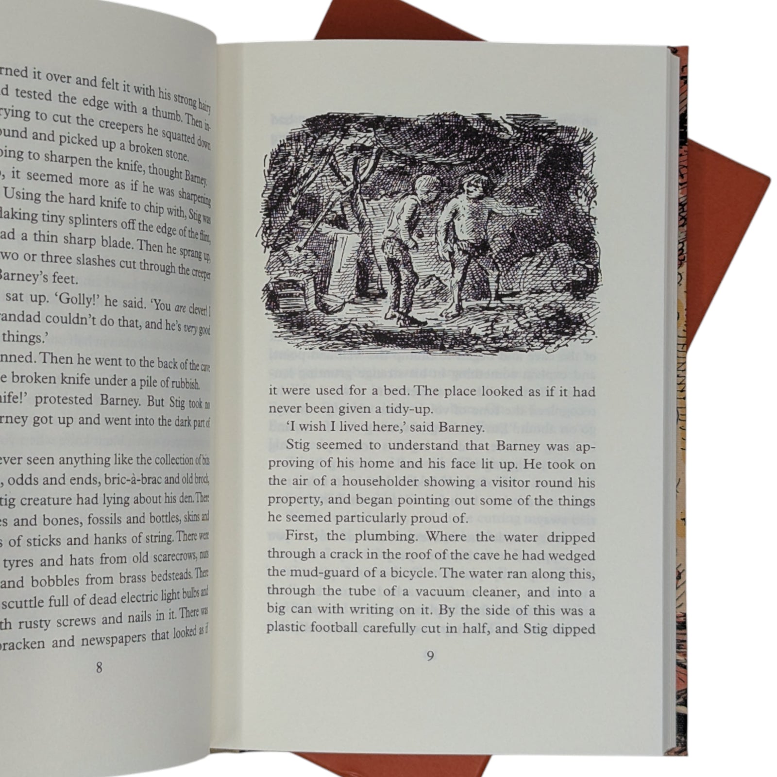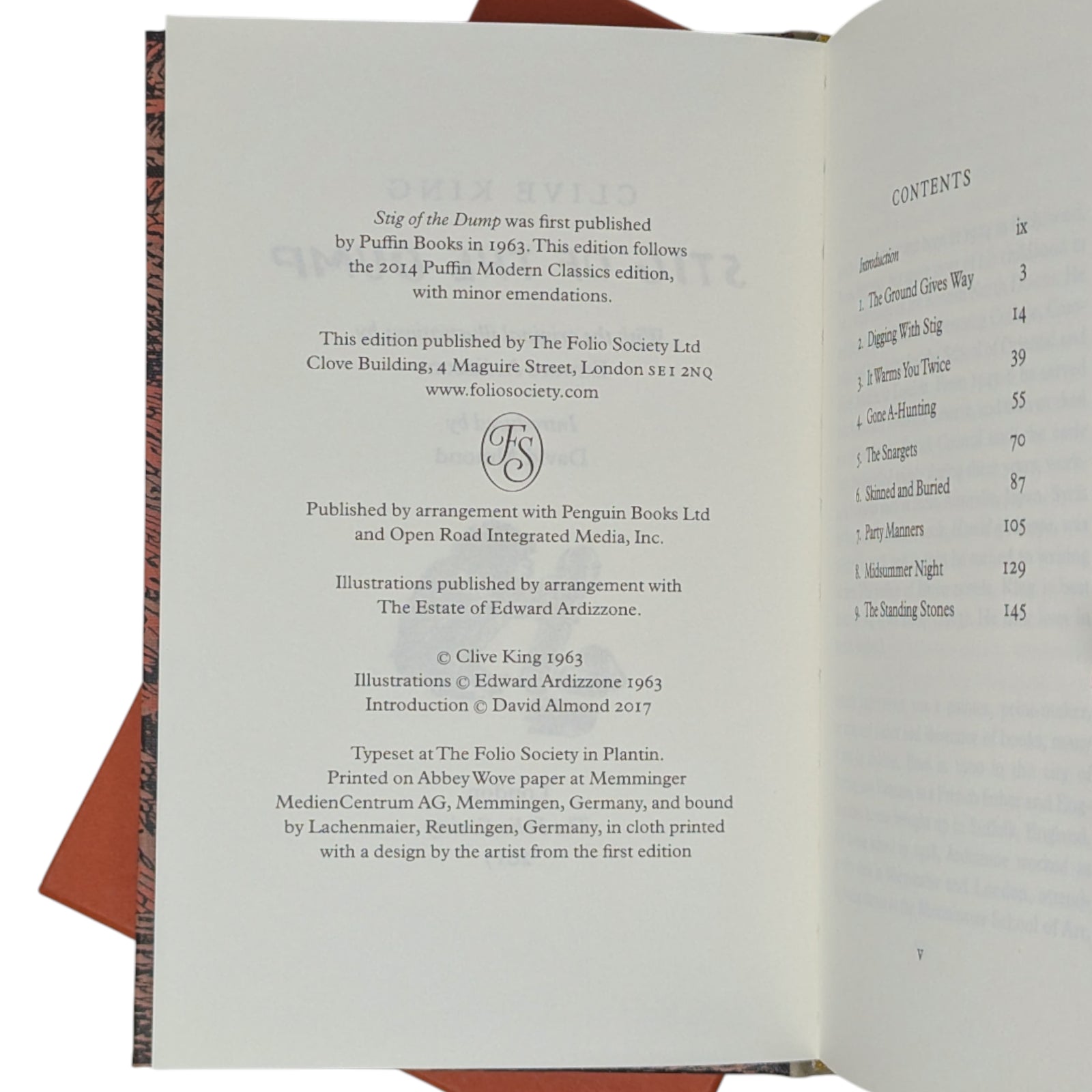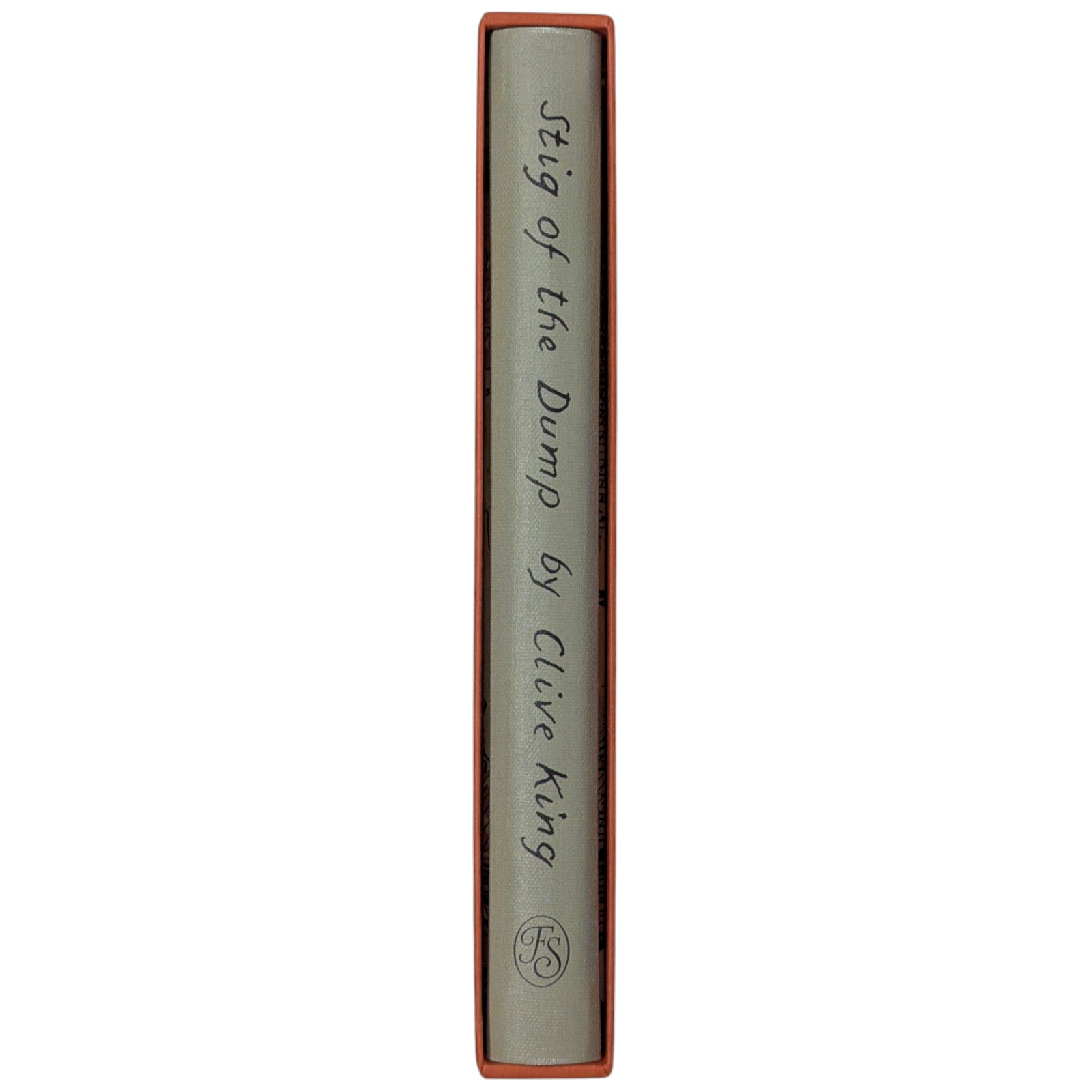 Stig of the Dump, by Clive King. London: The Folio Society, 2017. First printing thus. With the original illustrations by Edward Ardizzone, introduced by David Almond. 203 × 134 × 23 mm. Pp. [i–iv] v–xvii [xviii], [1–2] 3–170 [171–174]. Type: Plantin. Printed by Memminger MedienCentrum. Bound by Real Lachenmaier in full grey cloth printed with a design by Ardizzone brown-green endleaves. Dark orange slip case.