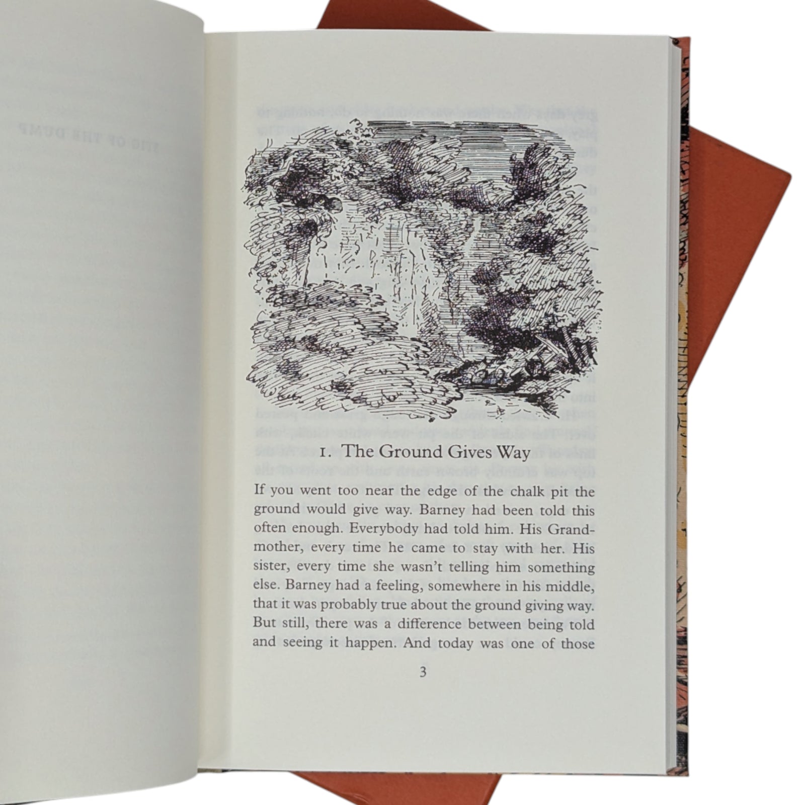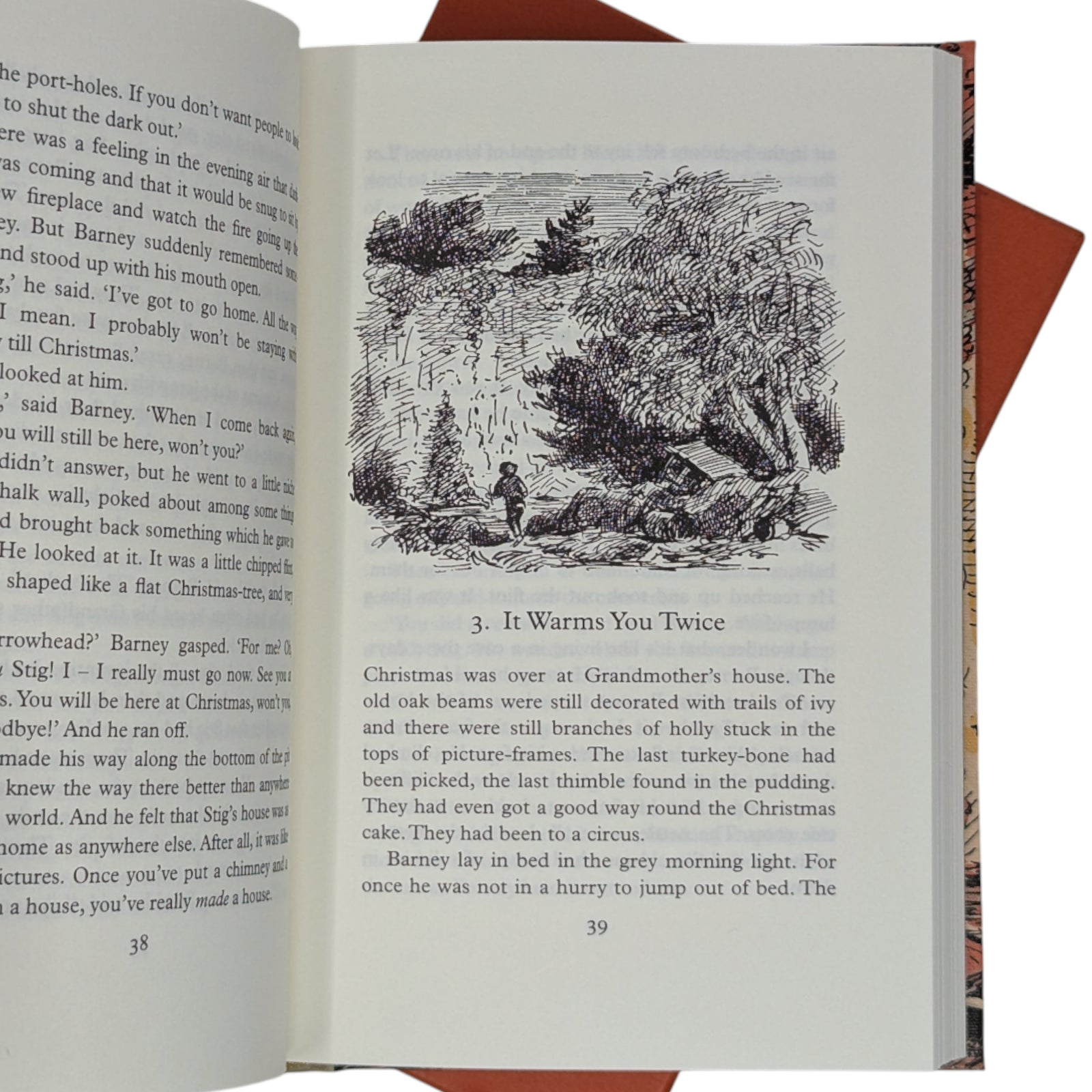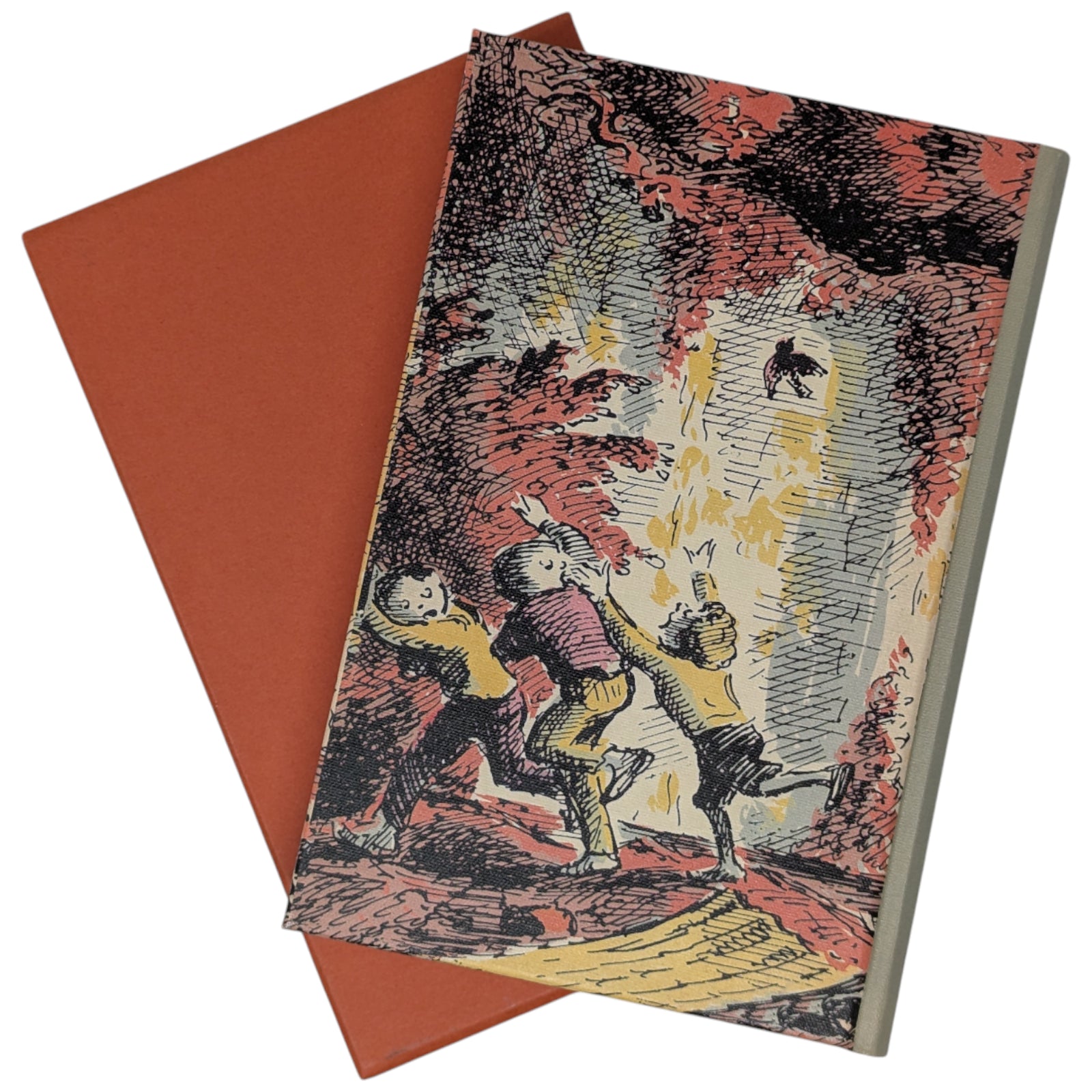 Stig of the Dump, by Clive King. London: The Folio Society, 2017. First printing thus. With the original illustrations by Edward Ardizzone, introduced by David Almond. 203 × 134 × 23 mm. Pp. [i–iv] v–xvii [xviii], [1–2] 3–170 [171–174]. Type: Plantin. Printed by Memminger MedienCentrum. Bound by Real Lachenmaier in full grey cloth printed with a design by Ardizzone brown-green endleaves. Dark orange slip case.