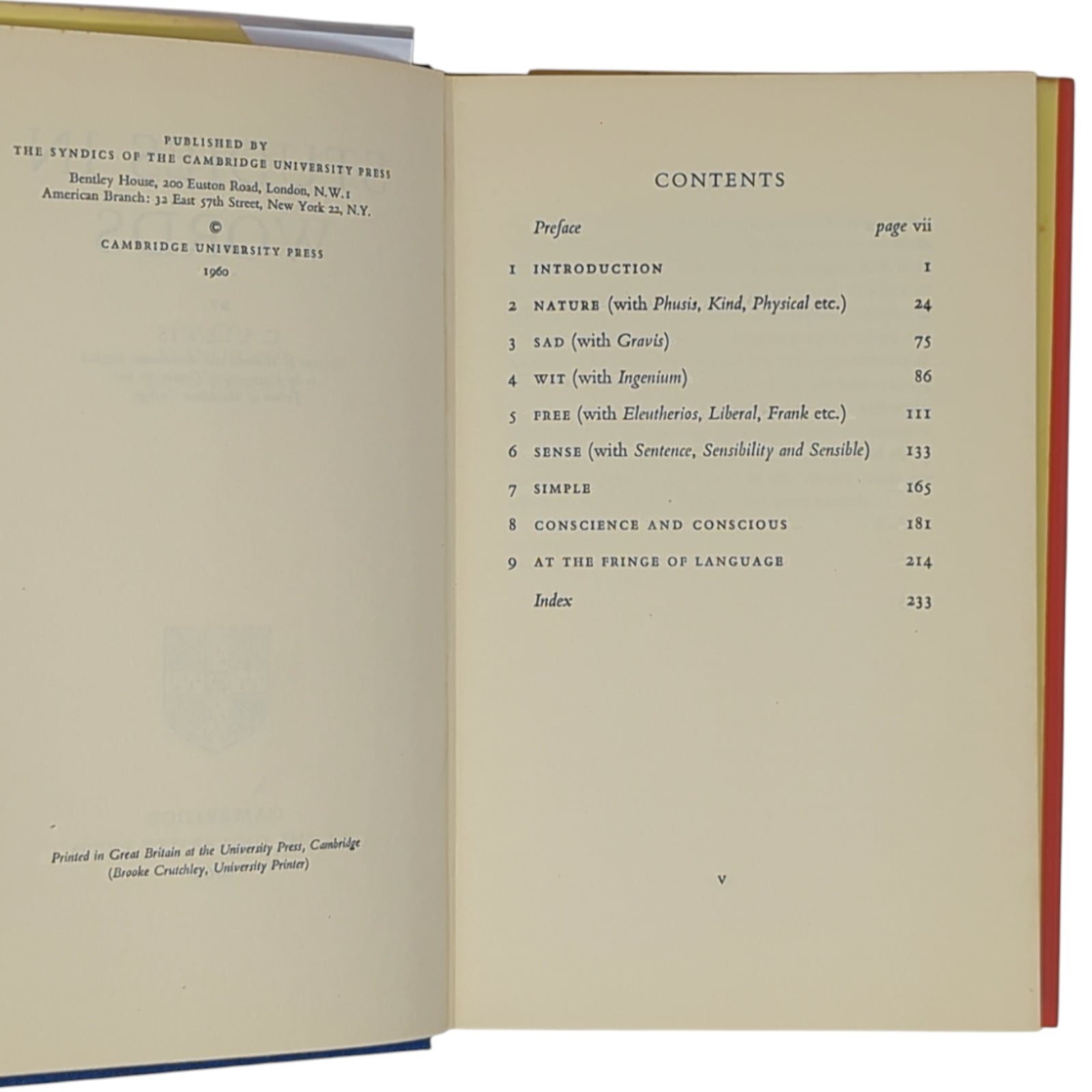 LEWIS, C. S. Studies in Words. Cambridge: at the University Press, 1960. First edition, first printing of the author's work of linguistic scholarship in which he examines the history of various words used in the English language which have changed their meanings often quite widely throughout the centuries.
