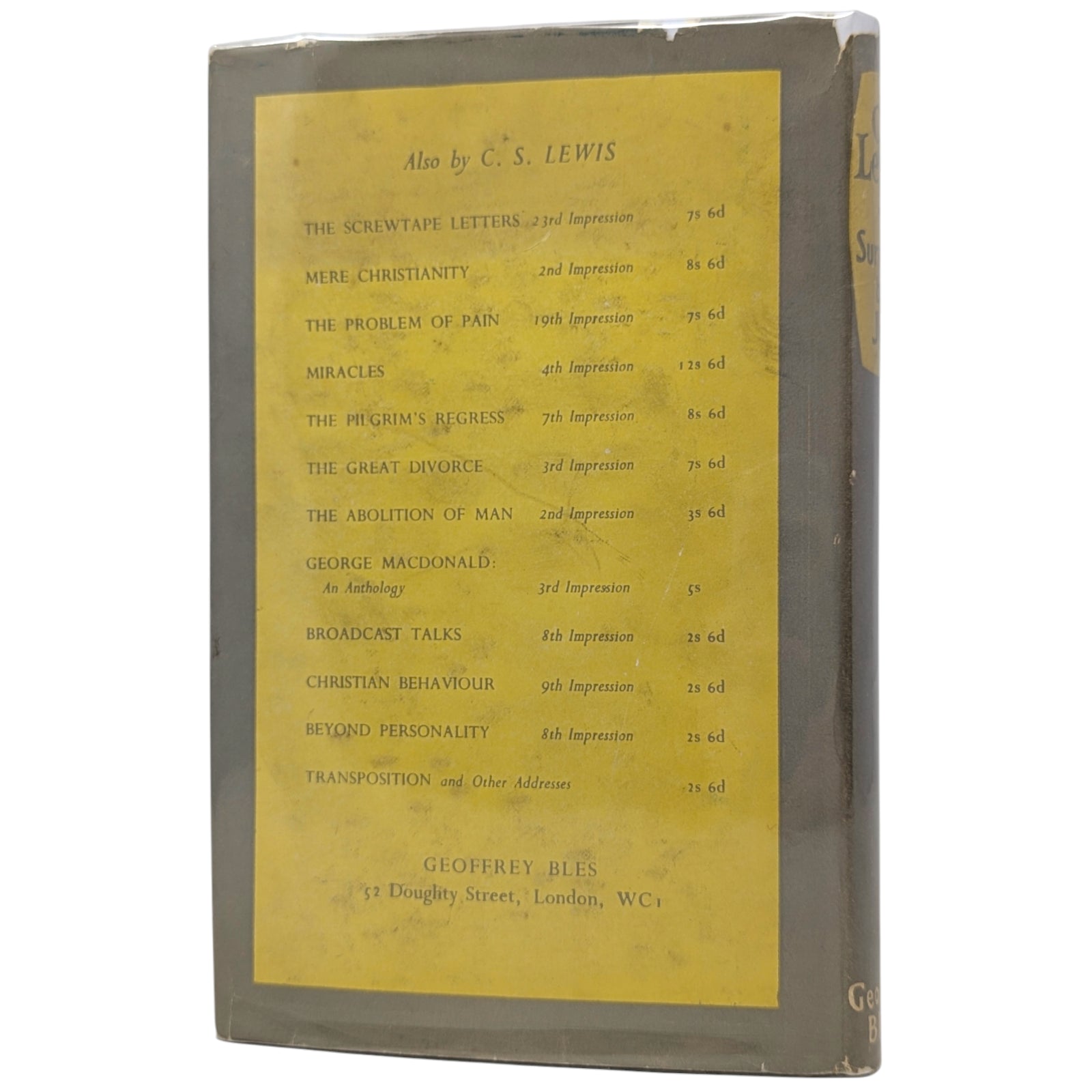 London: Geoffrey Bles, 1955. First edition, first printing. Publisher's gray cloth, yellow label with title to spine, top edge yellow; with unclipped dust jacket.