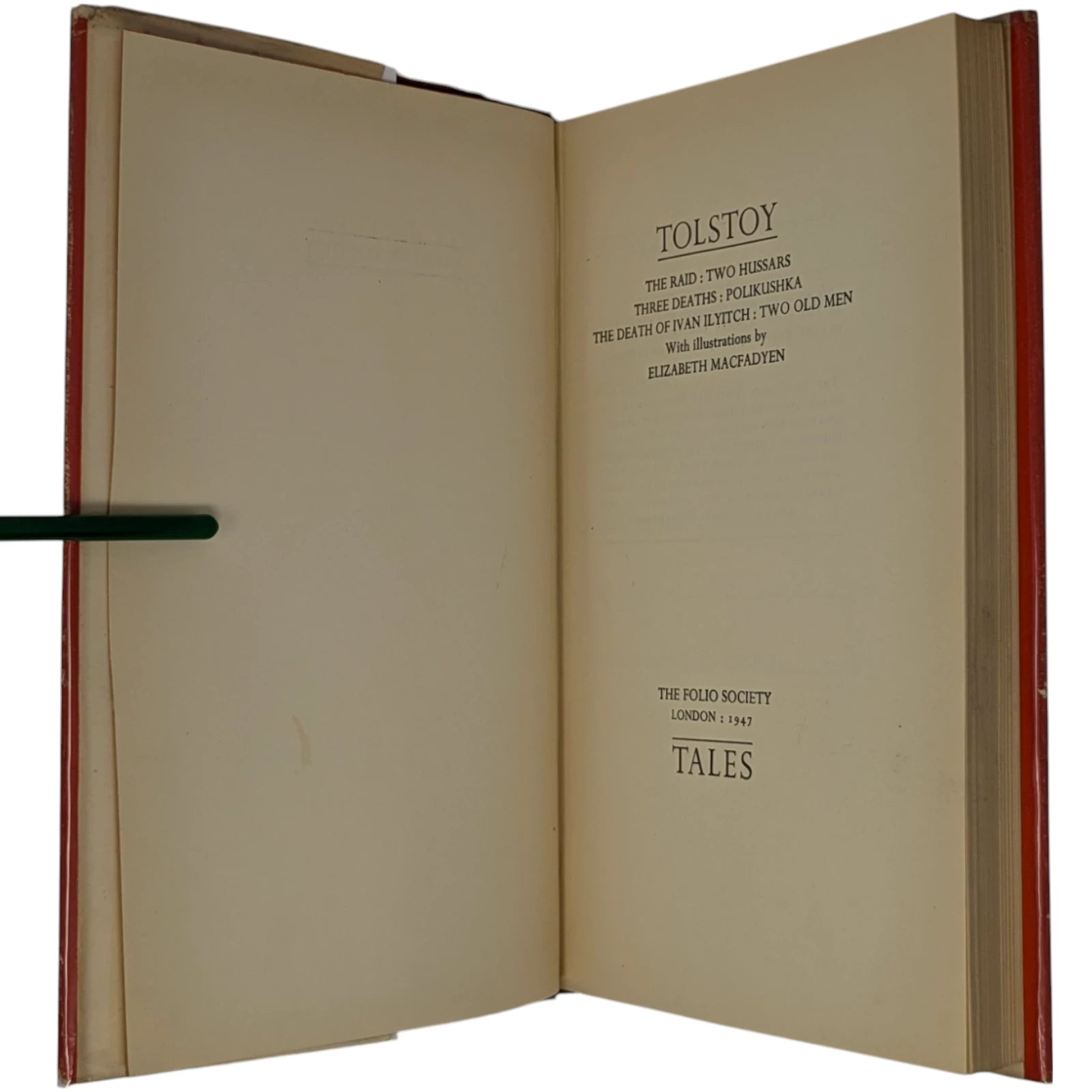Leo Tolstoy, The Raid: Two Hussars, Three Deaths: Polikushka, The Death of Ivan Ilyitch: Two Old Men. London: The Folio Society, 1947. With illustrations by Elizabeth Macfadyen.