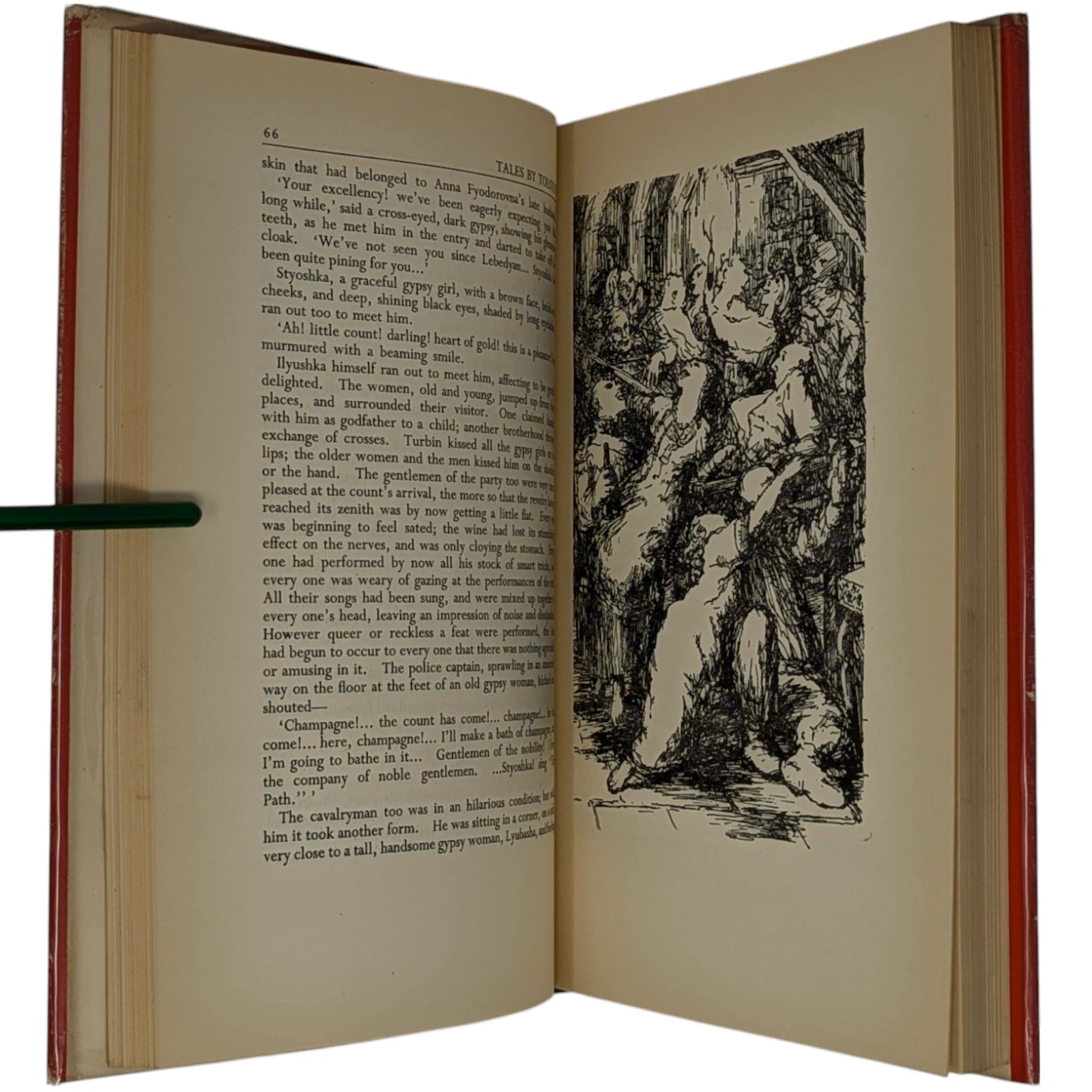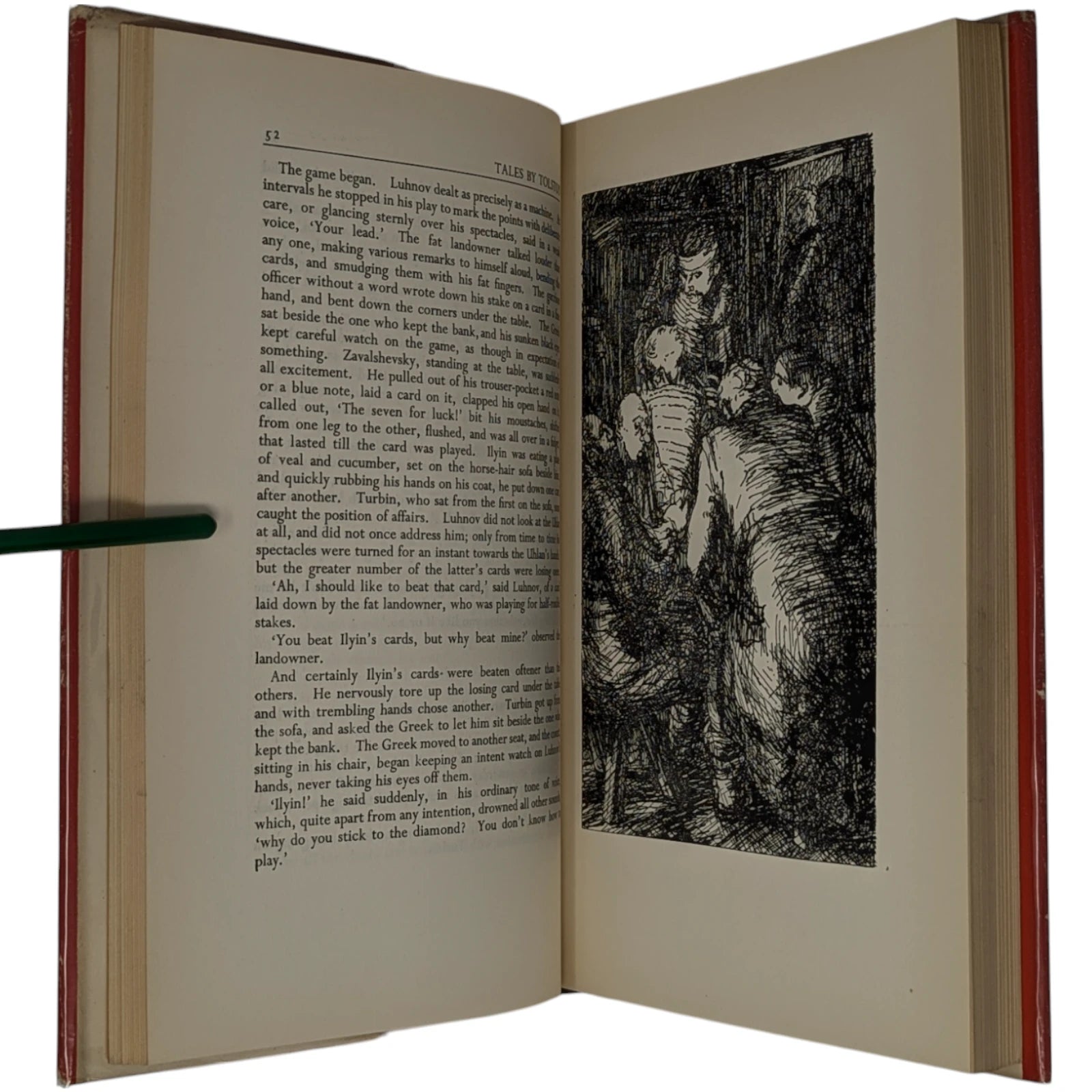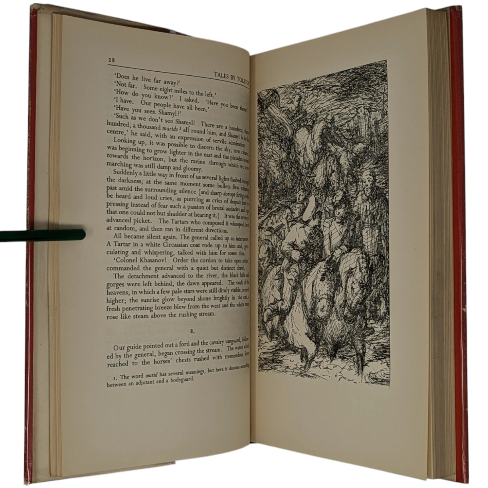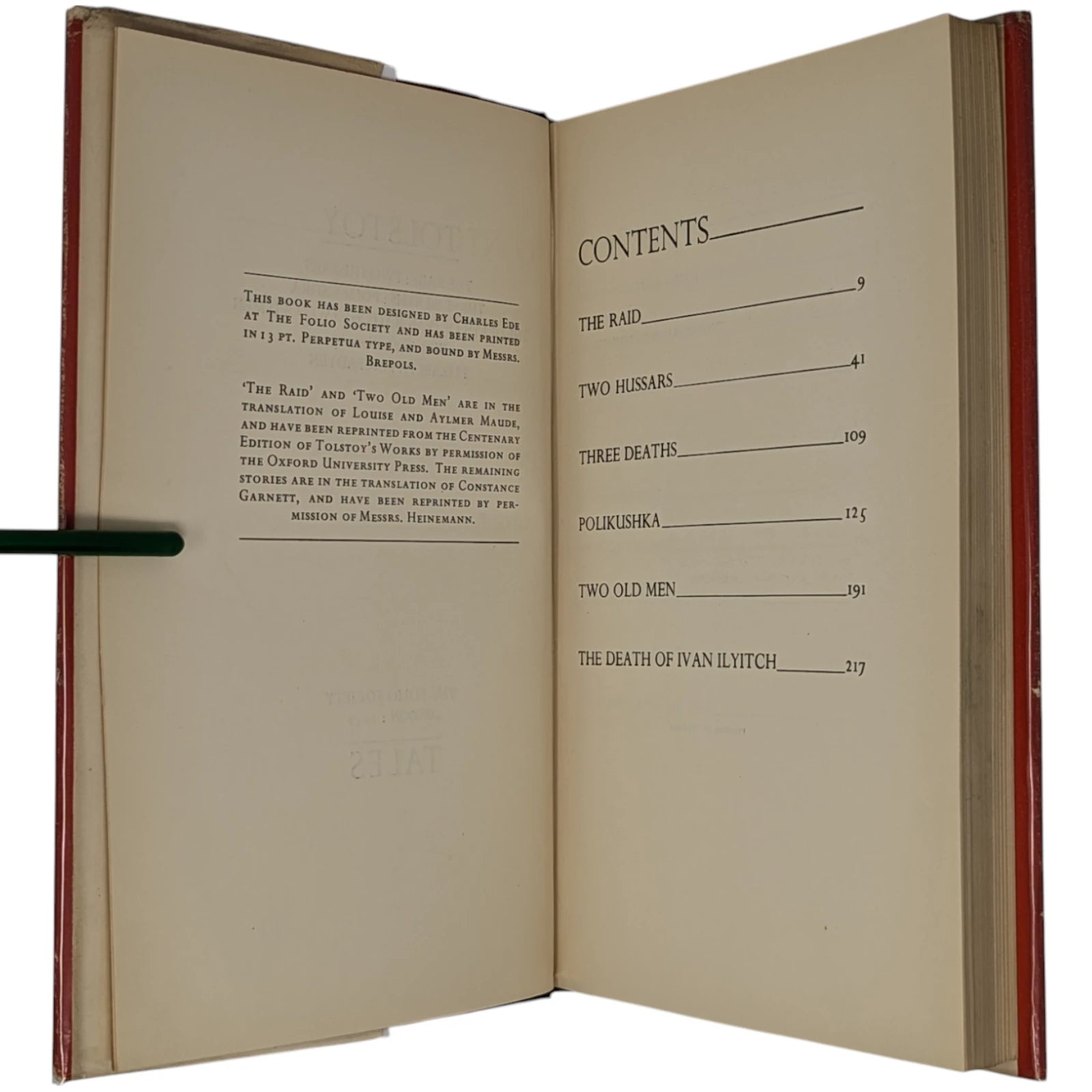 ‘The Raid’ and ‘Two Old Men’ translated by Louise and Aylmer Maude, the other stories by Constance Garnett. 253 × 160 × 25 mm. Pp. [1–9] 10–280. Type: Perpetua. Printed and bound by Brepols. Quarter black cloth, red cloth boards. White dust-jacket printed in red and black. The illustrations consist of nine pen-and-ink sketches, reproduced from line-blocks. The title-page is a little adventurous in design for a first book, with the main title ‘Tales’ appearing at the foot of the page, beneath the imprint. This book was printed and bound in Belgium because of paper rationing and the difficulties of finding printers willing to take on new work in post-war Britain; Charles Ede notes in Folio 21 that the work was printed by Brepols ‘as a favour’ and that the standard of printing ‘leaves a good deal to be desired’. The illustrations are the first (and apparently penultimate) published work of the artist.