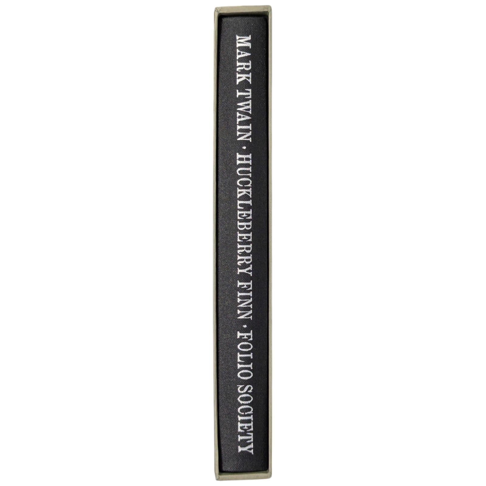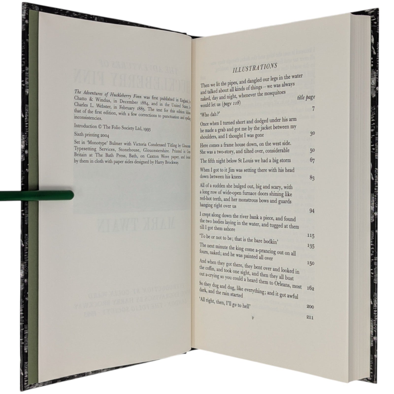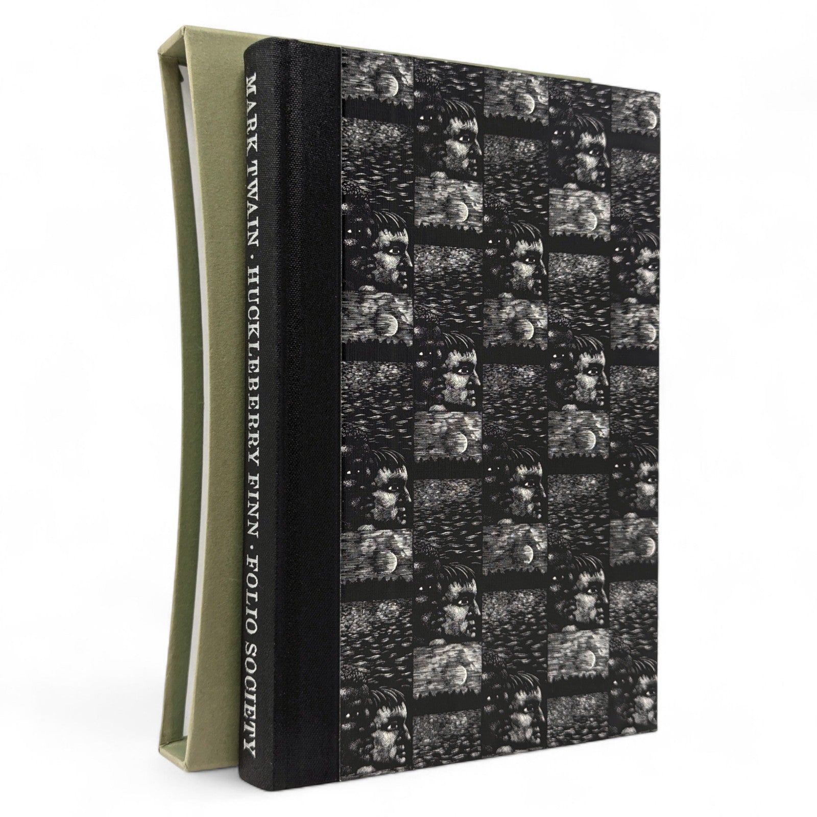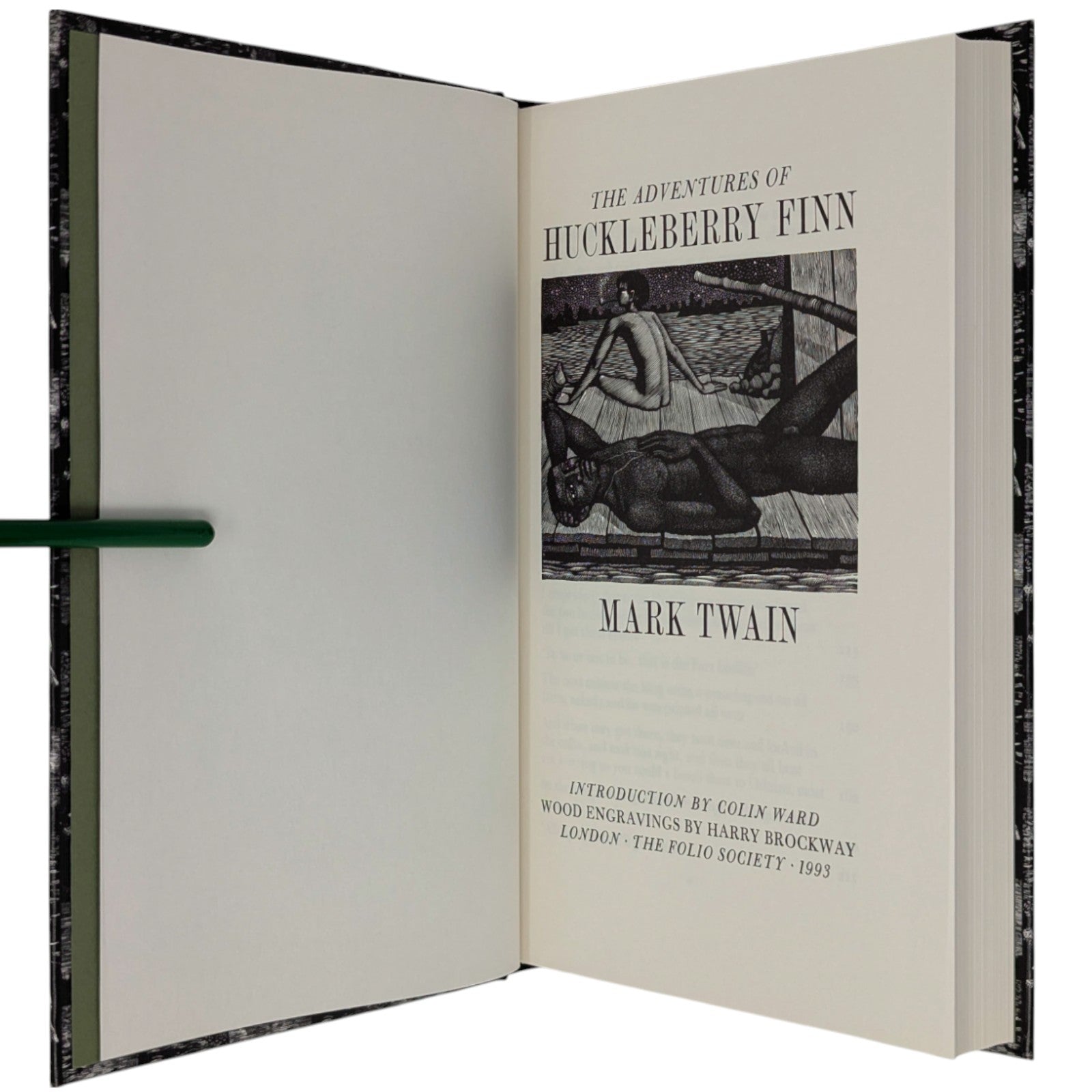 The Adventures of Huckleberry Finn, Mark Twain. London: The Folio Society, 1993. Sixth Printing 2004. Introduction by Colin Ward, wood engravings by Harry Brockway. 228 × 149 × 25 mm. Pp. [i–iv] v–xv [xvi], 1–288. Type: Bulmer with Victoria Condensed for display. Typeset by Gloucester Typesetting, printed and bound by the Bath Press. Quarter black cloth, white paper boards with a repeat pattern in black by Brockway; green-grey endleaves. Green-grey slip case. There are 16 wood-engravings printed in the text, one being used on the title-page. This was one of the most successful books of the period, with the typography, binding and illustrations in harmony.