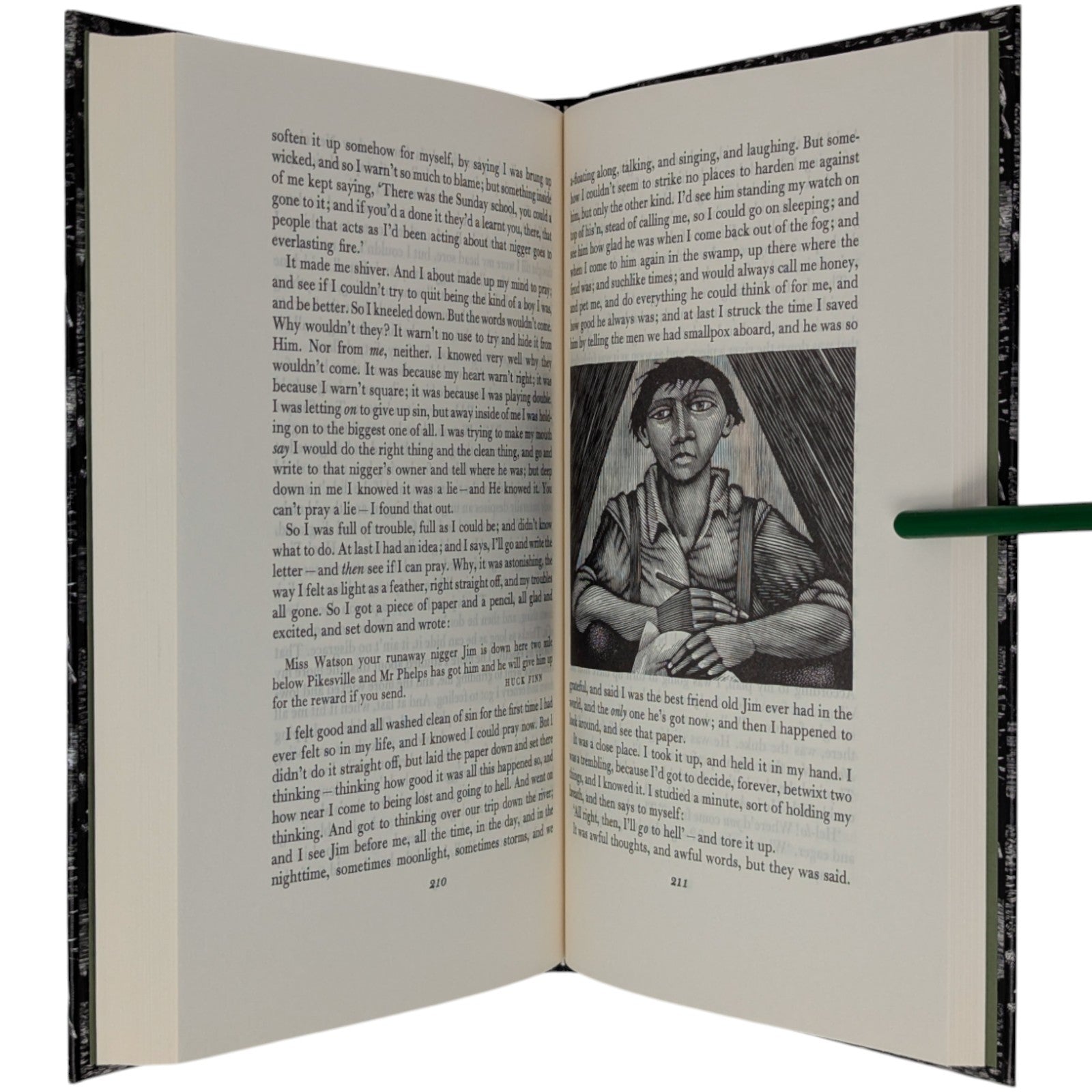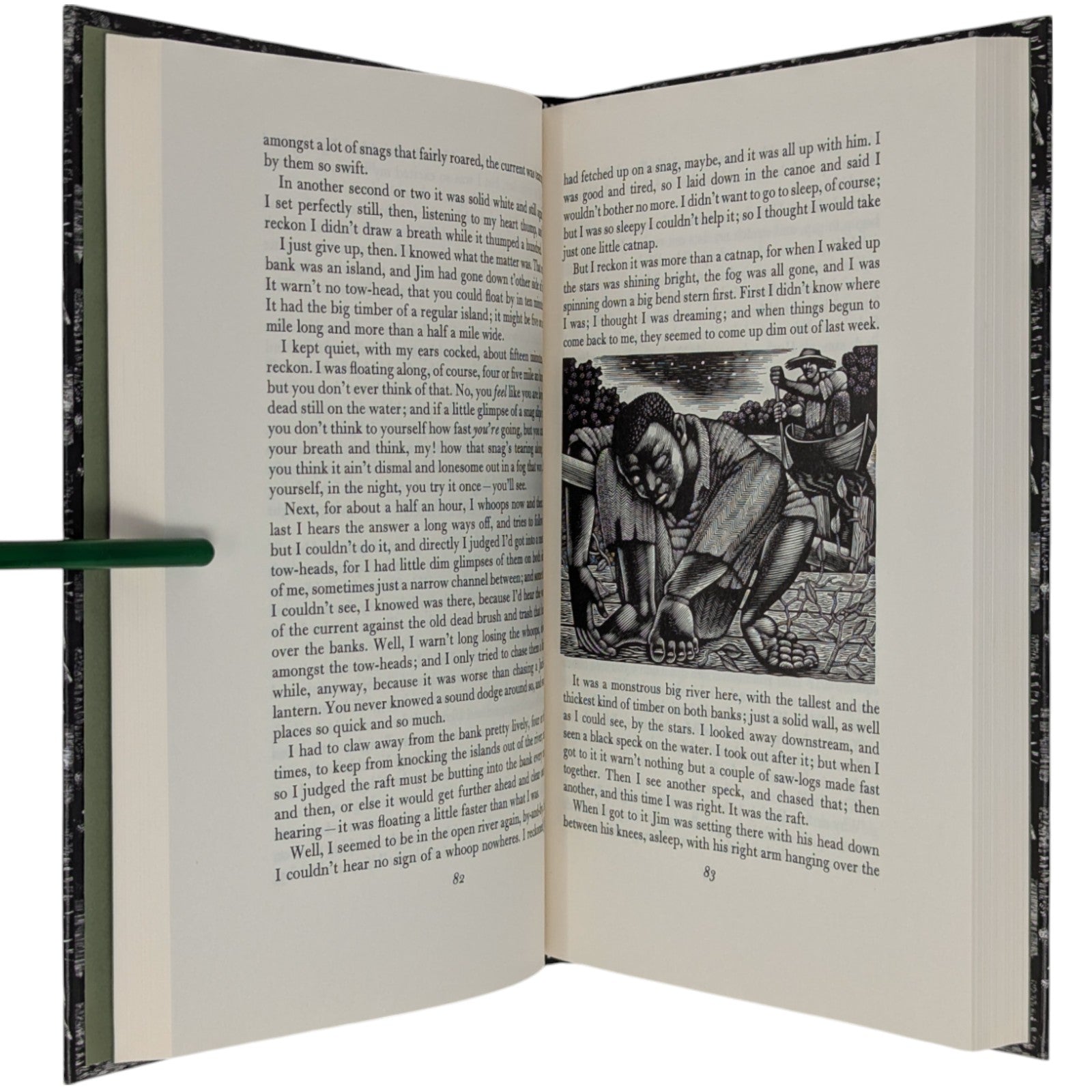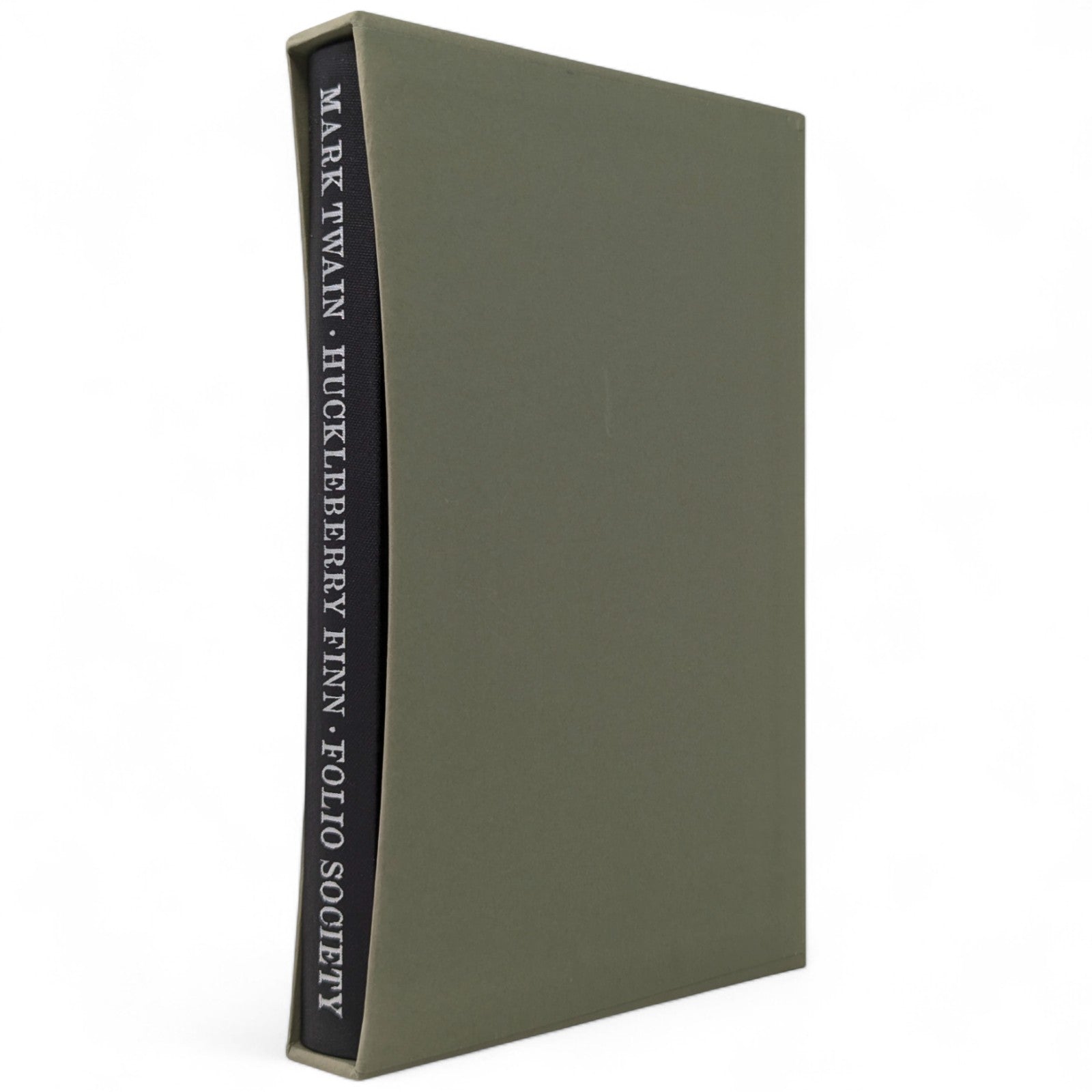 The Adventures of Huckleberry Finn, Mark Twain. London: The Folio Society, 1993. Sixth Printing 2004. Introduction by Colin Ward, wood engravings by Harry Brockway. 228 × 149 × 25 mm. Pp. [i–iv] v–xv [xvi], 1–288. Type: Bulmer with Victoria Condensed for display. Typeset by Gloucester Typesetting, printed and bound by the Bath Press. Quarter black cloth, white paper boards with a repeat pattern in black by Brockway; green-grey endleaves. Green-grey slip case. There are 16 wood-engravings printed in the text, one being used on the title-page. This was one of the most successful books of the period, with the typography, binding and illustrations in harmony.