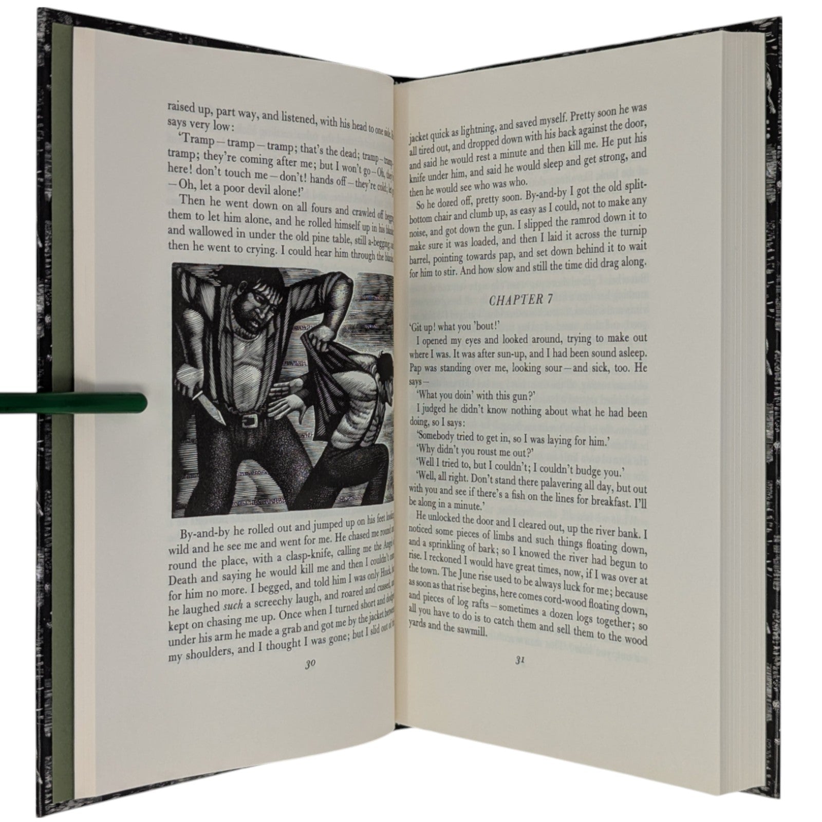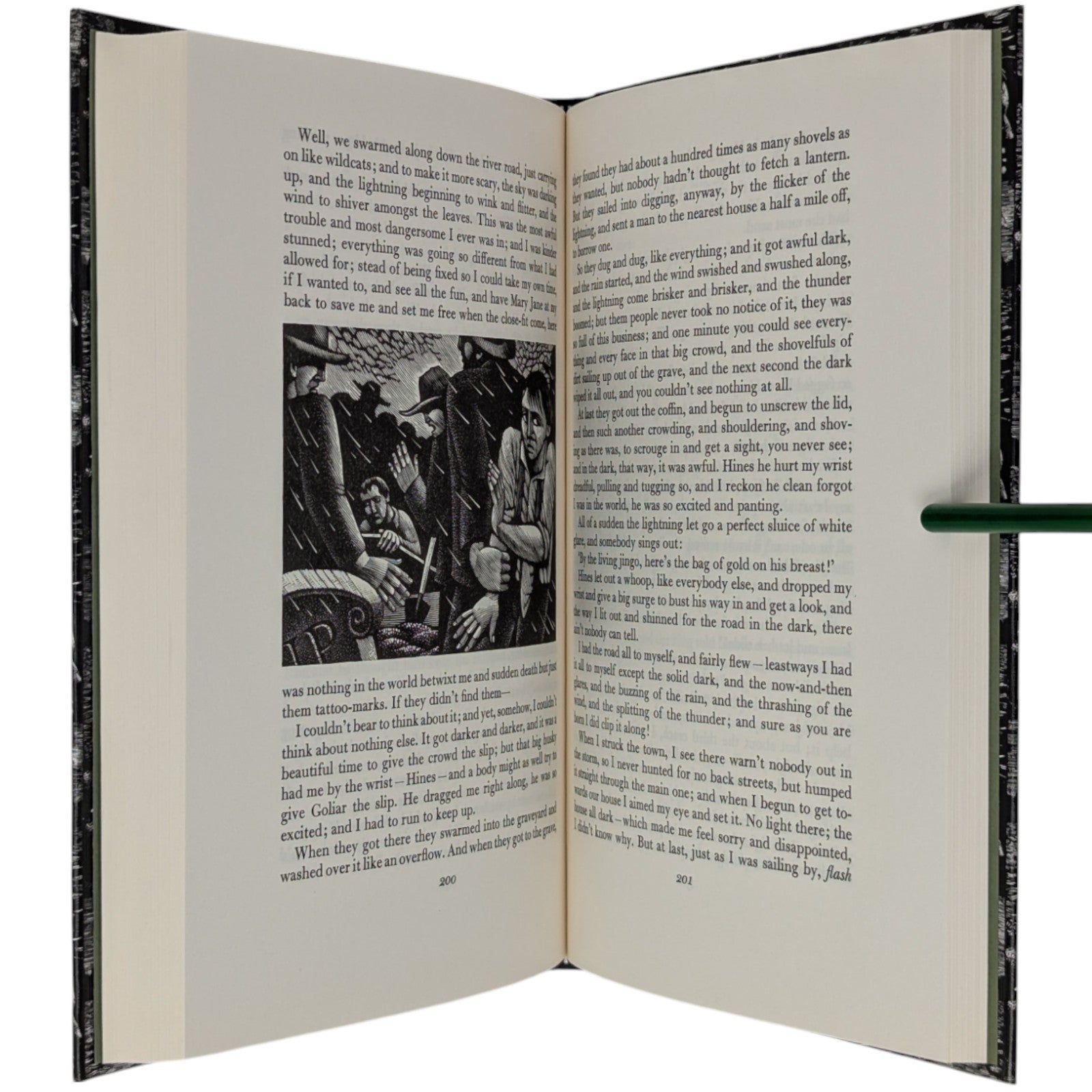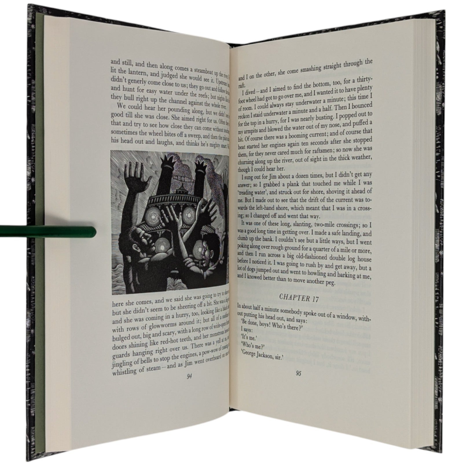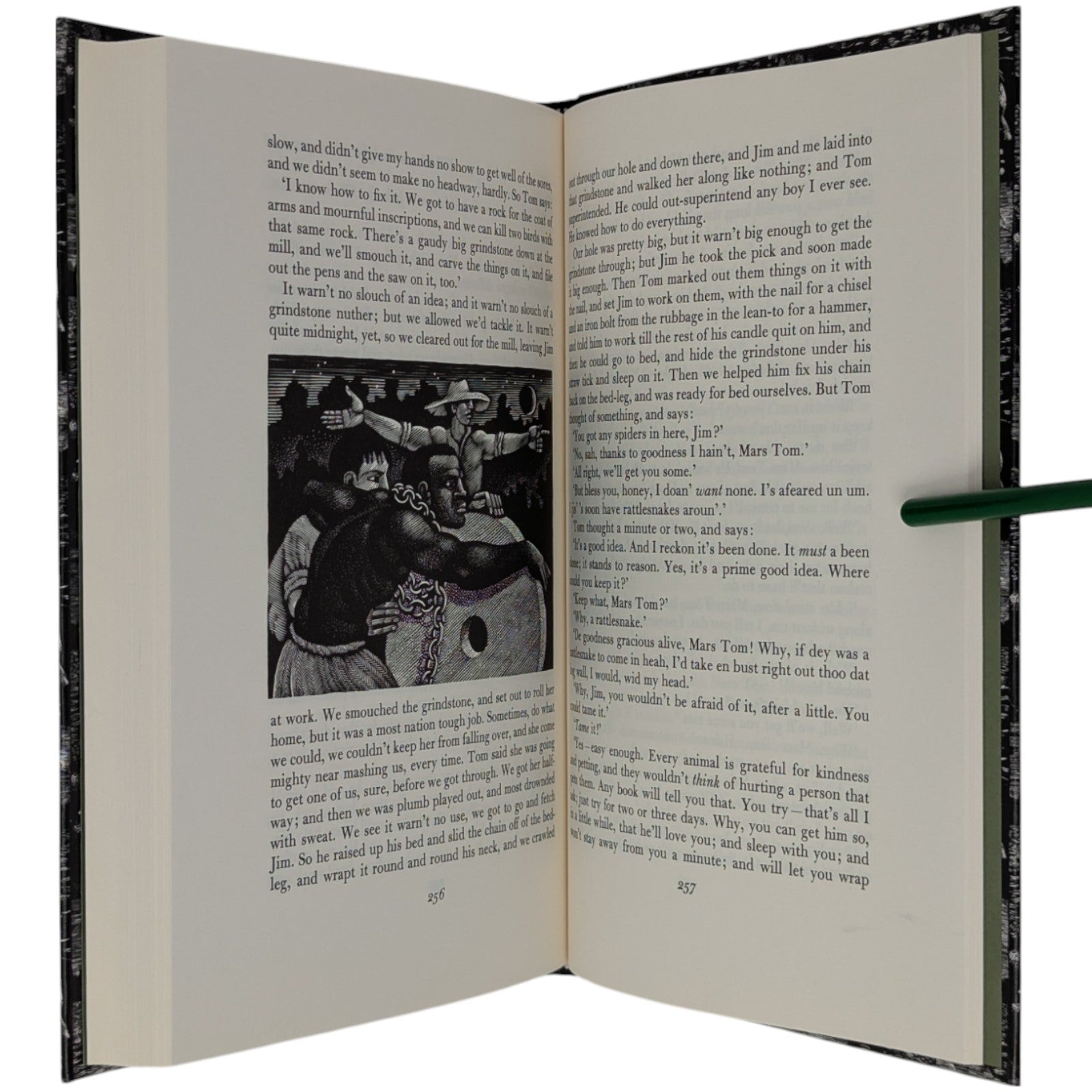The Adventures of Huckleberry Finn, Mark Twain. London: The Folio Society, 1993. Sixth Printing 2004. Introduction by Colin Ward, wood engravings by Harry Brockway. 228 × 149 × 25 mm. Pp. [i–iv] v–xv [xvi], 1–288. Type: Bulmer with Victoria Condensed for display. Typeset by Gloucester Typesetting, printed and bound by the Bath Press. Quarter black cloth, white paper boards with a repeat pattern in black by Brockway; green-grey endleaves. Green-grey slip case. There are 16 wood-engravings printed in the text, one being used on the title-page. This was one of the most successful books of the period, with the typography, binding and illustrations in harmony.