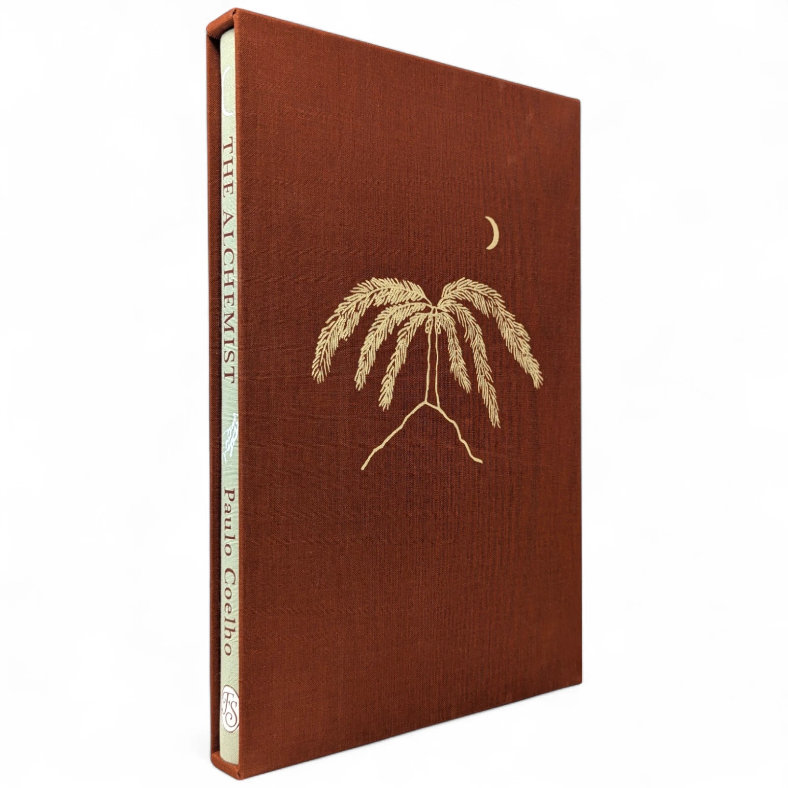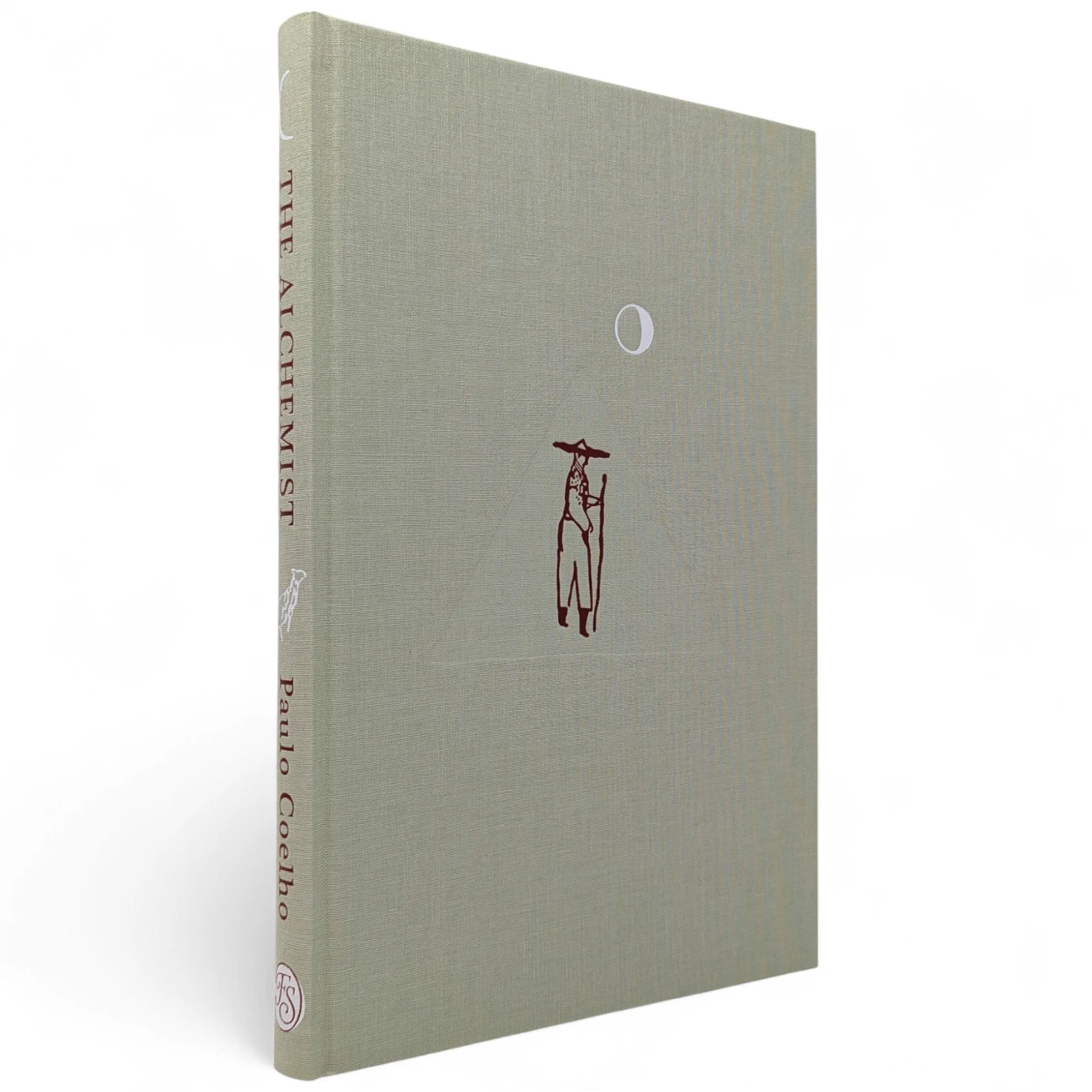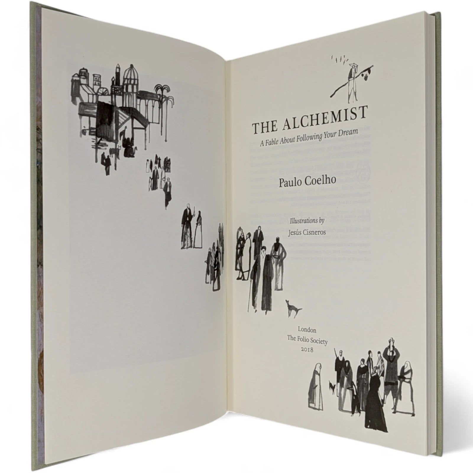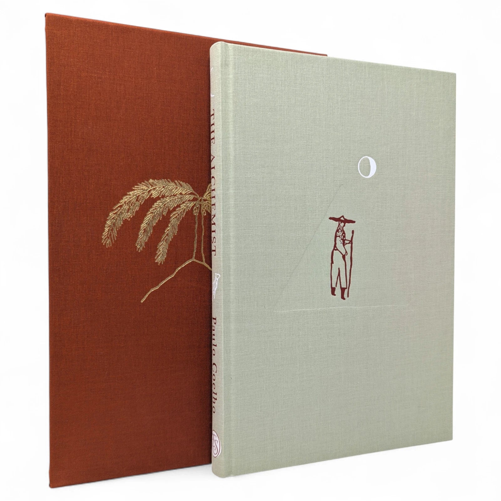 The Alchemist, A Fable About Following Your Dream, by Paulo Coelho. London: The Folio Society, 2018. First printing thus. Illustrations by Jesús Cisneros. 278 × 186 × 19 mm. Pp. [i–iv] v–ix [x], [1–2] 3–123 [124]: [21] leaves of colour plates. Type: Adriane Text. Printed and bound by Kösel in full pale green cloth blocked in red and white with a design by Cisneros. Printed endleaves. Dark orange slip case blocked in gold. Cisneros also provided the illustrations for the endleaves, and black and white drawings in the text.