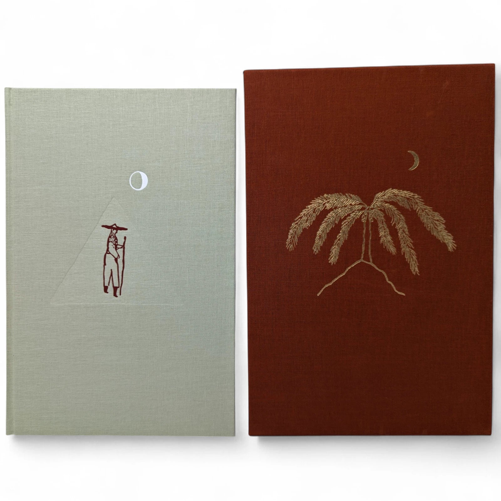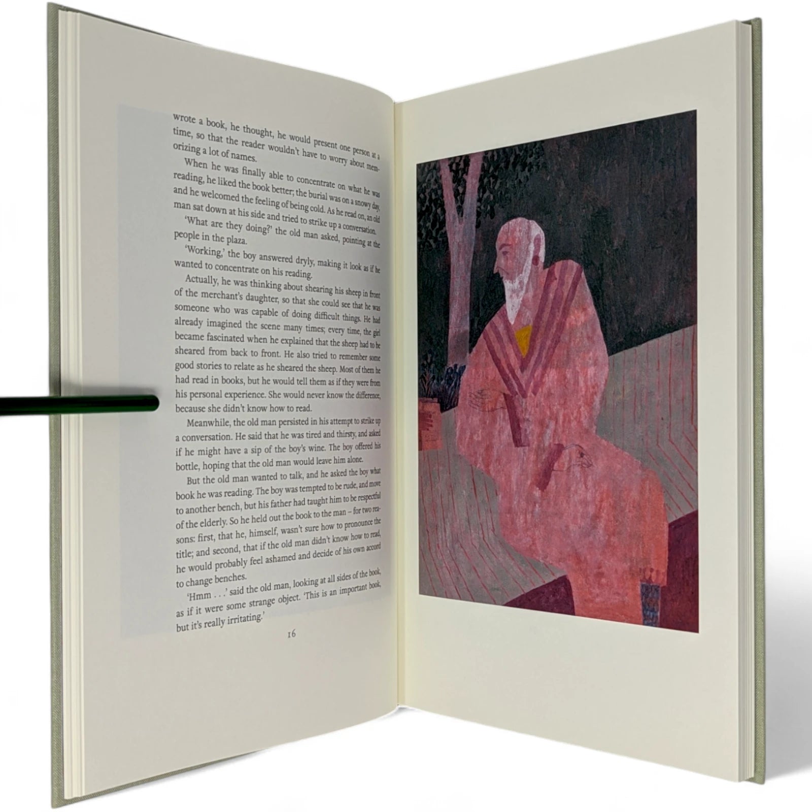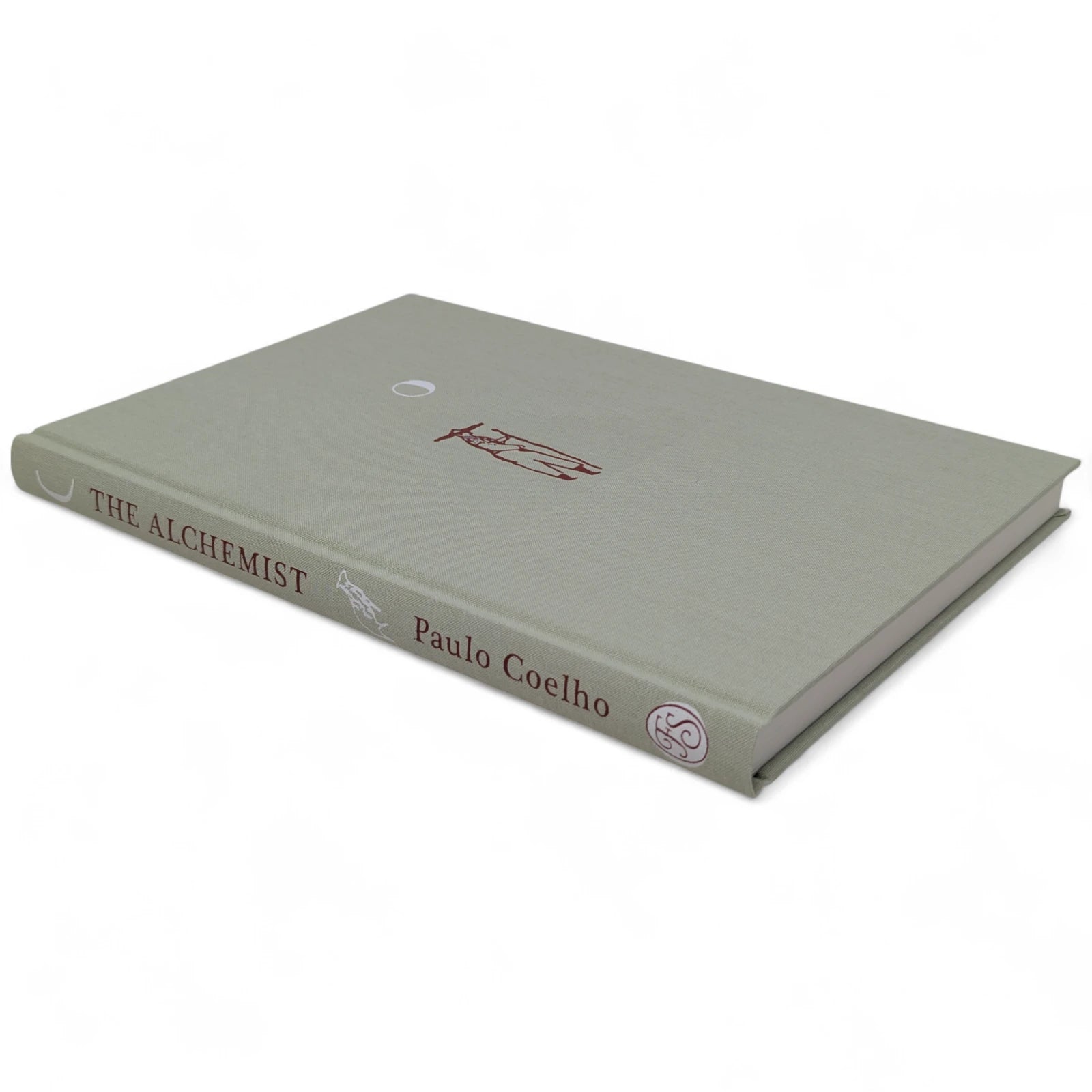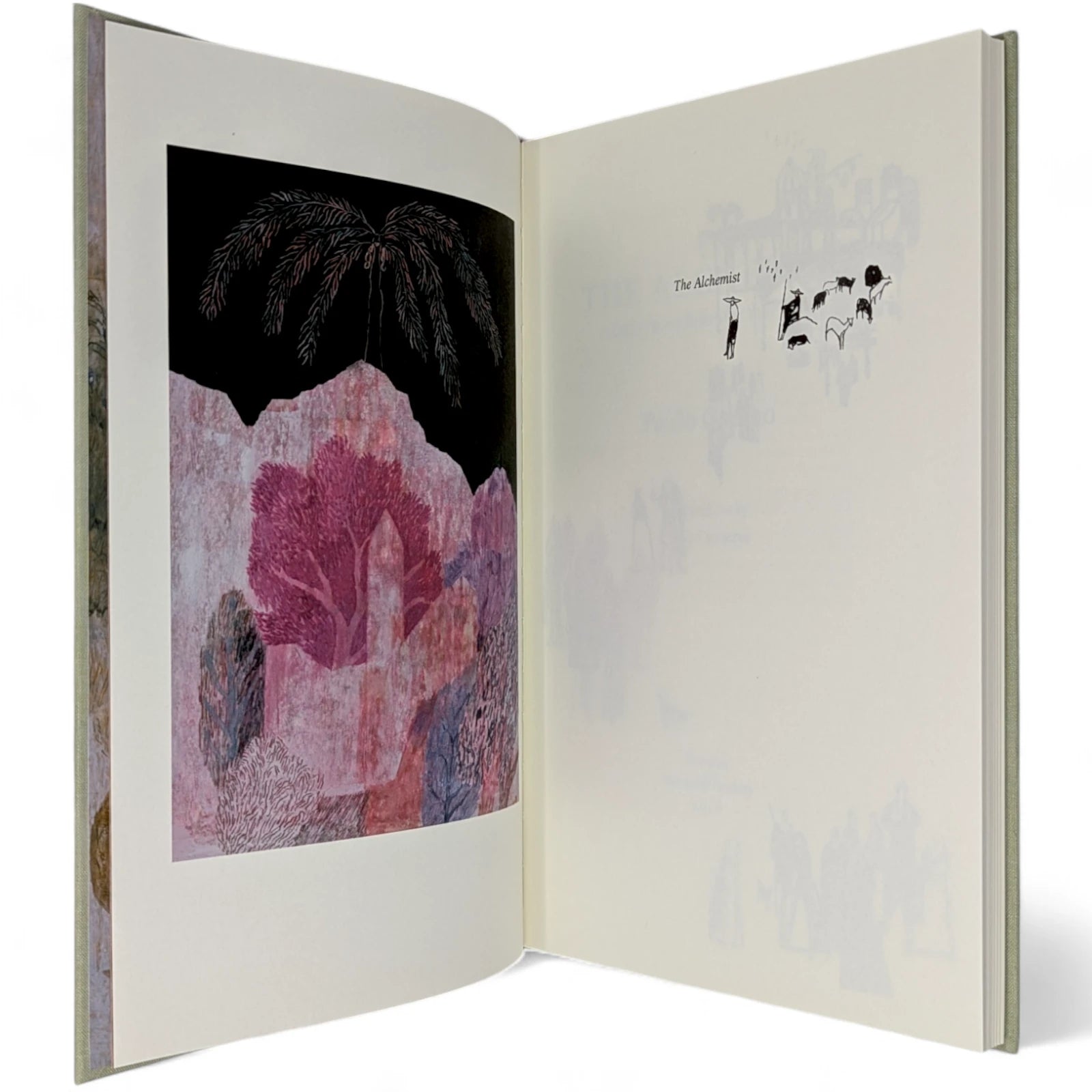 The Alchemist, A Fable About Following Your Dream, by Paulo Coelho. London: The Folio Society, 2018. First printing thus. Illustrations by Jesús Cisneros. 278 × 186 × 19 mm. Pp. [i–iv] v–ix [x], [1–2] 3–123 [124]: [21] leaves of colour plates. Type: Adriane Text. Printed and bound by Kösel in full pale green cloth blocked in red and white with a design by Cisneros. Printed endleaves. Dark orange slip case blocked in gold. Cisneros also provided the illustrations for the endleaves, and black and white drawings in the text.