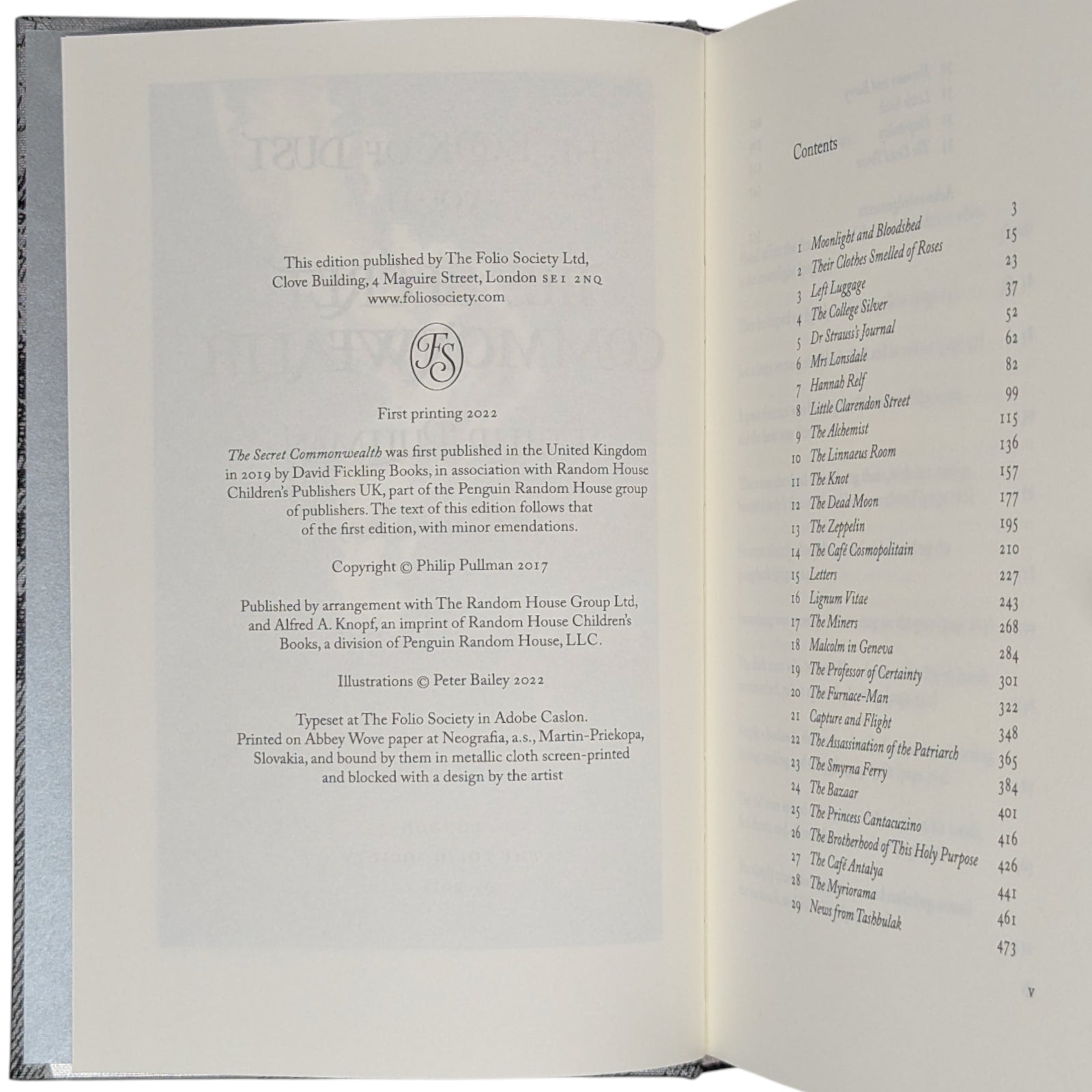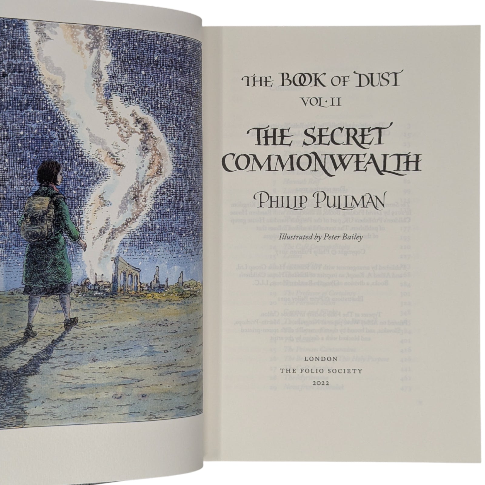 The Book of Dust, vol. II, The Secret Commonwealth, Philip Pullman. London: The Folio Society, [2022]. First printing thus. Illustrated by Peter Bailey. 241 x 166 x 46 mm. Pp. [i–iv] v–vii [viii–xiv], [1–2] 3–557 [558–562]: [11] leaves of colour plates (facing pp. [iii], 18, 58, 130, 186, 218, 290, 338, 387, 467 and 530). Type: Caslon. Printed and bound by Neografia in full cloth printed and blocked with design by Bailey; silver endleaves. Black slip case decorated on one side with titling design printed in silver.