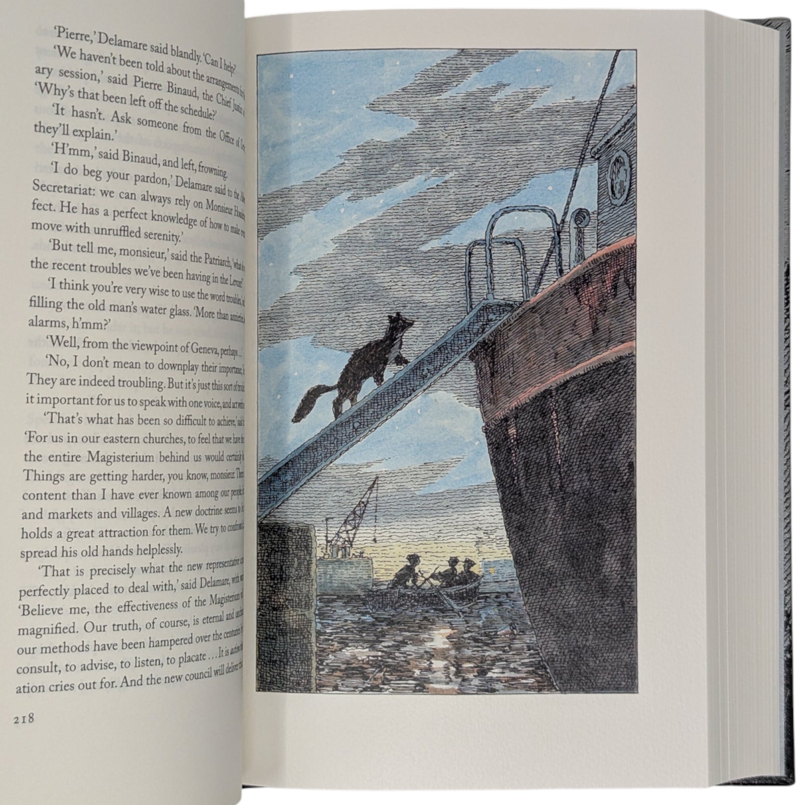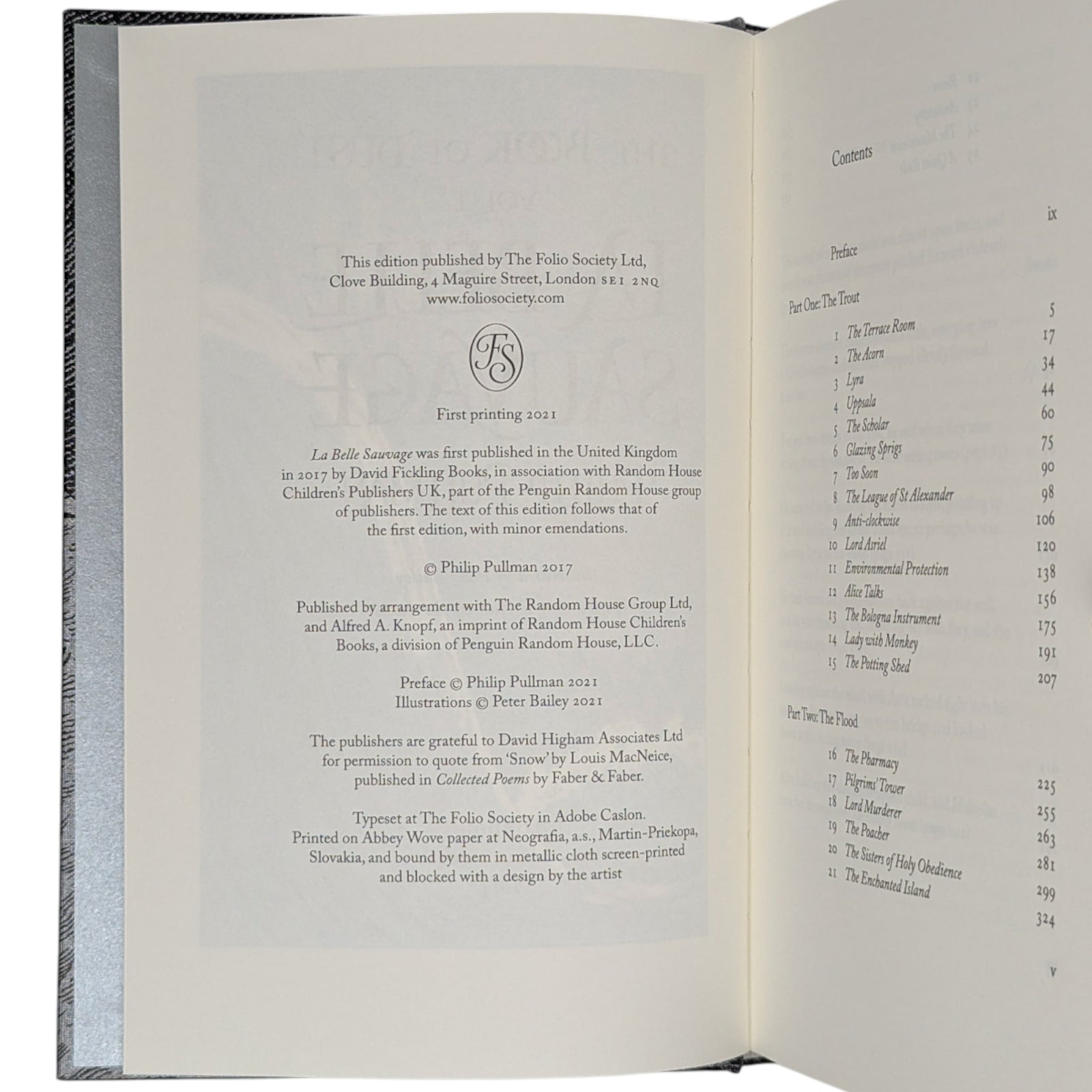 The Book of Dust, vol. I, La Belle Sauvage, Philip Pullman. London: The Folio Society, [2021]. First printing thus. Illustrated by Peter Bailey, with a new preface by the author. 241 × 163 × 36 mm. Pp. [i–iv] v–xii [xiii–xvi], [1–4] 5–405 [406–408]: [11] leaves of colour plates (facing pp. [iii], 56, 88, 136, 169, 216, 241, 288, 313, 361 and 376). Type: Caslon. Printed and bound by Neo grafia in full cloth printed and blocked with design by Bailey; silver endleaves. Black slip case decorated on one side with titling design printed in silver.