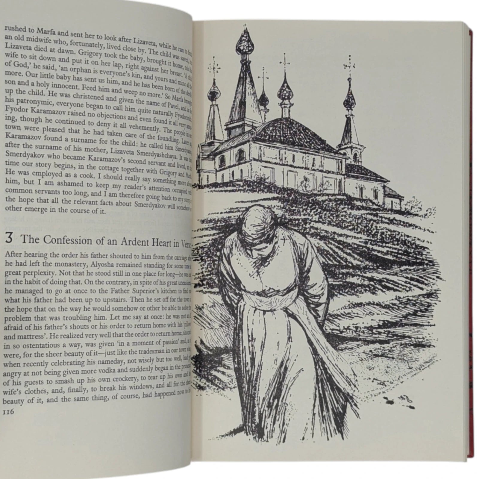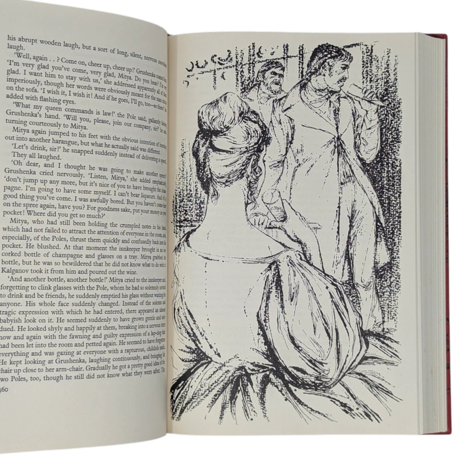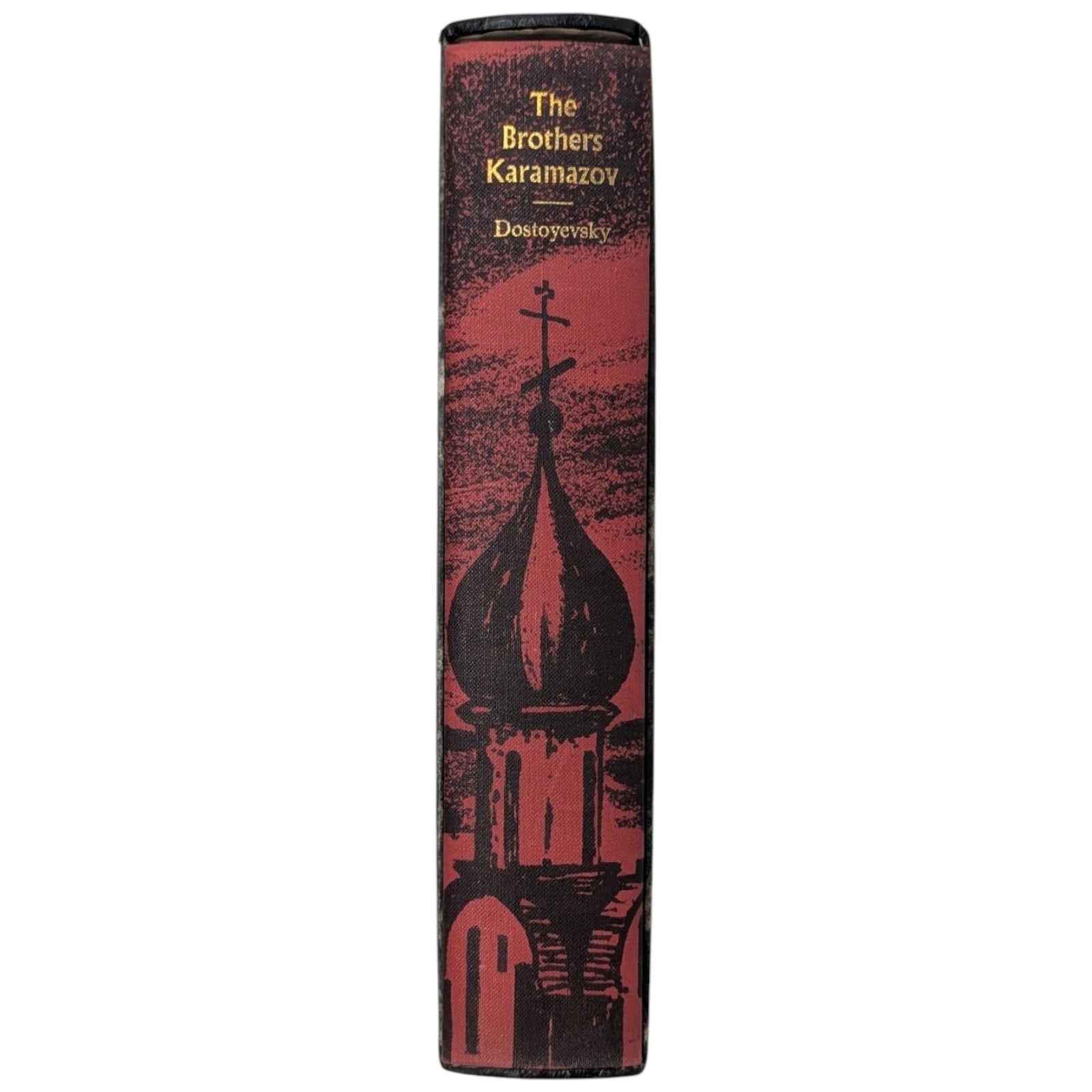 Fyodor Dostoyevsky, The Brothers Karamazov. London: The Folio Society, [1964]. First printing thus. Translated by David Magarshack, drawings by Nigel Lambourne. 227 × 151 × 42 mm. Pp. [1–4] 5–845 [846–848]. Type: Plantin with Albertus for display. Printed by Richard Clay. Bound by Mackay in full red linen with an illustrative design in black by Lambourne; grey-blue end leaves. Mottled grey and black slip case. The illustrations consist of 24 full-page drawings, including the frontispiece, printed from line-blocks.