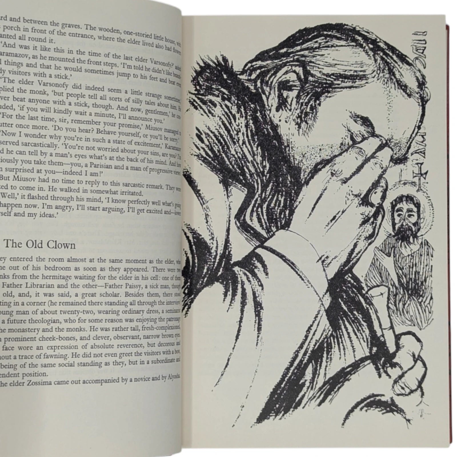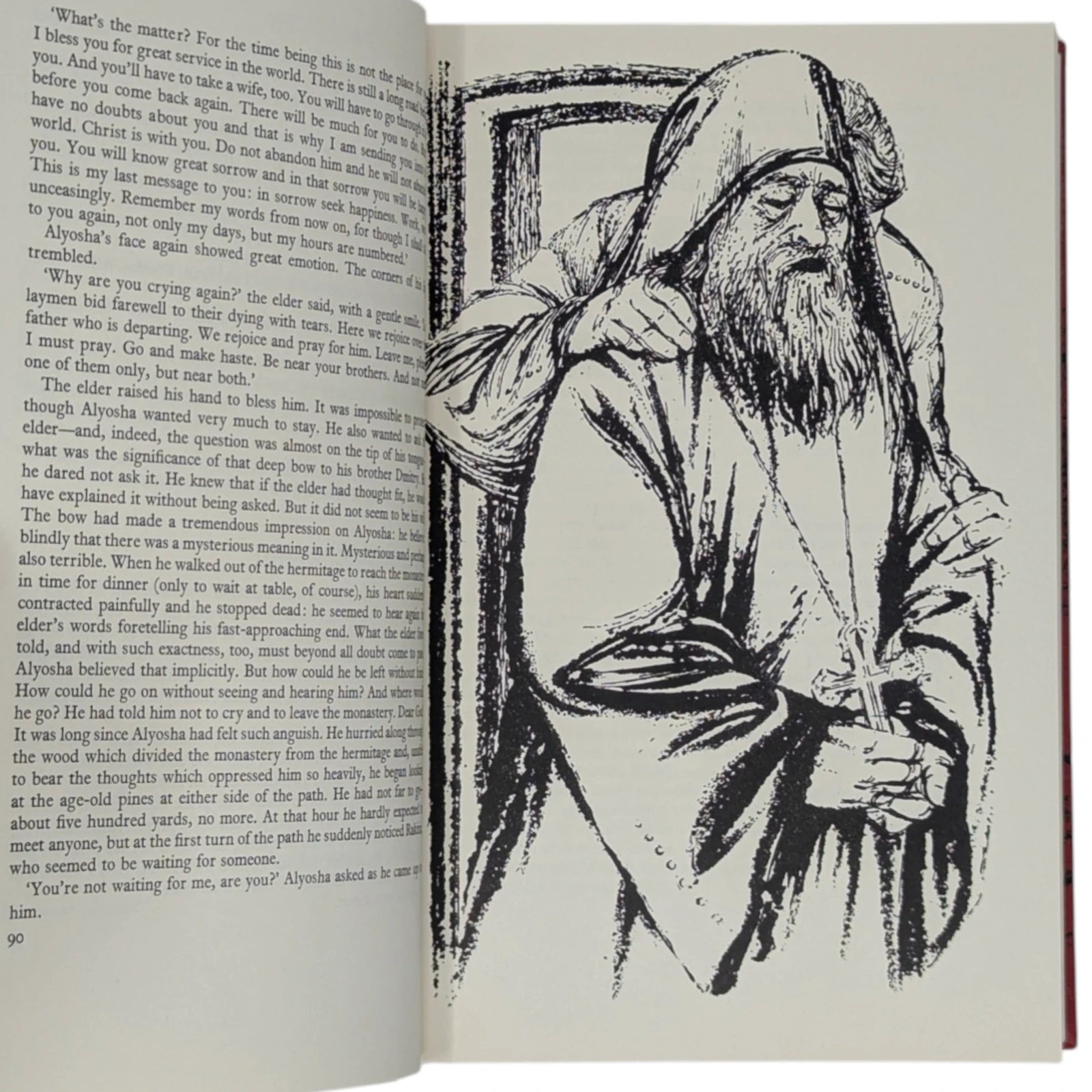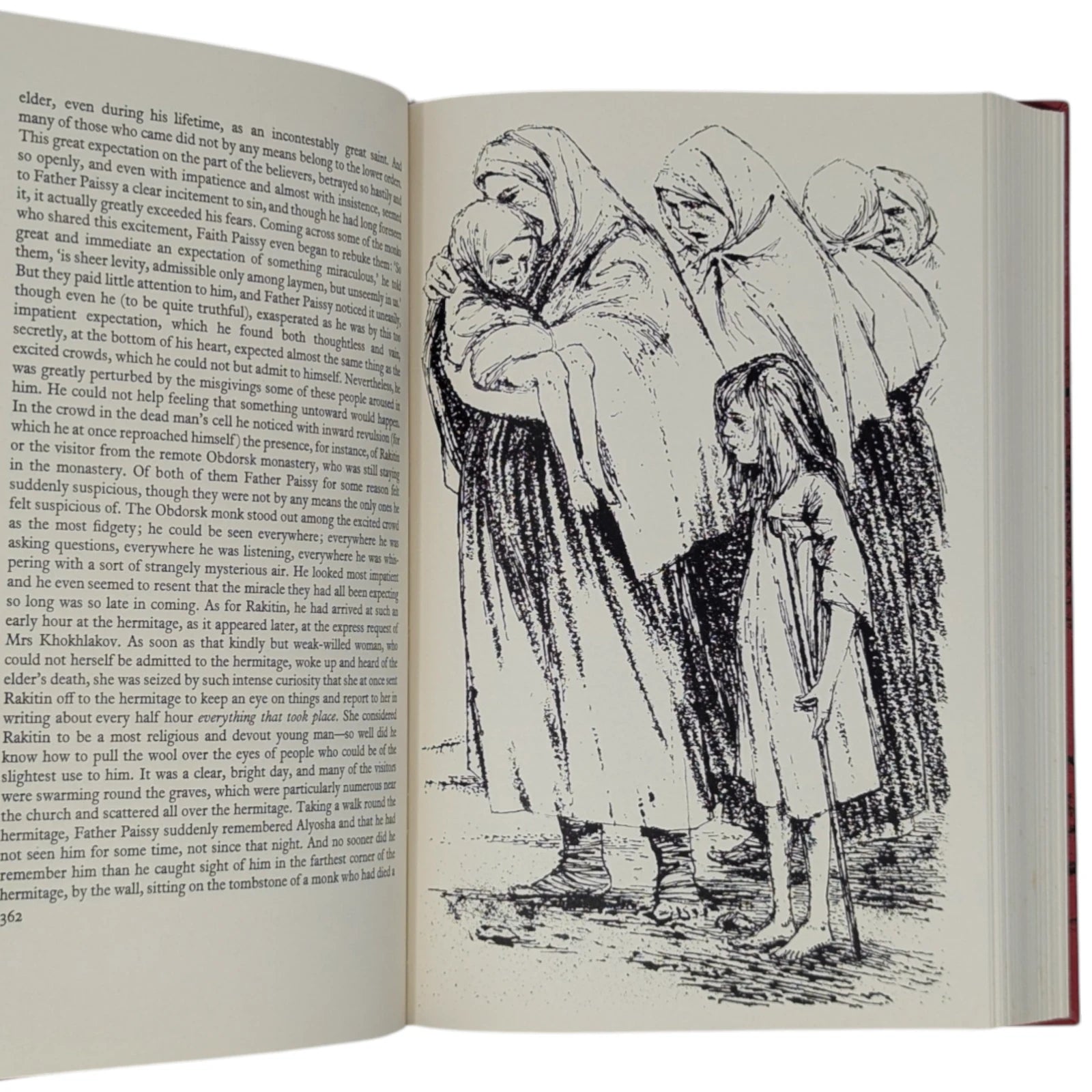 Fyodor Dostoyevsky, The Brothers Karamazov. London: The Folio Society, [1964]. First printing thus. Translated by David Magarshack, drawings by Nigel Lambourne. 227 × 151 × 42 mm. Pp. [1–4] 5–845 [846–848]. Type: Plantin with Albertus for display. Printed by Richard Clay. Bound by Mackay in full red linen with an illustrative design in black by Lambourne; grey-blue end leaves. Mottled grey and black slip case. The illustrations consist of 24 full-page drawings, including the frontispiece, printed from line-blocks.