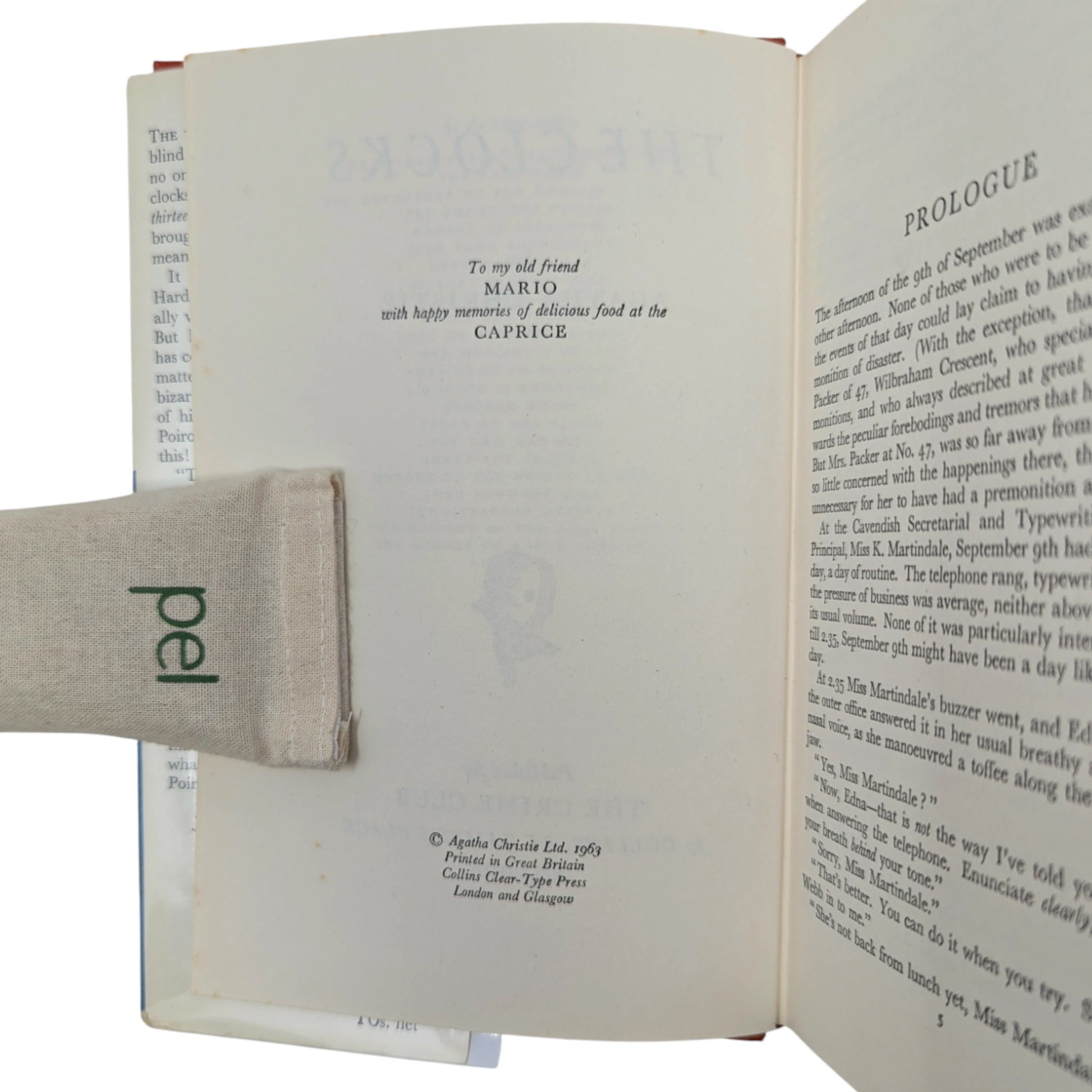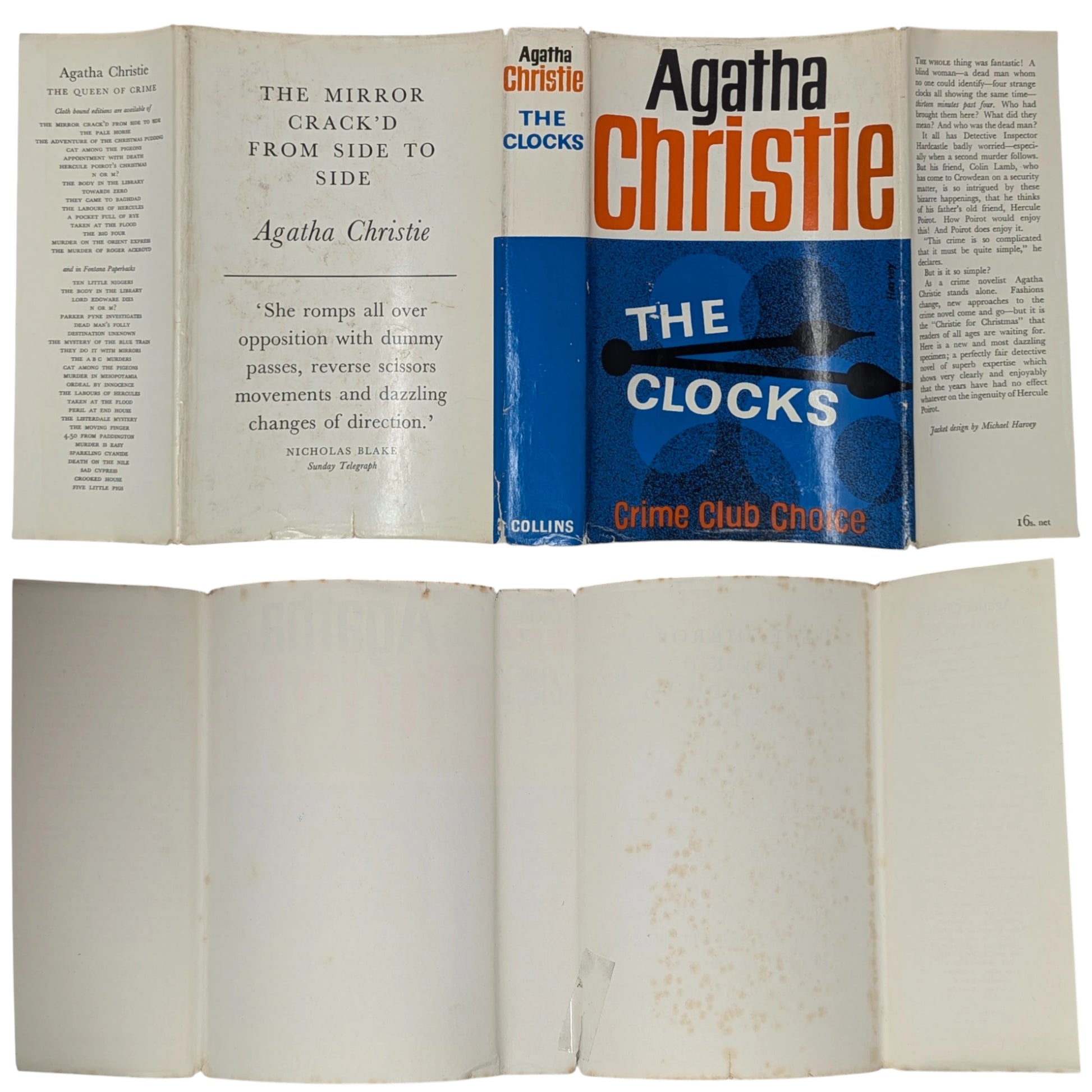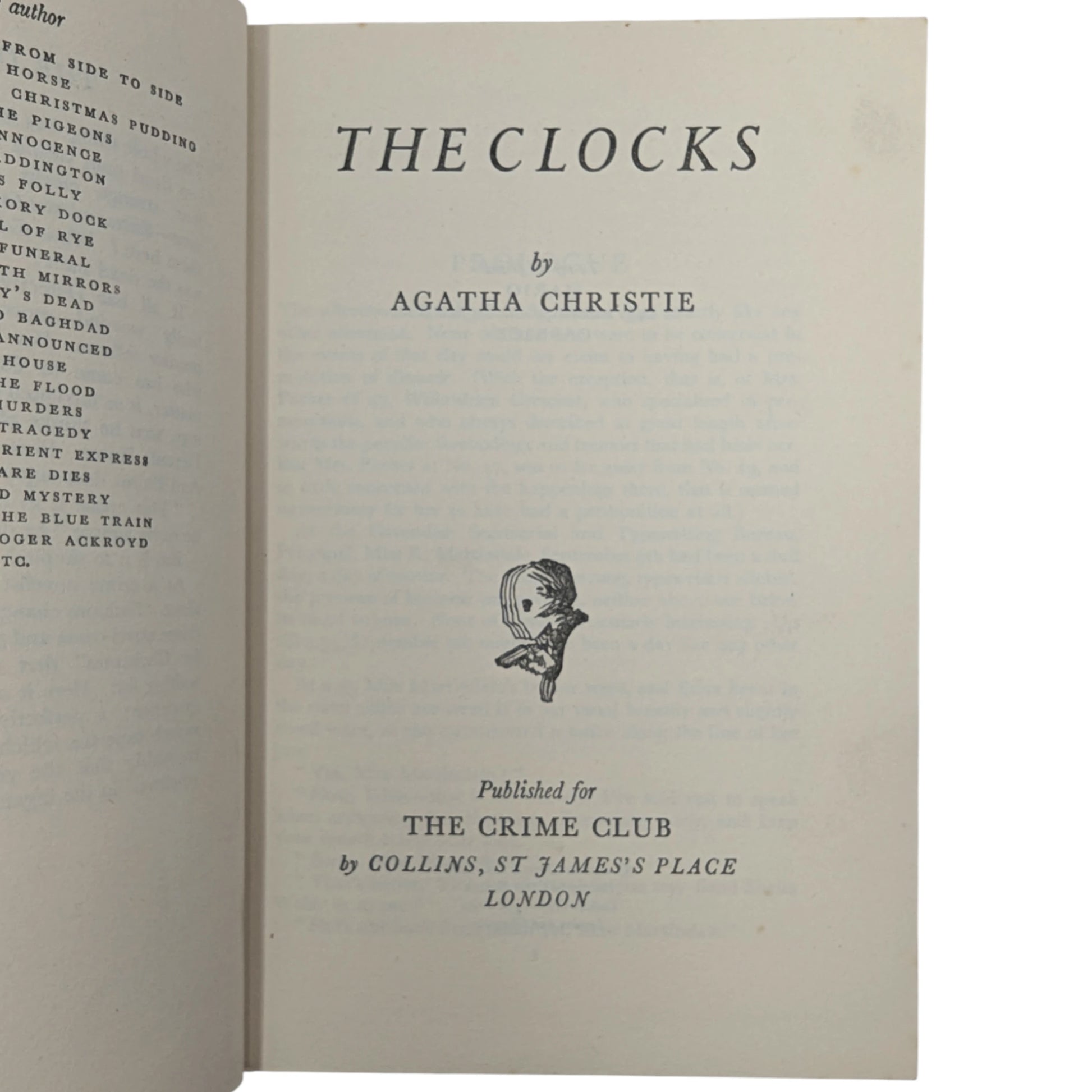 The Clocks, by Agatha Christie. London: The Crime Club by Collins, 1963. First edition, first impression. Sized 19 x 12.5cm. Pp. 256. Publisher's original cloth binding with black lettering to spine. With original, unclipped (16s. net) dust wrapper.