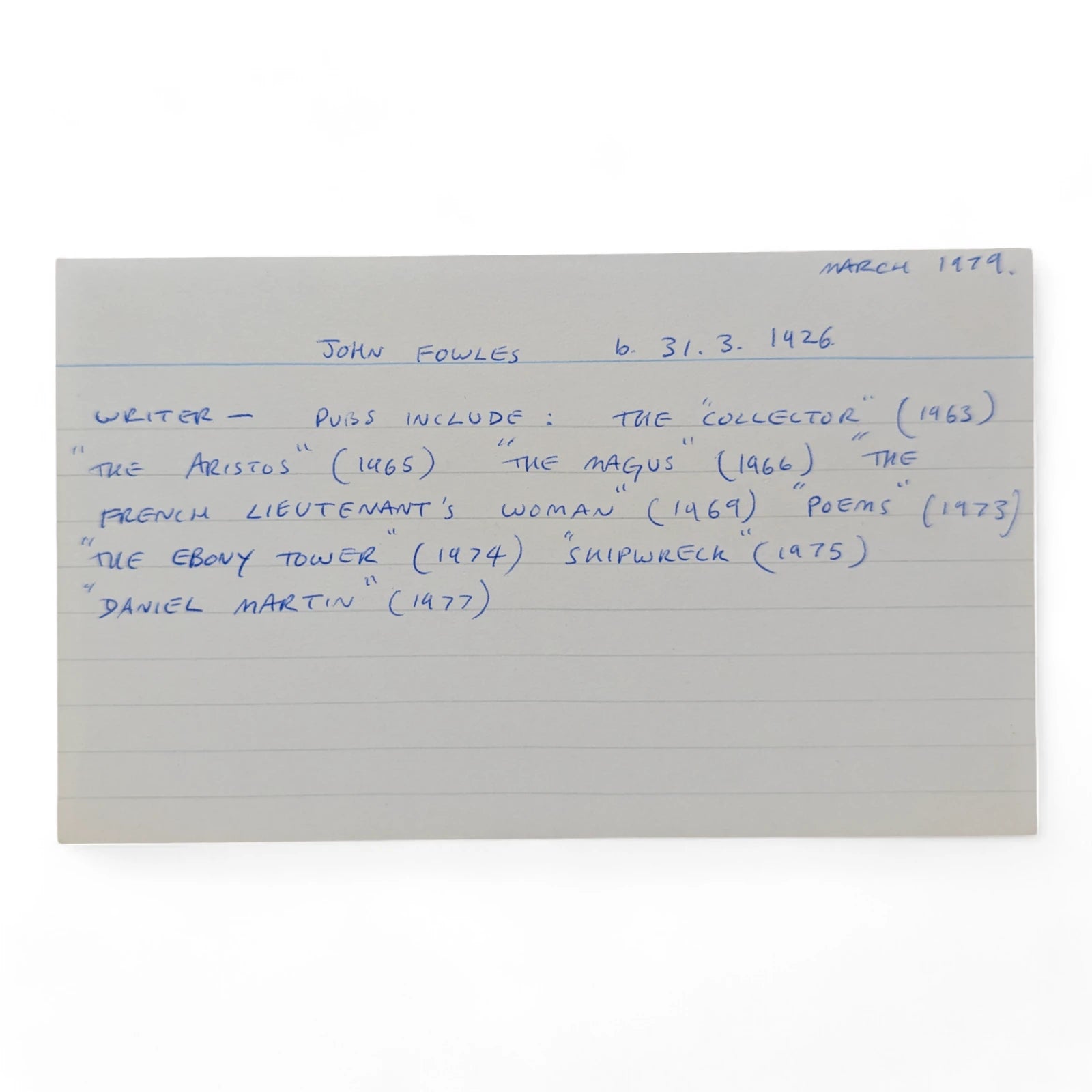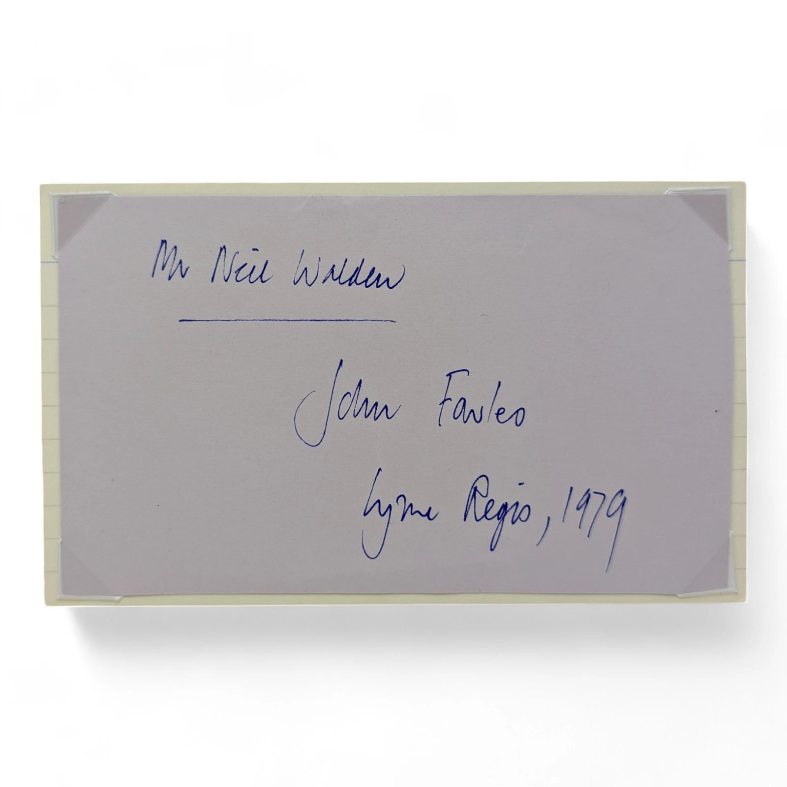 Loosely inserted card signed by author John Fowles, dedicated to Neil Walden, and dated 1979 in Lyme Regis. John Fowles had moved to Lyme Regis in October 1965 and helped to make the town and its geological setting world-famous through the success of The French Lieutenant’s Woman (published in 1969) and the film made from it. Having had a keen interest in Lyme and its history, Fowles was Curator of the Lyme Regis Museum for ten years, and afterwards its archivist. On the verso of the card is a handwritten description by the previous owner of John Fowles' biographical details. This card came as part of a large collection of letters, photographs and cards signed by prominent authors and playwriters, amassed in the 1970s and 1980s by collector Neil Walden.