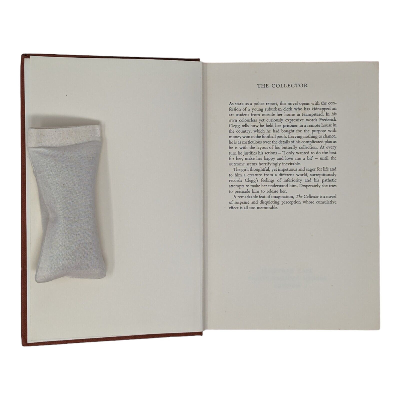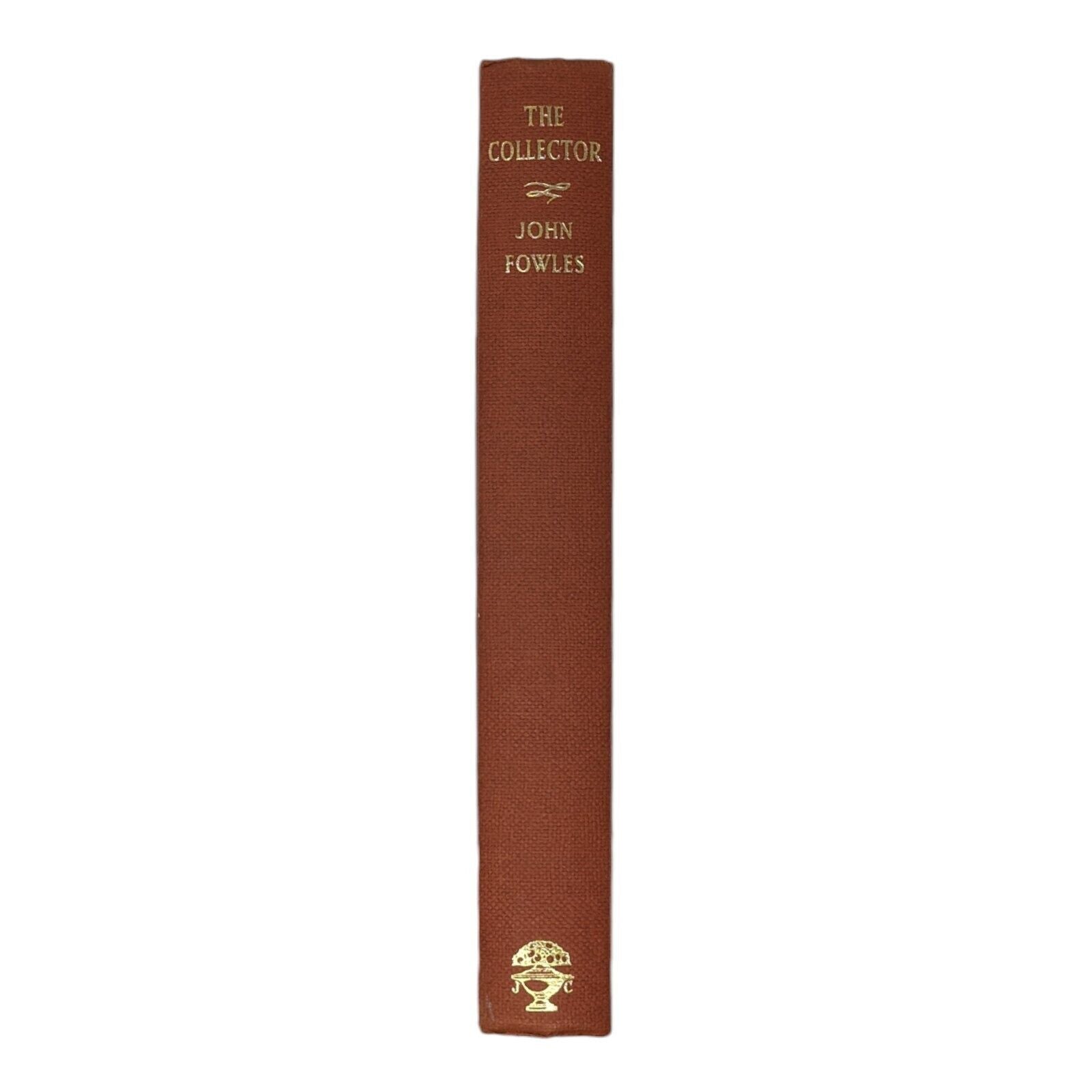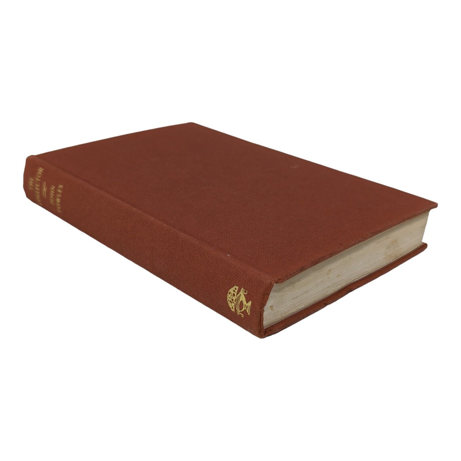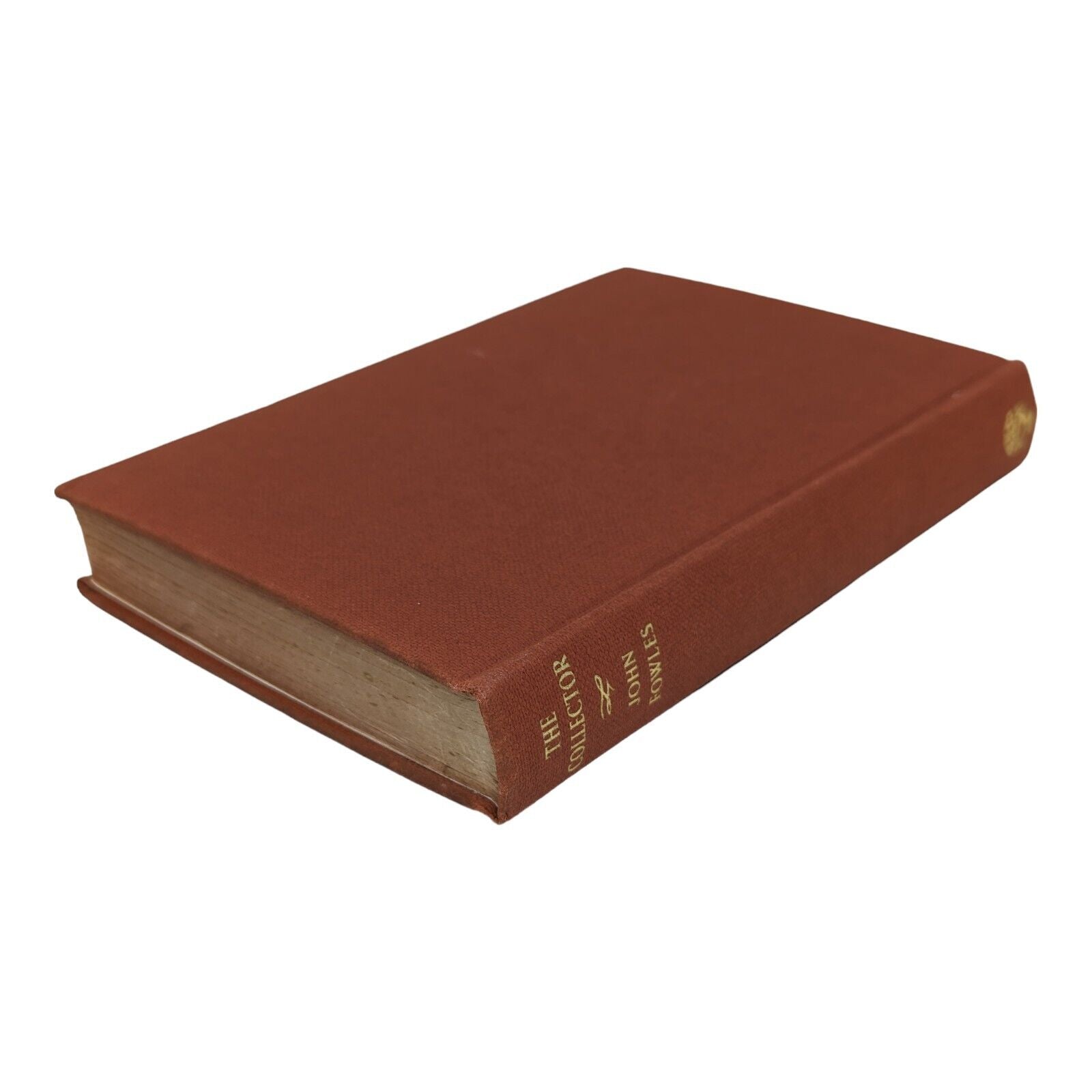 The Collector by John Fowles. London: Jonathan Cape. 1963. First edition, first impression. Sized 19.5 x 13 cm. Pp. 282. In its original, unclipped dust wrapper in a design by Tom Adams, priced 18s net. Publisher's original red-brick cloth binding with gilt lettering to spine and coloured top stain. Bumps to corners and spine tips, slight lean to text block, foxing to edges with one or two spots to prelims. Some shallow indentations left behind to FFEP after some previous pencil inscription was erased, as well as an ex-library stamp to copyright page. Strong hinges and joints, pages tightly bound and free of any inscriptions with the exception of the aforementioned. In an unclipped dust wrapper with foxing to panels, chipping to extremities, a few small tears and very small areas of loss. Now placed in an archival, protective sleeve (easily removable if desired). A nice, good first edition of John Fowles' landmark first book, with a dust wrapper design that hints darkly at the novel's contents.