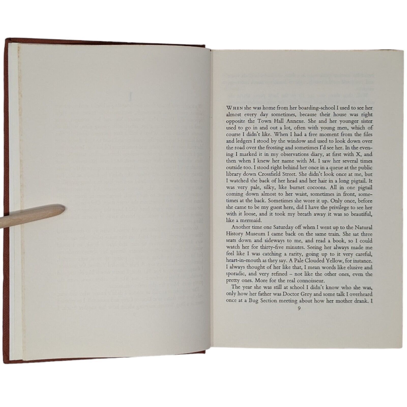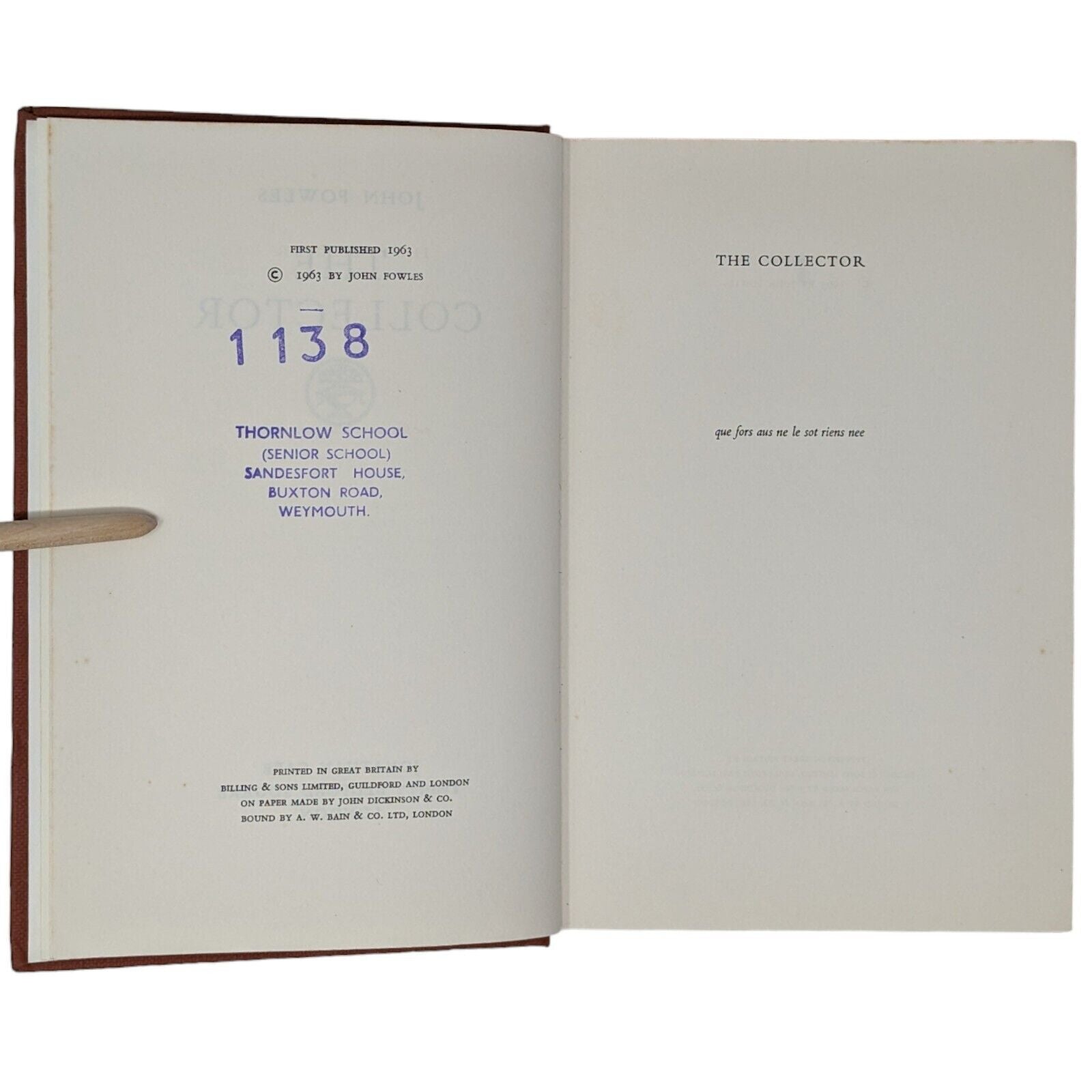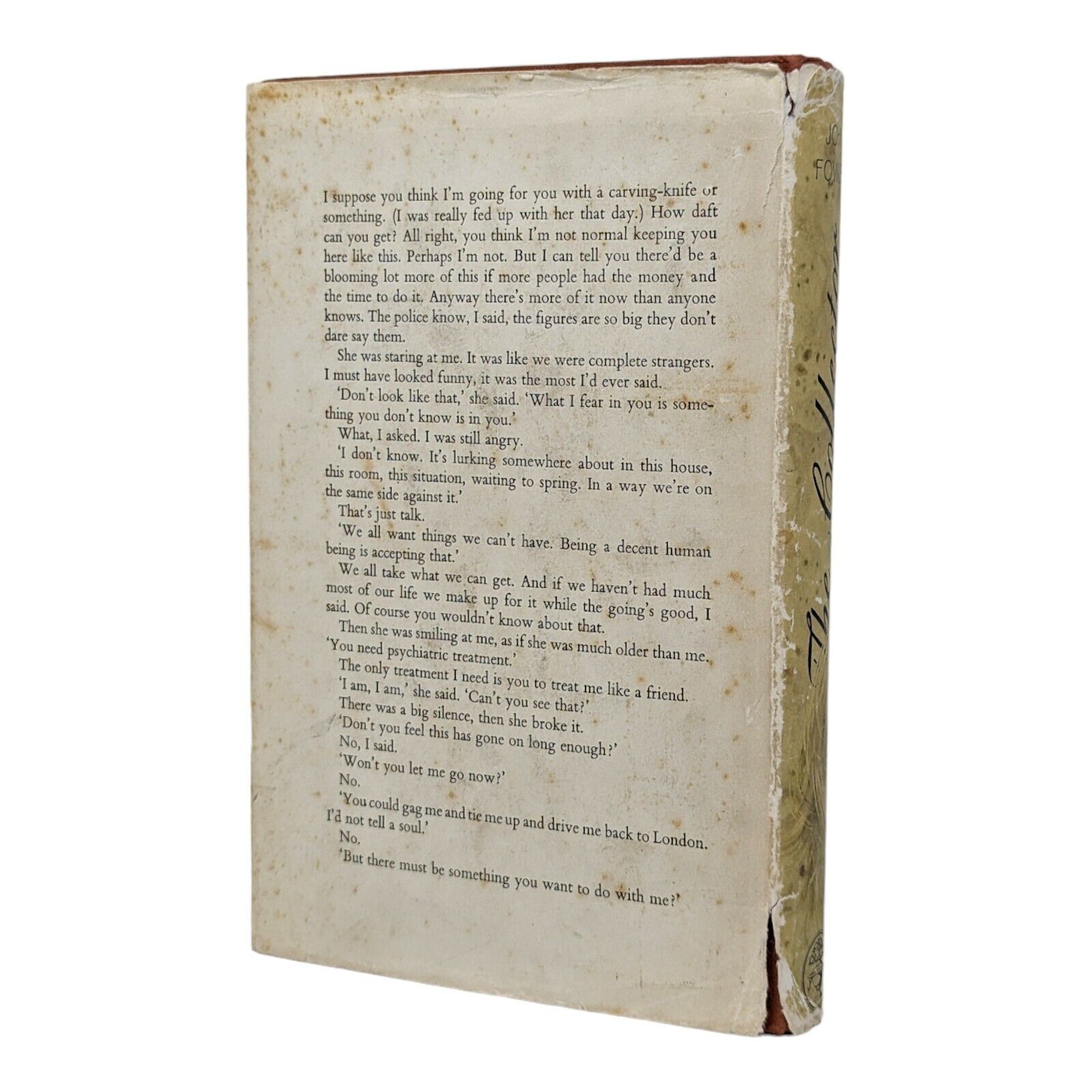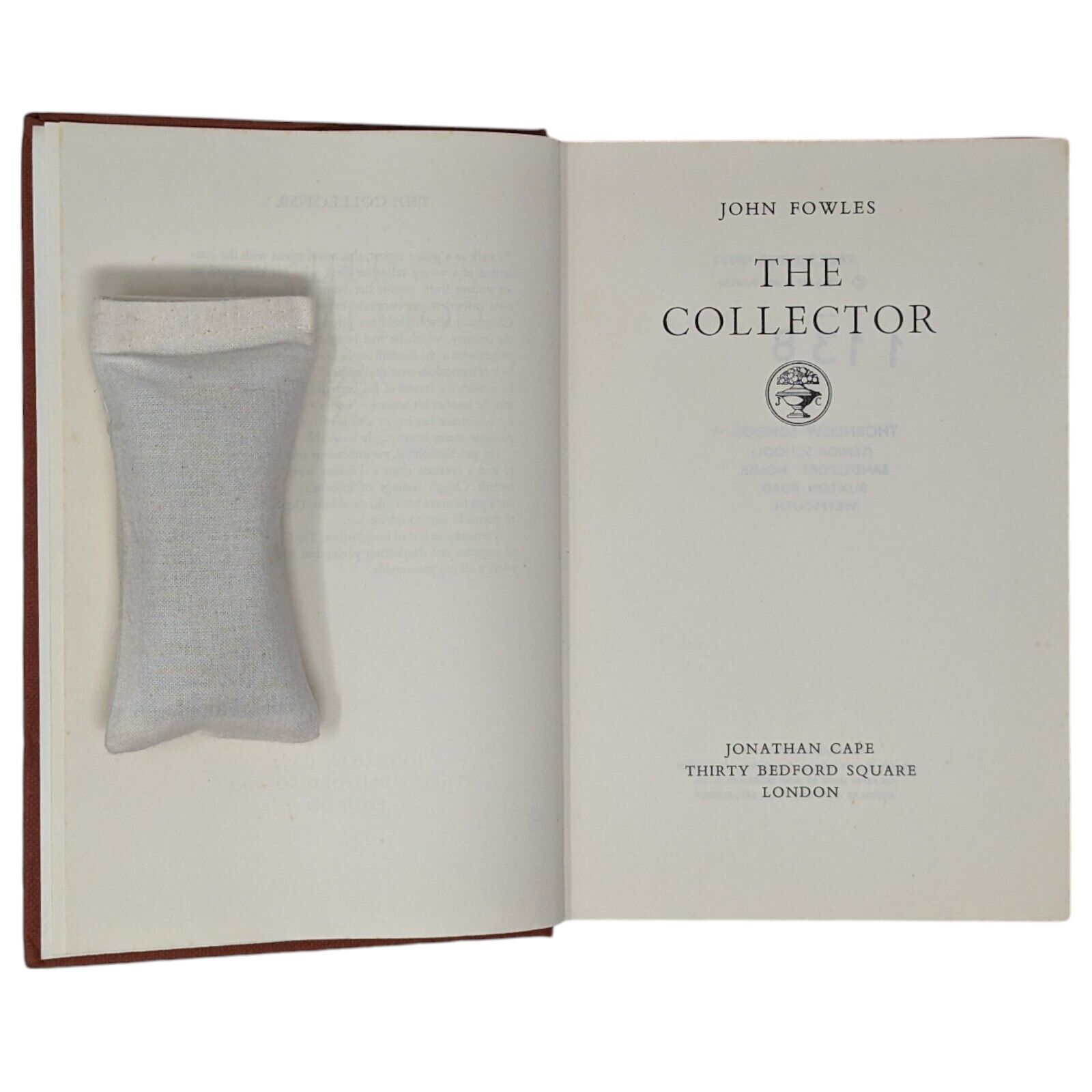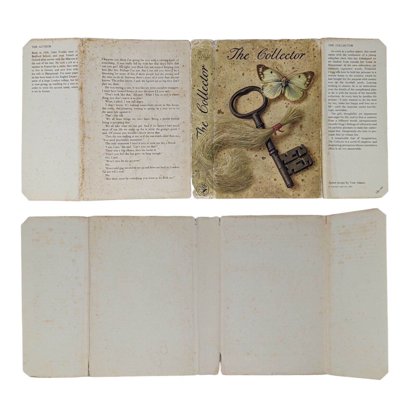 The Collector by John Fowles. London: Jonathan Cape. 1963. First edition, first impression. Sized 19.5 x 13 cm. Pp. 282. In its original, unclipped dust wrapper in a design by Tom Adams, priced 18s net. Publisher's original red-brick cloth binding with gilt lettering to spine and coloured top stain. Bumps to corners and spine tips, slight lean to text block, foxing to edges with one or two spots to prelims. Some shallow indentations left behind to FFEP after some previous pencil inscription was erased, as well as an ex-library stamp to copyright page. Strong hinges and joints, pages tightly bound and free of any inscriptions with the exception of the aforementioned. In an unclipped dust wrapper with foxing to panels, chipping to extremities, a few small tears and very small areas of loss. Now placed in an archival, protective sleeve (easily removable if desired). A nice, good first edition of John Fowles' landmark first book, with a dust wrapper design that hints darkly at the novel's contents.