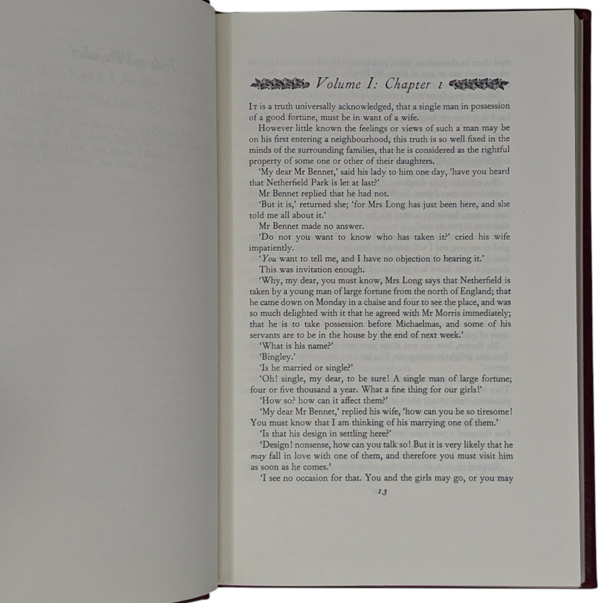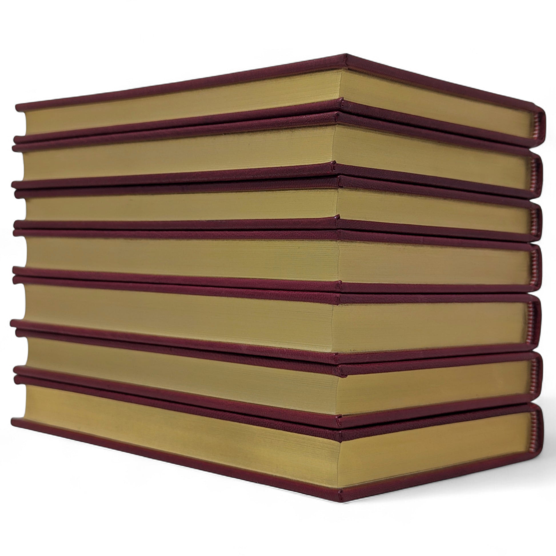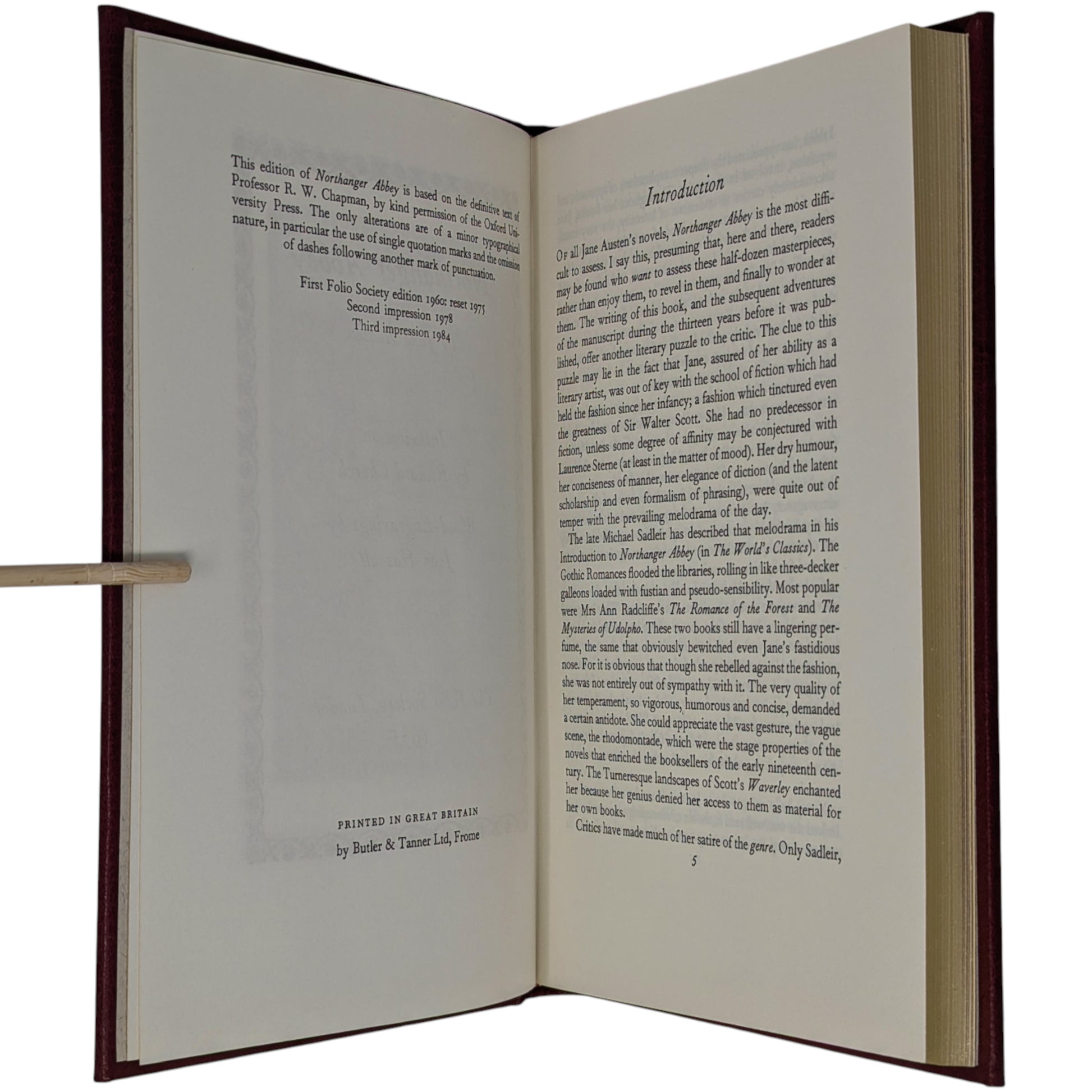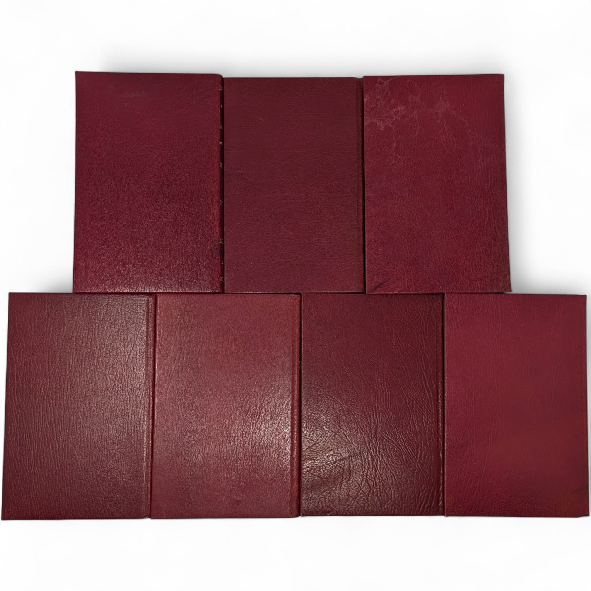 AUSTEN, Jane. The Complete Works. London: The Folio Society, 1975. Third impression thus, 1984, one of the Limited Edition, unnumbered copies offered in an alternative binding of full dark-red morocco, with gilt edges, mottled grey endpapers, and a dark red cloth-covered seven-volume slipcase. The exact limitation for this Special 1984 Binding remains unknown, but it is an edition that is much scarcer on the secondary market than the later, much-more-common special edition bound in blue-green leather and published in 1996.