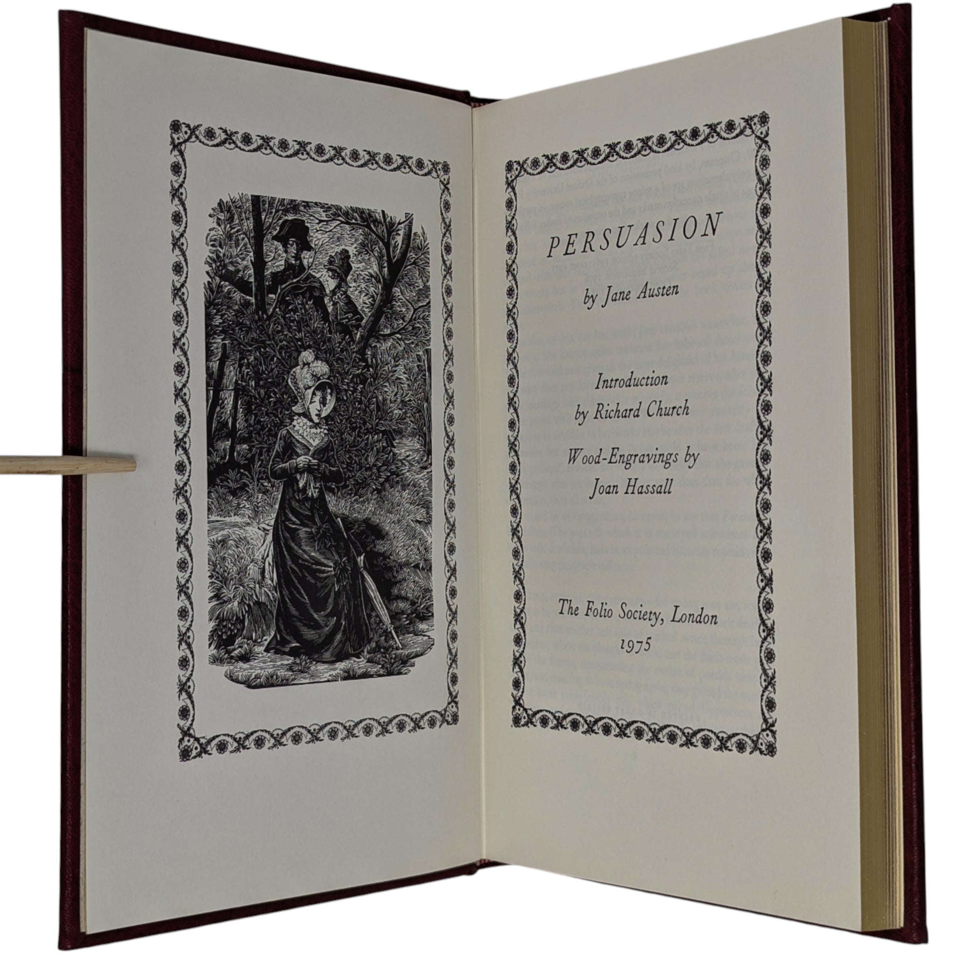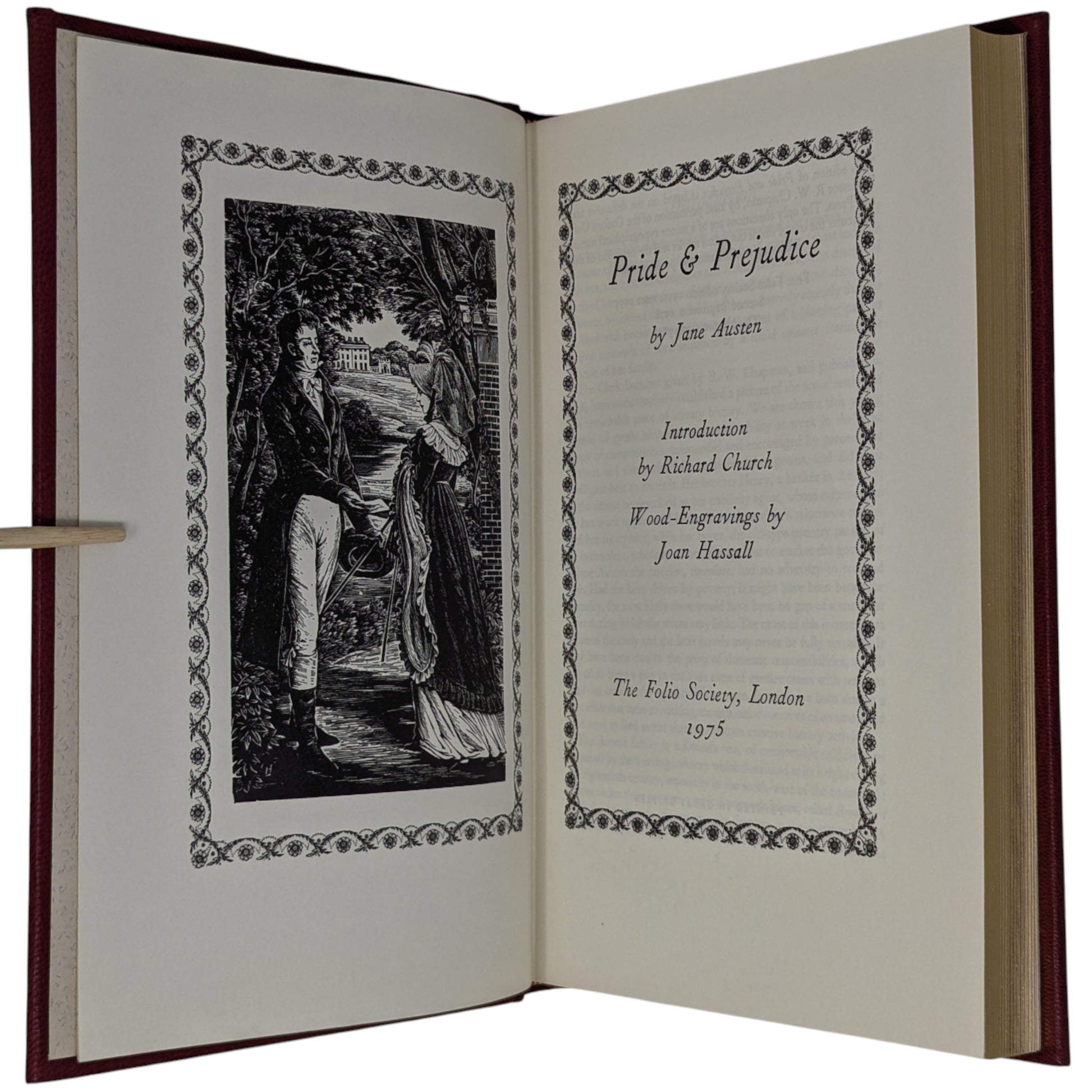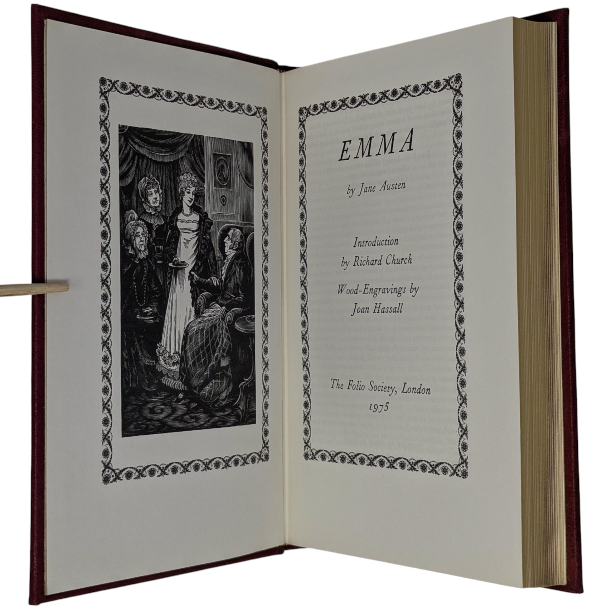 228 × 147 × 22 mm. Printed and bound by Butler and Tanner. The text used throughout is that of the Oxford University Press series edited by R. W. Chapman, with some minor typographical alterations. Each volume has an introduction by Richard Church and more than 70 wood-engravings by Joan Hassall. The seven volumes are as follows: