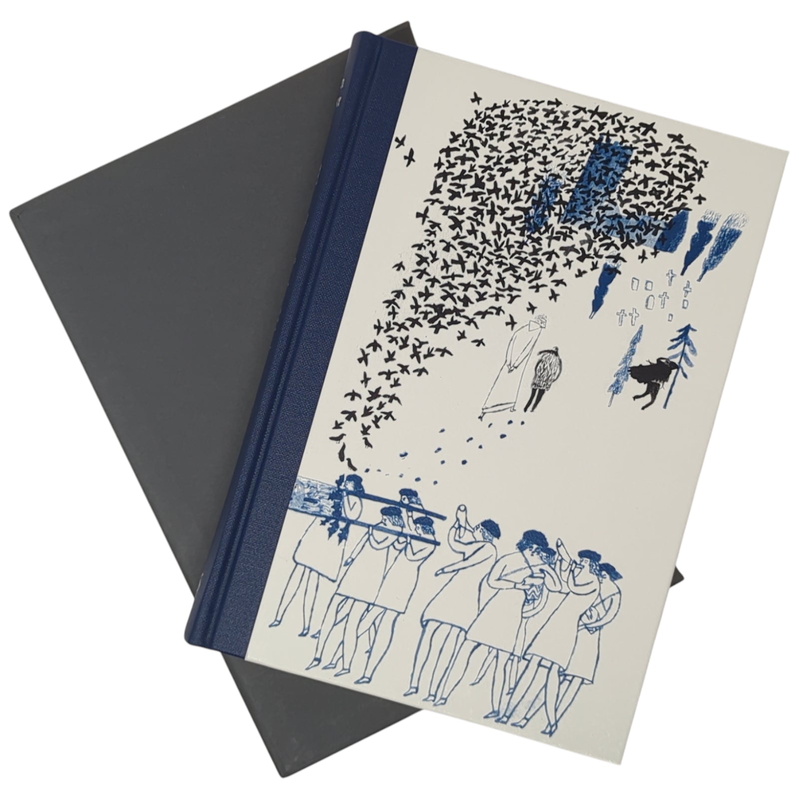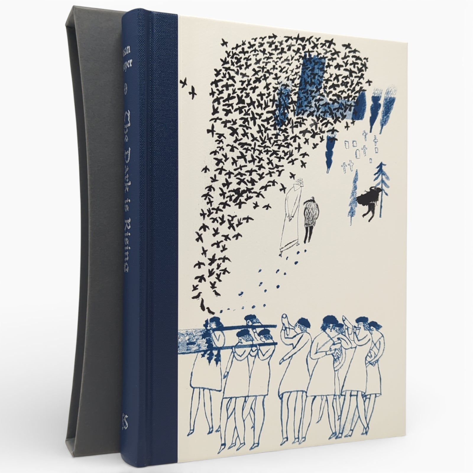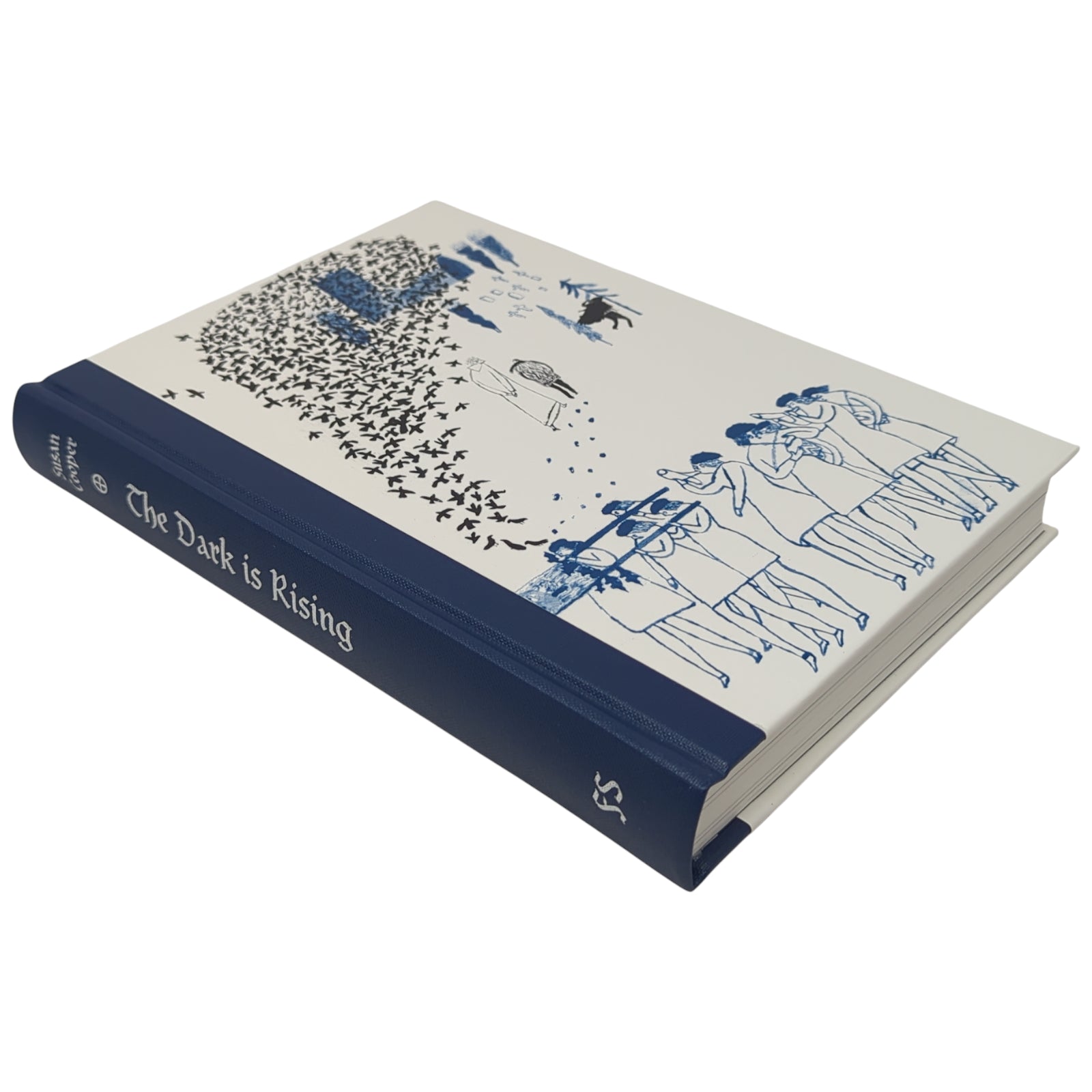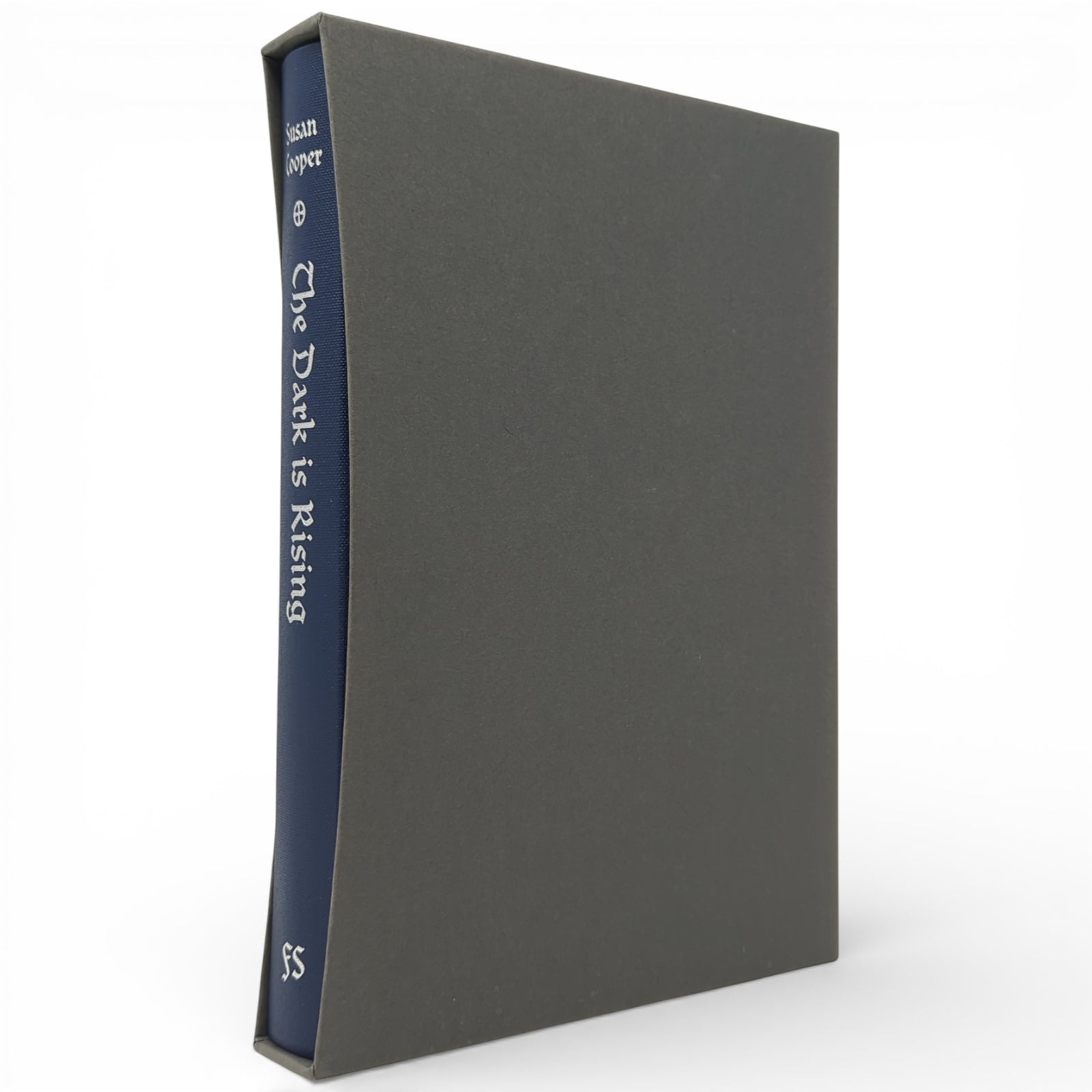 The Dark is Rising by Susan Cooper. London: The Folio Society, [2012]. First printing thus. With a new preface by the author, illustrated by Laura Carlin. 229 × 161 × 27 mm. Pp. [i–iv] v–xi [xii], [1–6] 7–223 [224–228]: [8] leaves of colour plates (facing pp. [iii], 36, 84, 101, 132, 181, 196 and 213). Type: Elysium with Clairvaux for display. Printed and bound by Grafos in quarter blue buckram with paper boards printed with design by Carlin; dark grey endleaves. Dark grey slip case. Second in eponymous series.