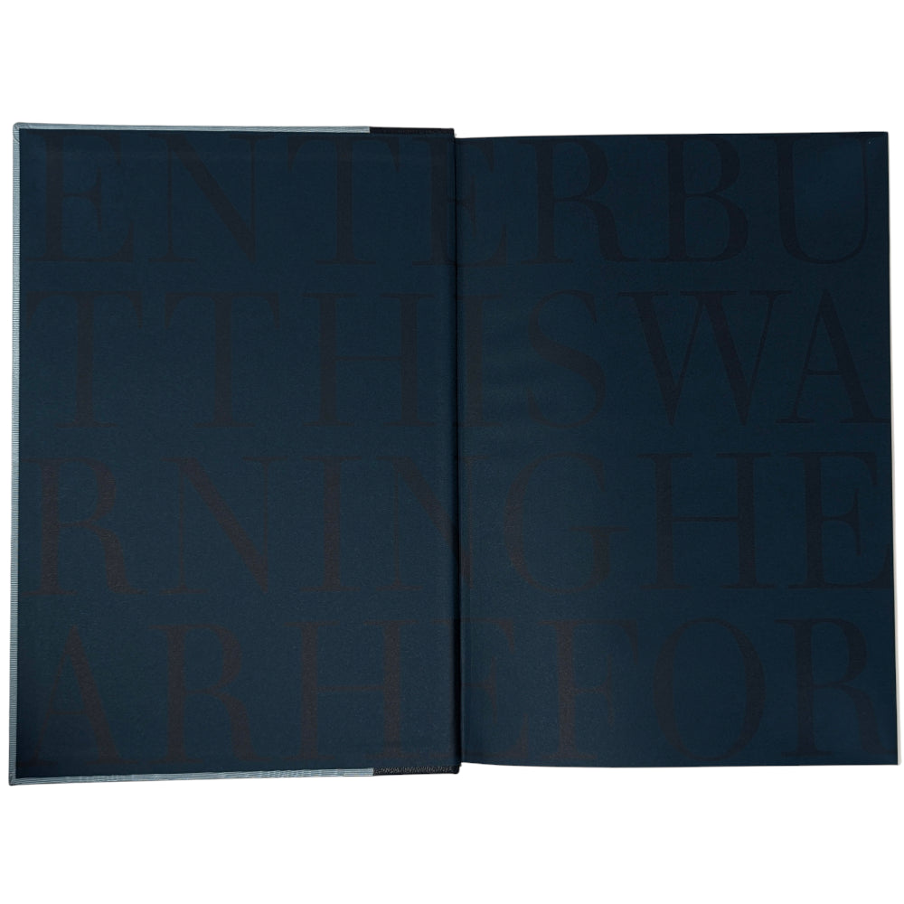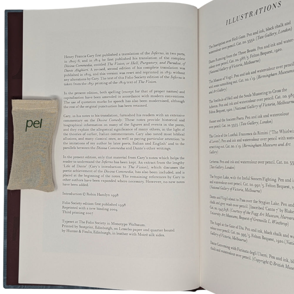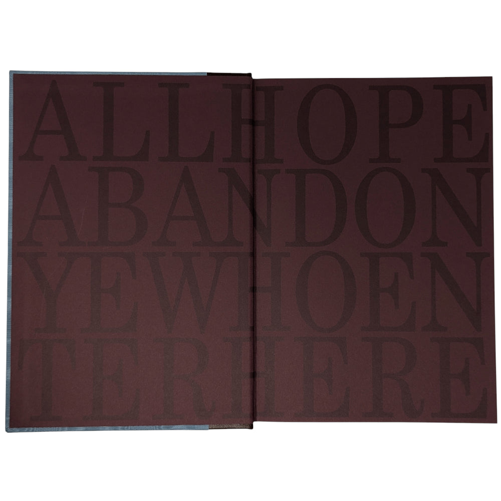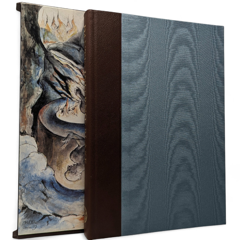 ALIGHIERI, Dante. Inferno. London: The Folio Society, 1998. Third printing thus, 2007. Translated by Henry Francis Cary, introduced by Robin Hamlyn, with illustrations by William Blake. 325 × 230 × 32 mm. Pp. [1–2], [i–viii] ix–xviii [xix–xx], 1–151 [152–154]: [32] leaves of colour ‘plates’. Type: Walbaum. Printed by Scotprint and bound by Hunter and Foulis. Quarter dark-brown morocco, pale blue artificial moiré silk boards; dark red endleaves printed in darker red with ‘All Hope Abandon Ye Who Enter Here’. Dark brown slip case with one of Blake’s illustrations on the front panel.