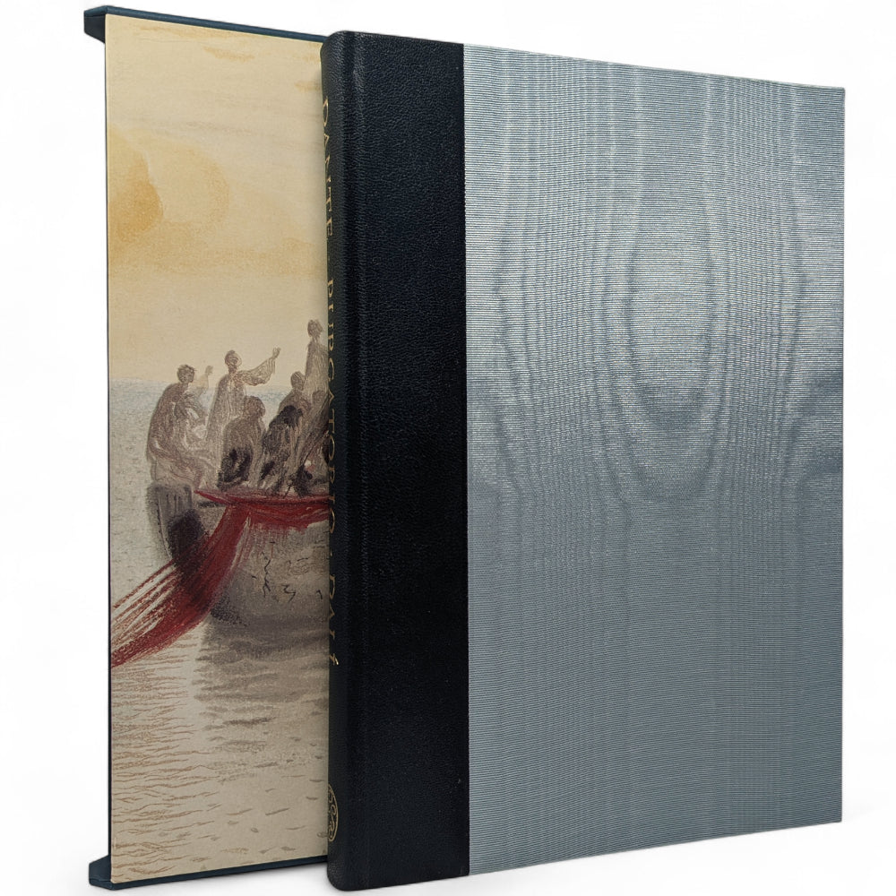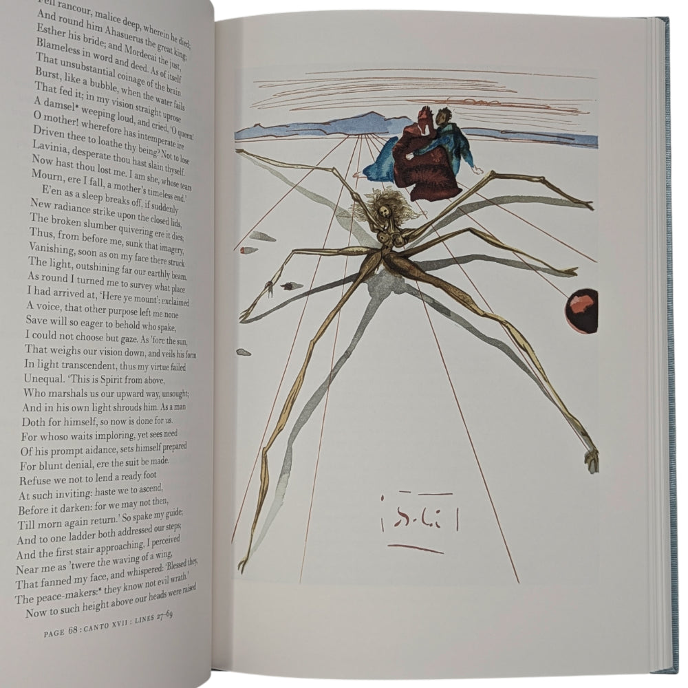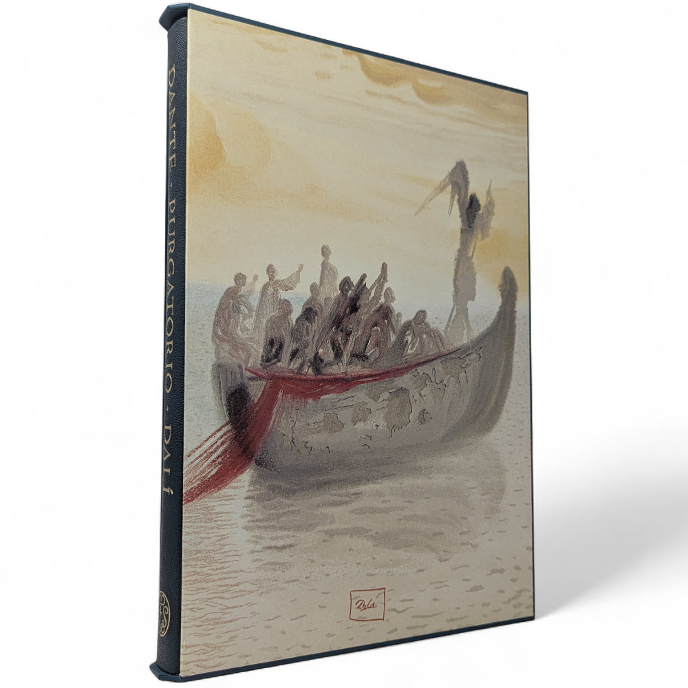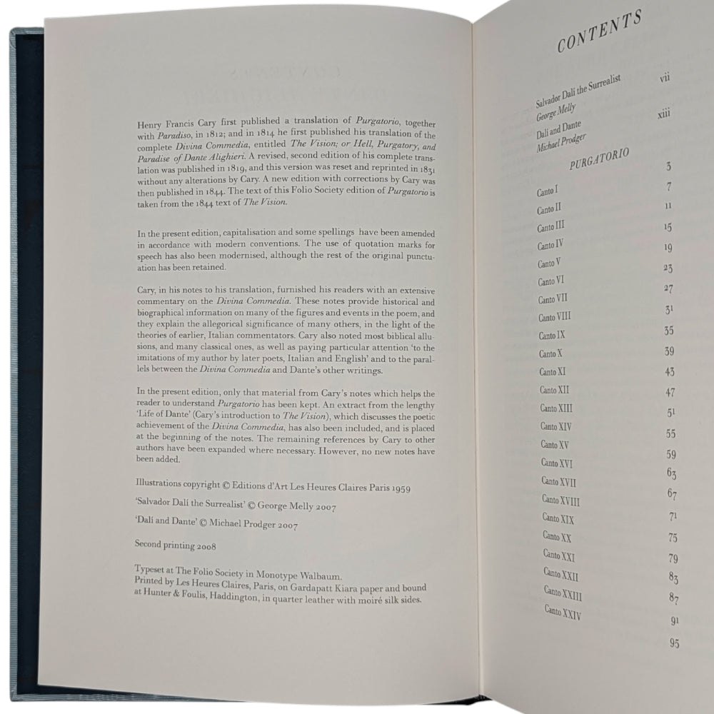ALIGHIERI, Dante. Purgatorio. London: The Folio Society, 2007. Second printing thus, 2008. Translated by Henry Francis Cary, with introductory essays by George Melly and Michael Prodger, illustrations by Salvador Dalí. 326 × 227 × 28 mm. Pp. [i–vi] vii–xvi, [1–2] 3–154 [155–156]: [34] leaves of colour plates. Type: Walbaum. Printed by Les Heures Claires. Bound by Hunter and Foulis. Quarter dark blue-green leather, pale blue artificial silk boards; dark blue endleaves printed with black let tering. Dark blue-green slip case with a colour reproduction of one of Dalí’s illustrations on the front. Through a collaboration with the copyright holders, this edition is the first to reproduce Dalí’s original watercolours.