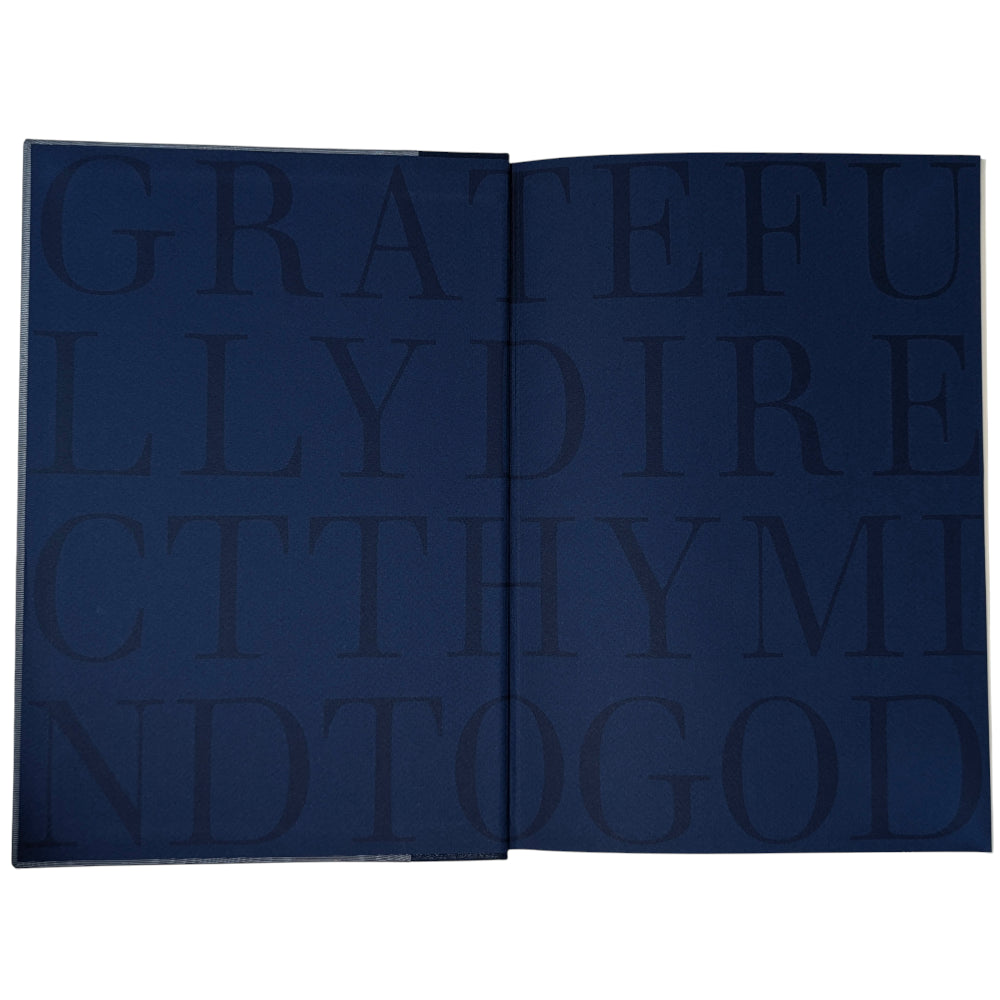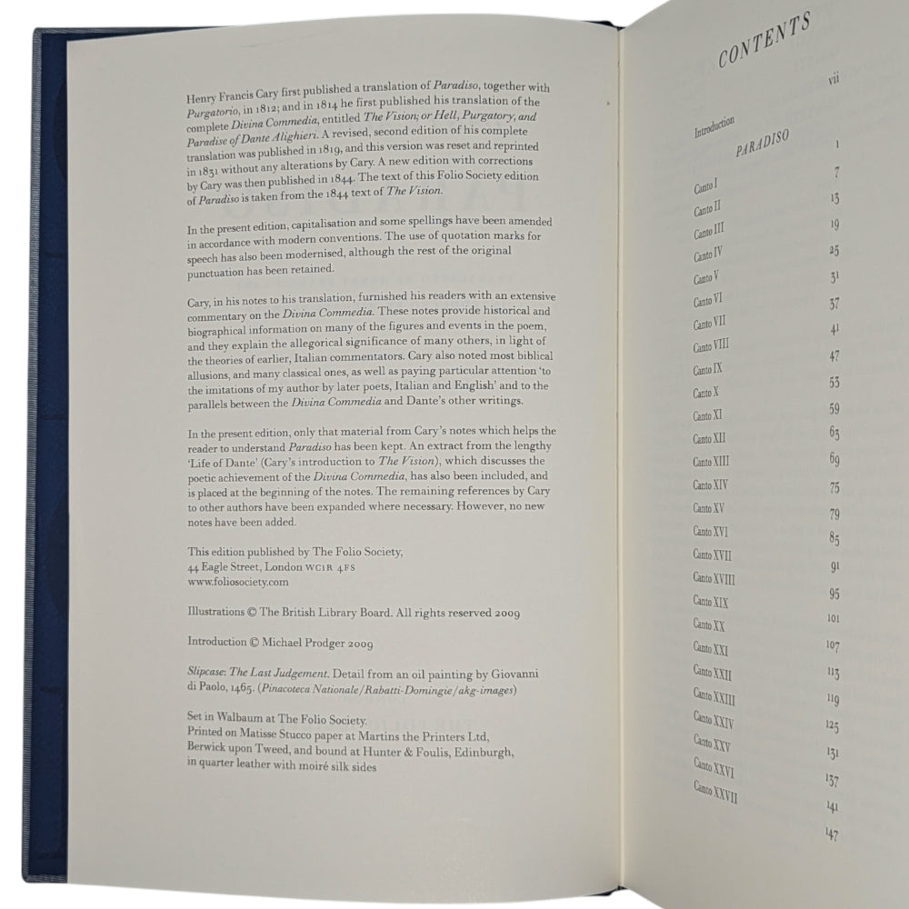 ALIGHIERI, Dante. Paradiso. London: The Folio Society, 2009. First printing thus. Translated by Henry Francis Cary, introduced by Michael Prodger, with illustrations by Giovanni di Paolo. 326 × 227 × 27 mm. Pp. [i–vi] vii–xi [xii], 1–203 [204]. Type: Walbaum. Printed by Martins of Berwick. Bound by Hunter and Foulis in quarter dark blue leather with grey artificial silk boards; dark blue endleaves with letters reading GRATEFULLYDIRECTTHYMINDTOGOD printed in darker blue. Blue slip case with image of the Last Judgement by di Paolo on front. Sixty-two illuminations by the artist follow Dante along his journey through the nine spheres of heaven.
