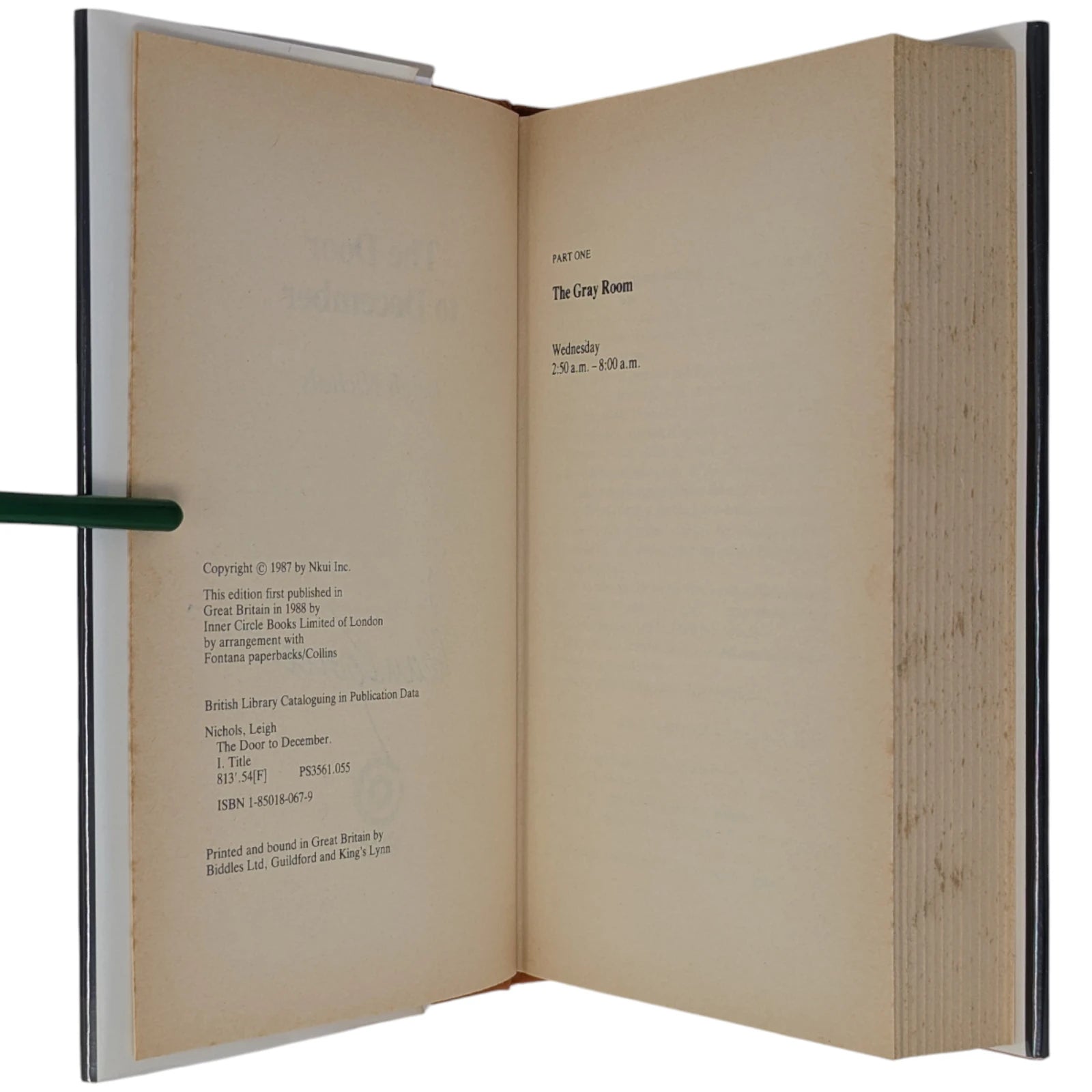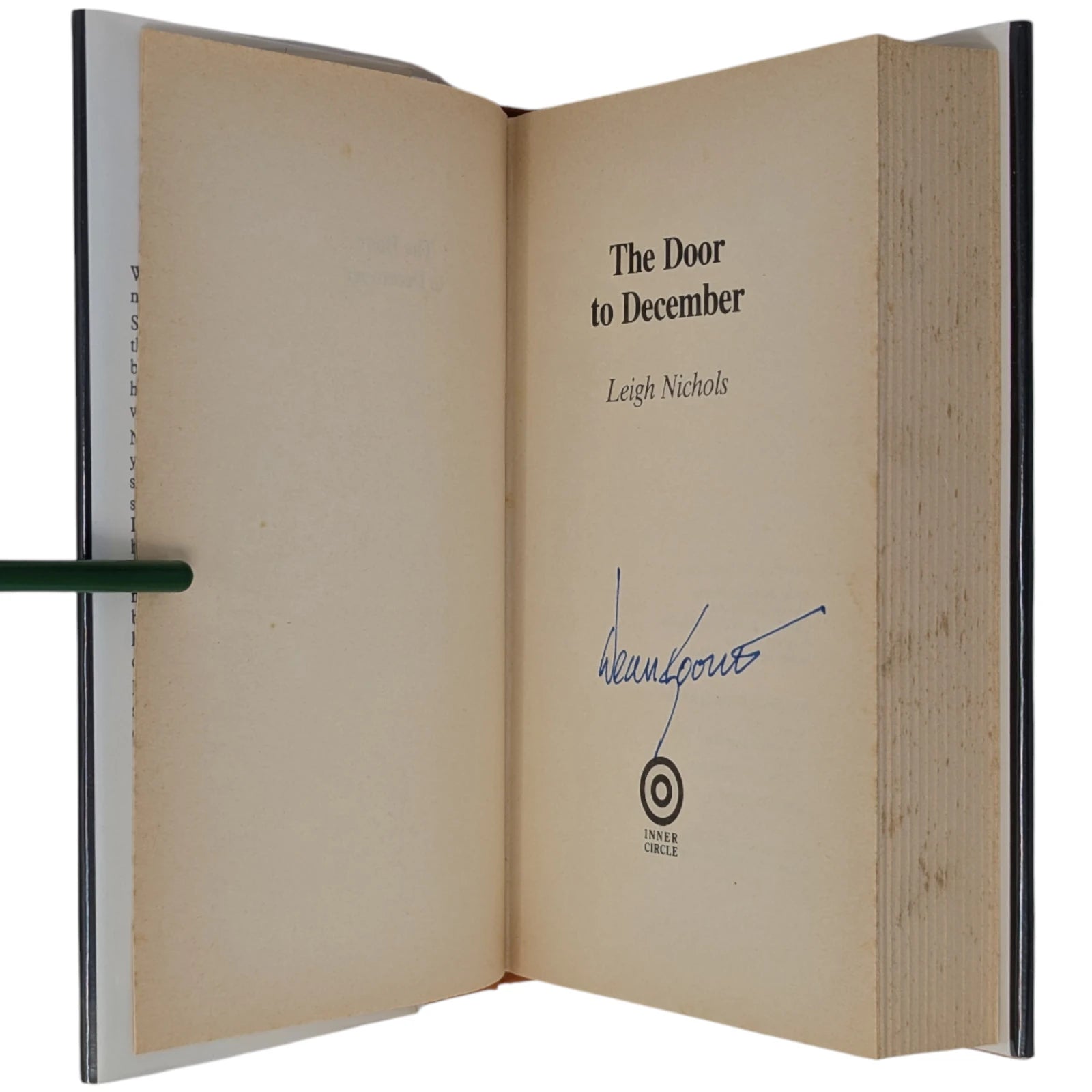 The Door to December, by Leigh Nichols. London: Inner Circle Books, 1988. First edition, first printing. Signed by the author as Dean Koontz to title page. In unclipped dust wrapper with a design and illustration by Ken Leeder.