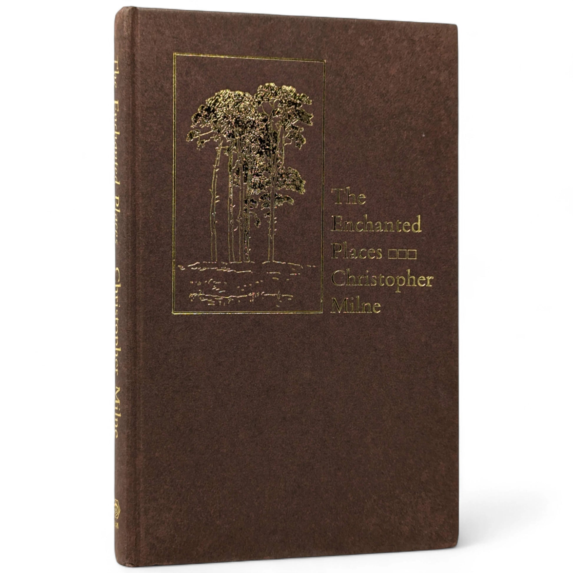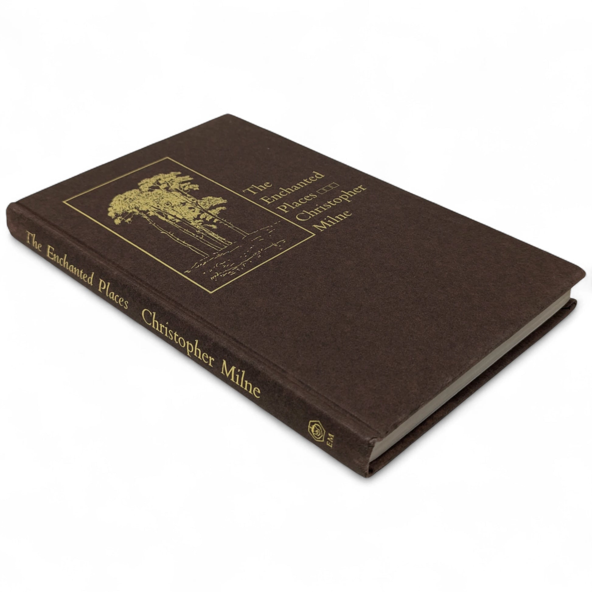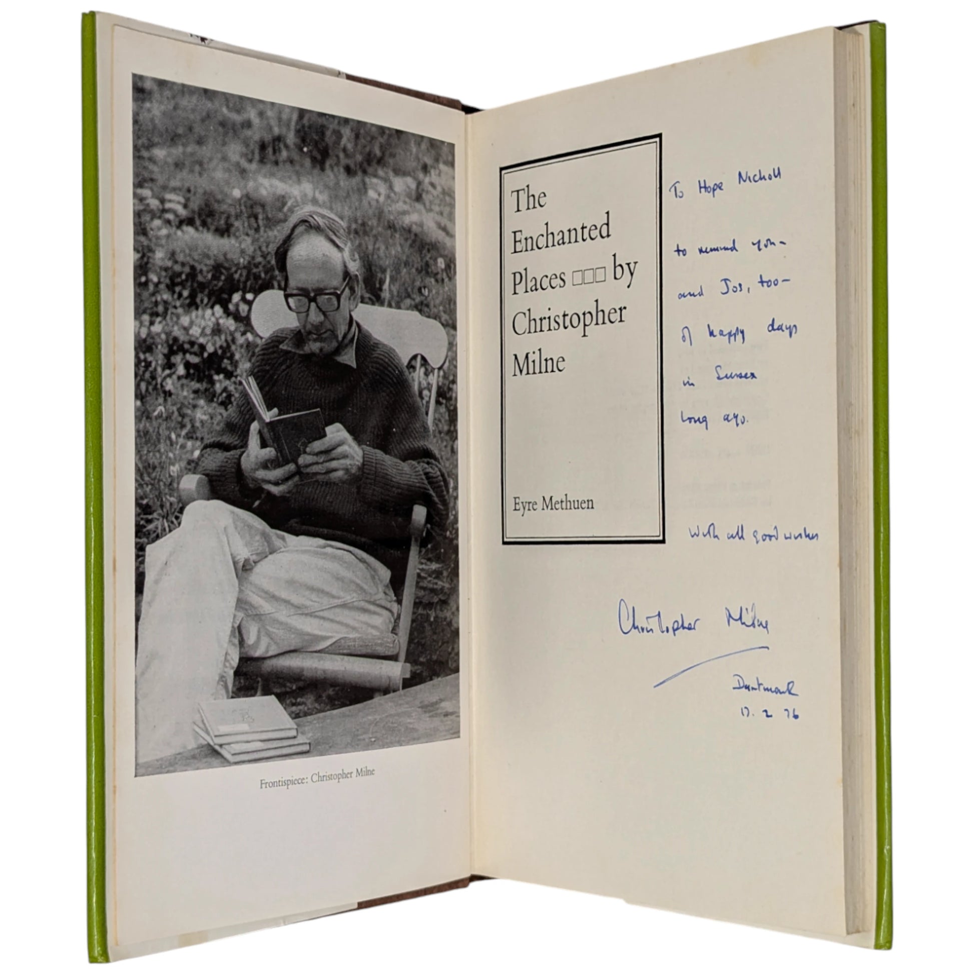 MILNE, Christopher. The Enchanted Places. London: Eyre Methuen, 1974. First reprint, 1975. Publisher's brown binding, gilt decoration and lettering to upper cover and spine, plain endpapers; with unclipped (£3.75) dustwrapper. Personally dedicated, signed and dated by the author on title page.