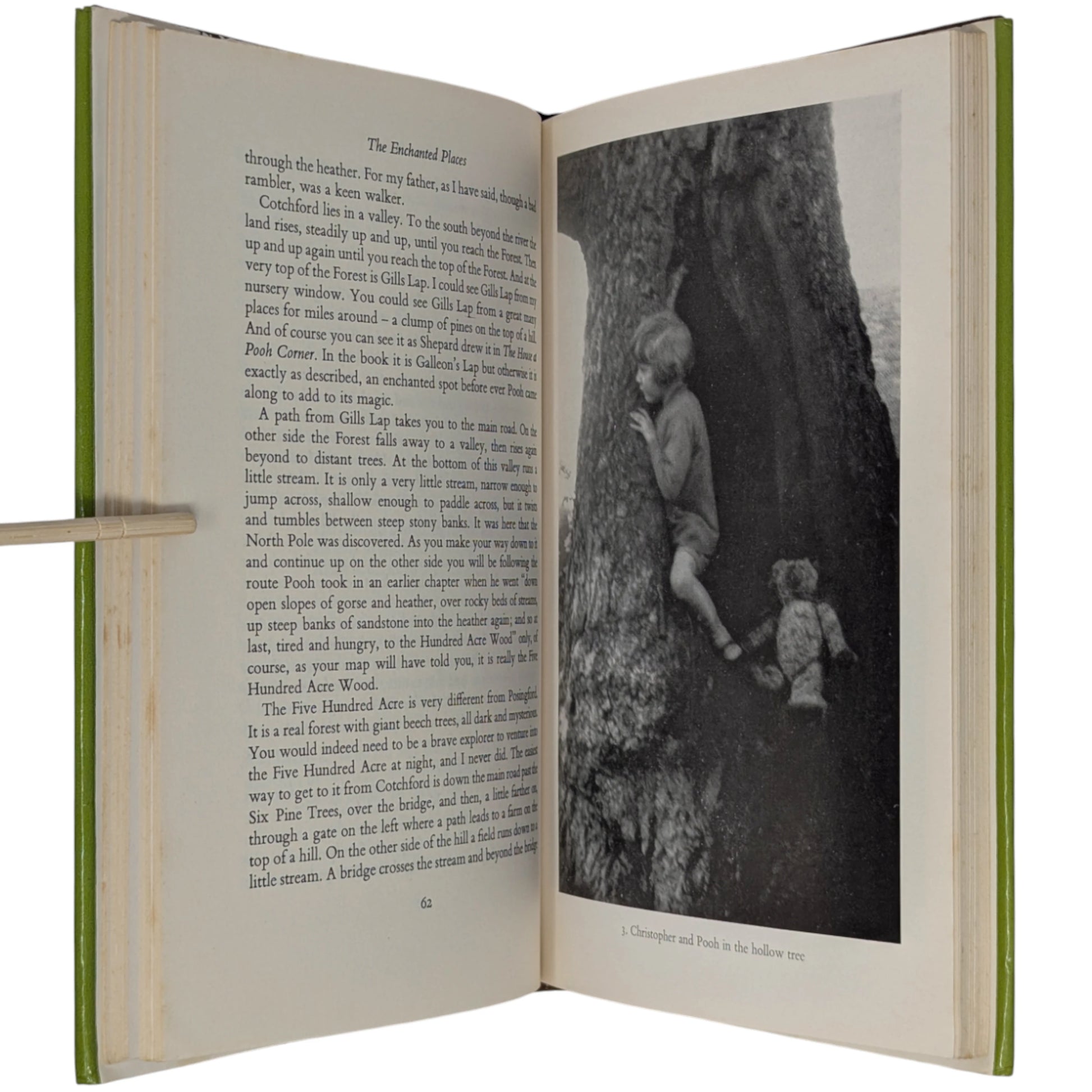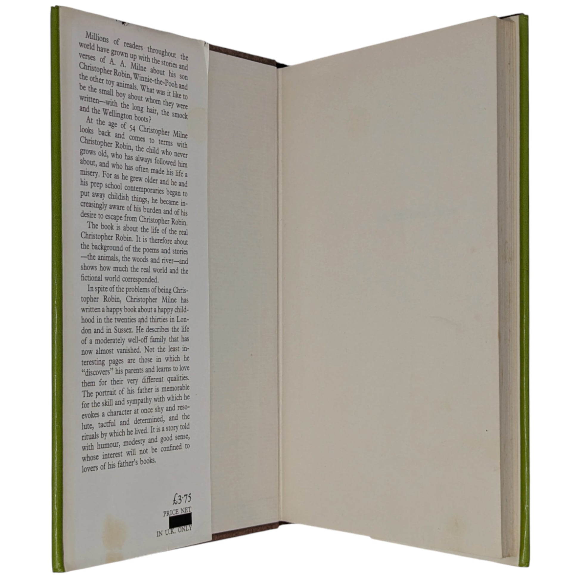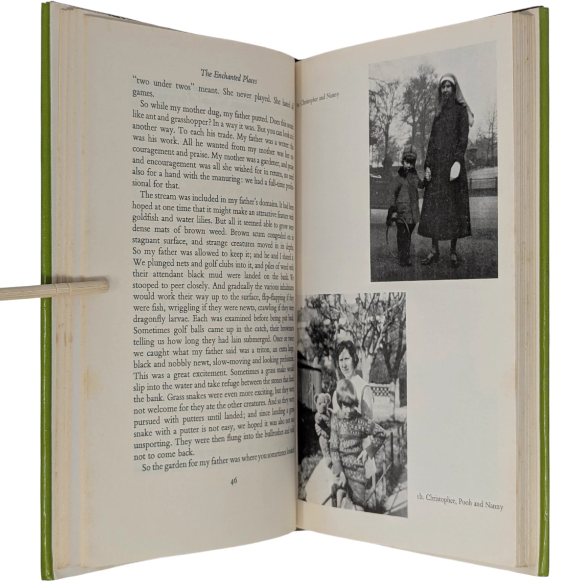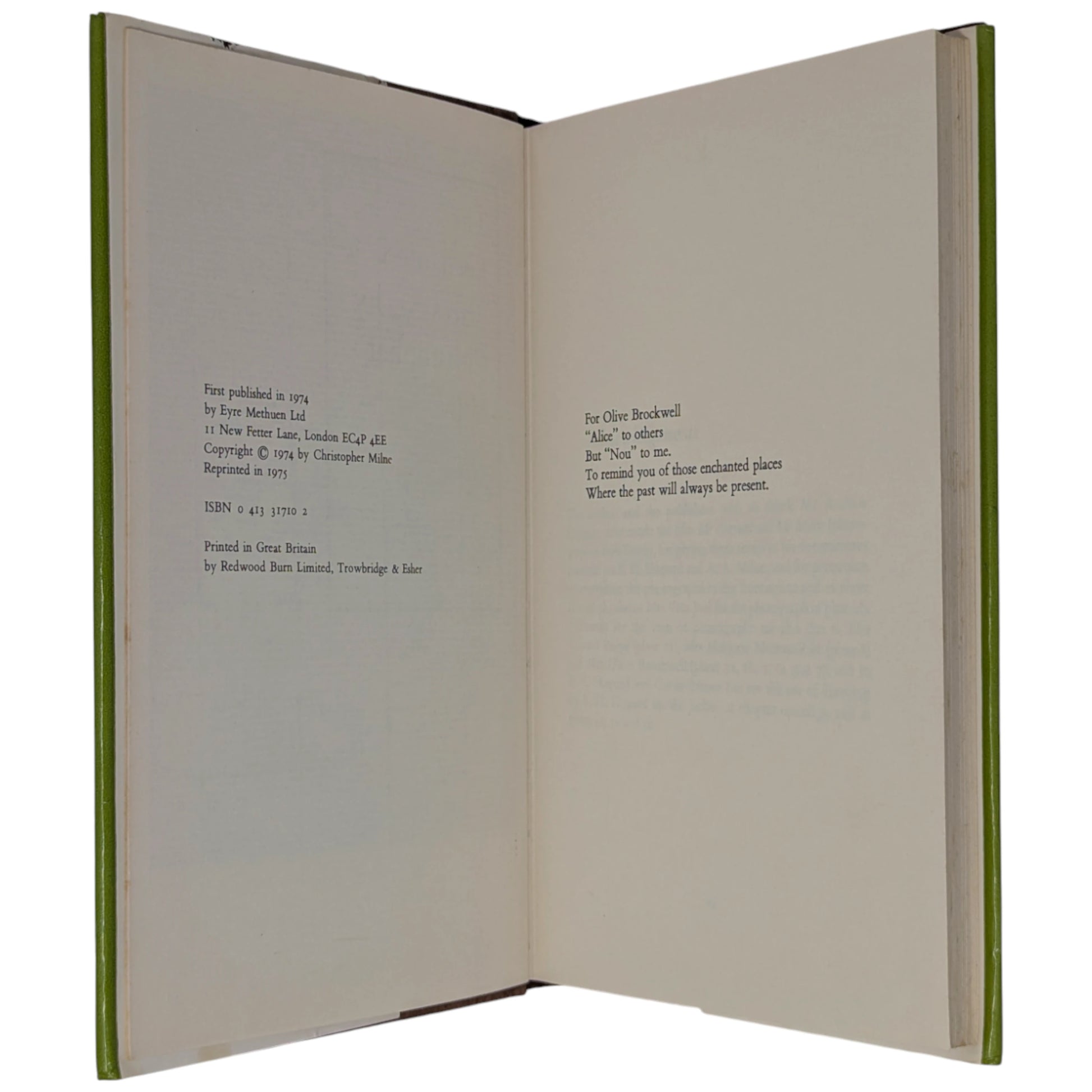 MILNE, Christopher. The Enchanted Places. London: Eyre Methuen, 1974. First reprint, 1975. Publisher's brown binding, gilt decoration and lettering to upper cover and spine, plain endpapers; with unclipped (£3.75) dustwrapper. Personally dedicated, signed and dated by the author on title page.