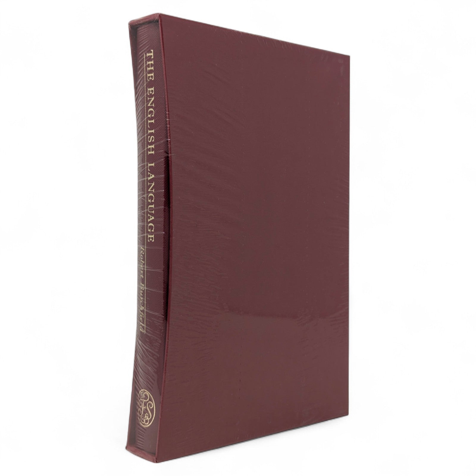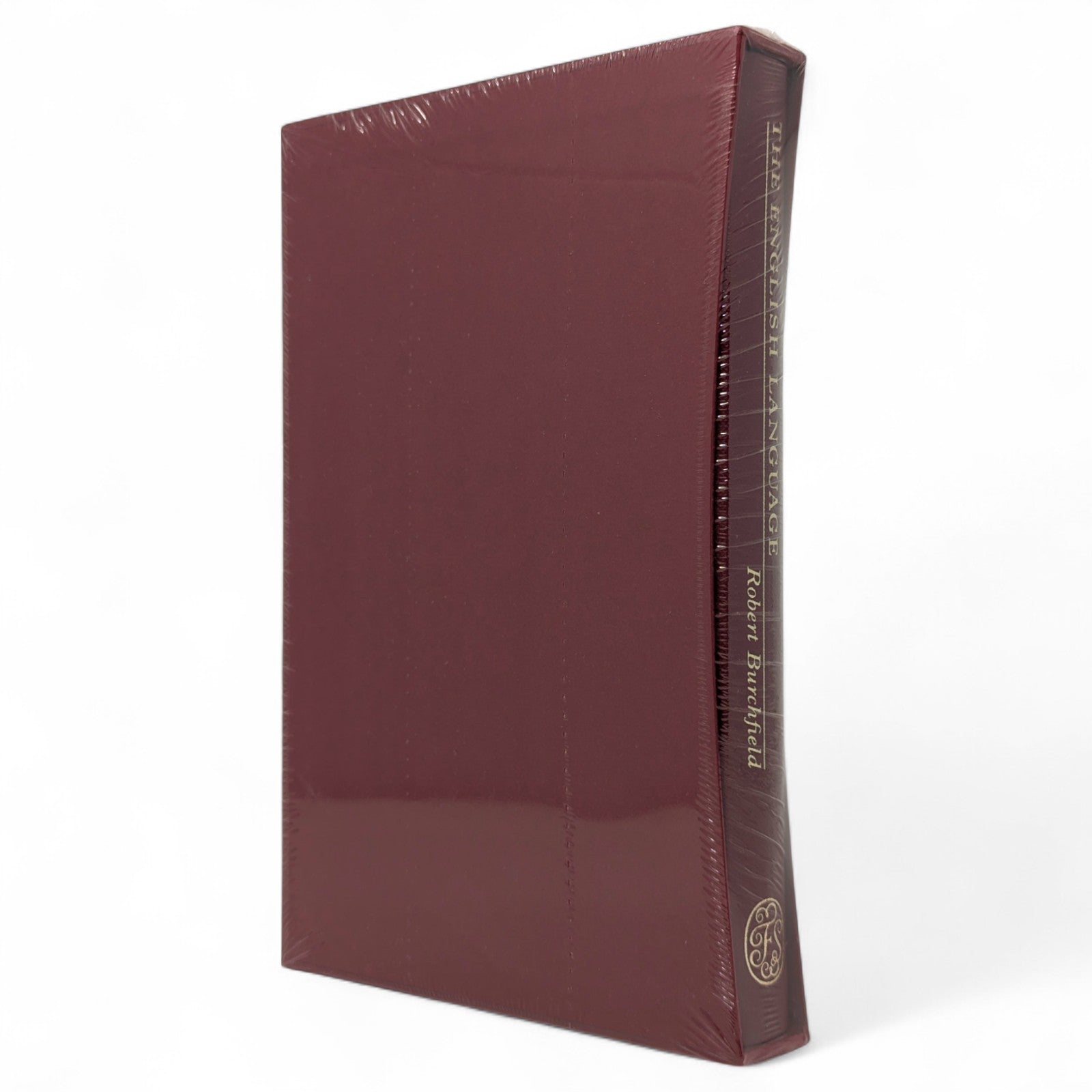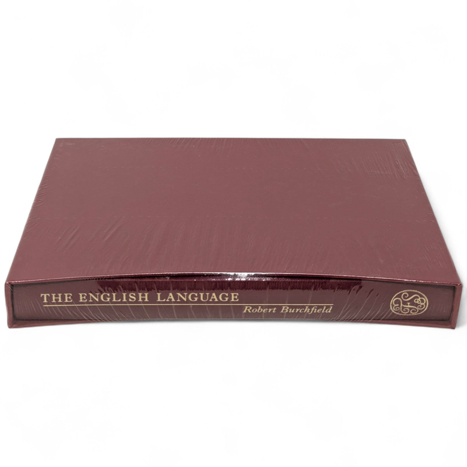 The English language, Robert Burchfield. London: The Folio Society, 2006. Introduction by Robert McCrum, afterword by John Simpson. Map by Neil Gower. 228 × 150 × 30 mm. Pp. [i–vi] vii–xxiii [xxiv–xxvi], 1–230: [14] pages of colour and monochrome plates. Type: Imprint. Printed and bound by Cambridge University Press. Quarter dark red buckram, pale gold paper boards with a repeat pattern in dark green; dark red endleaves. Dark red slip case. The text was originally published in 1985, and the present edition follows the corrected reprint of 2002. The plates reproduce prints, paintings, photographs and documents.