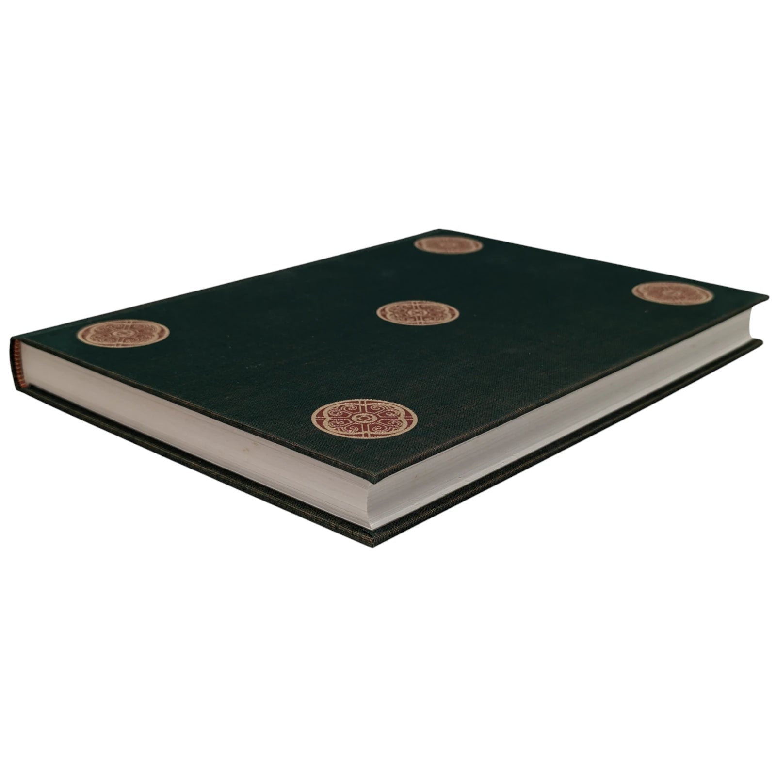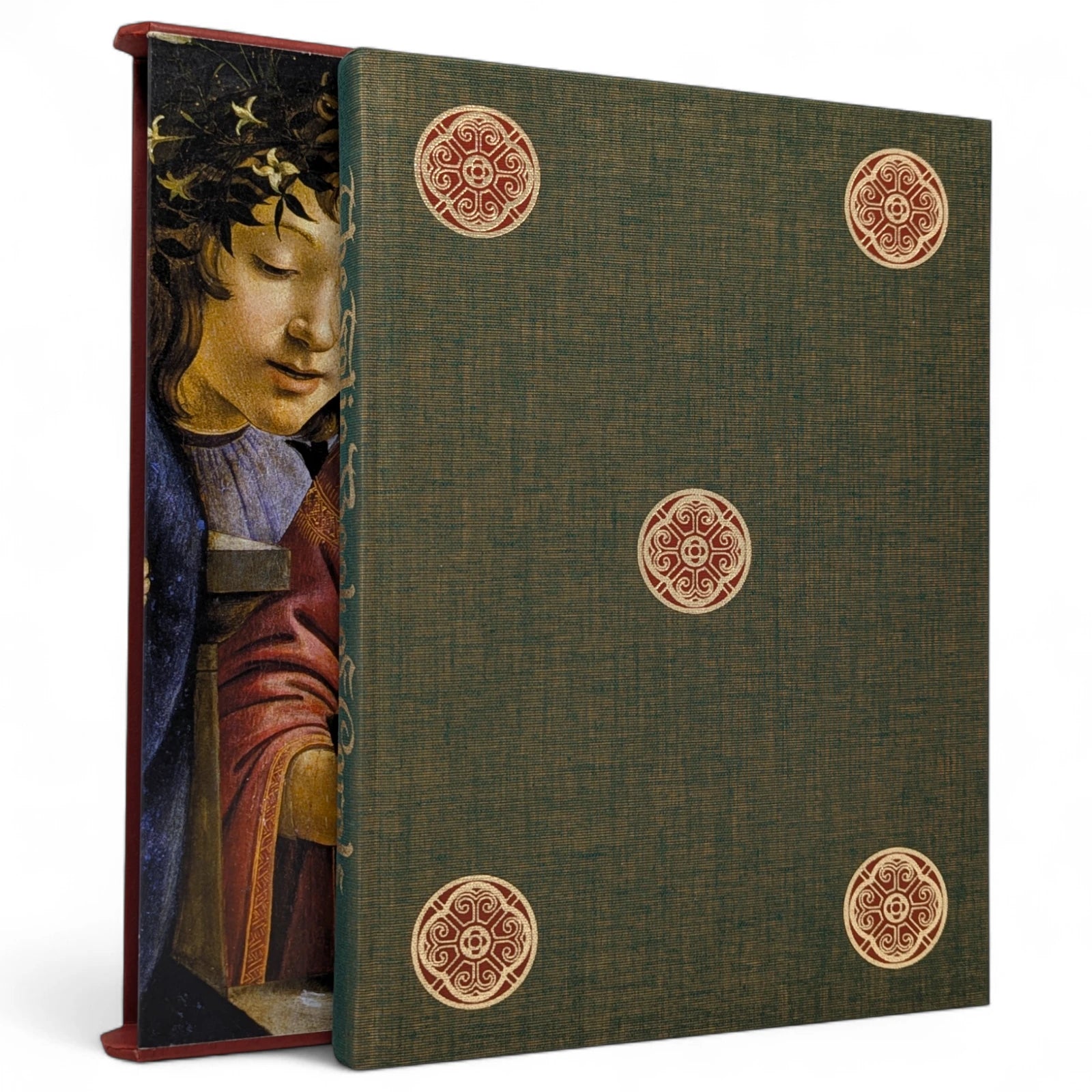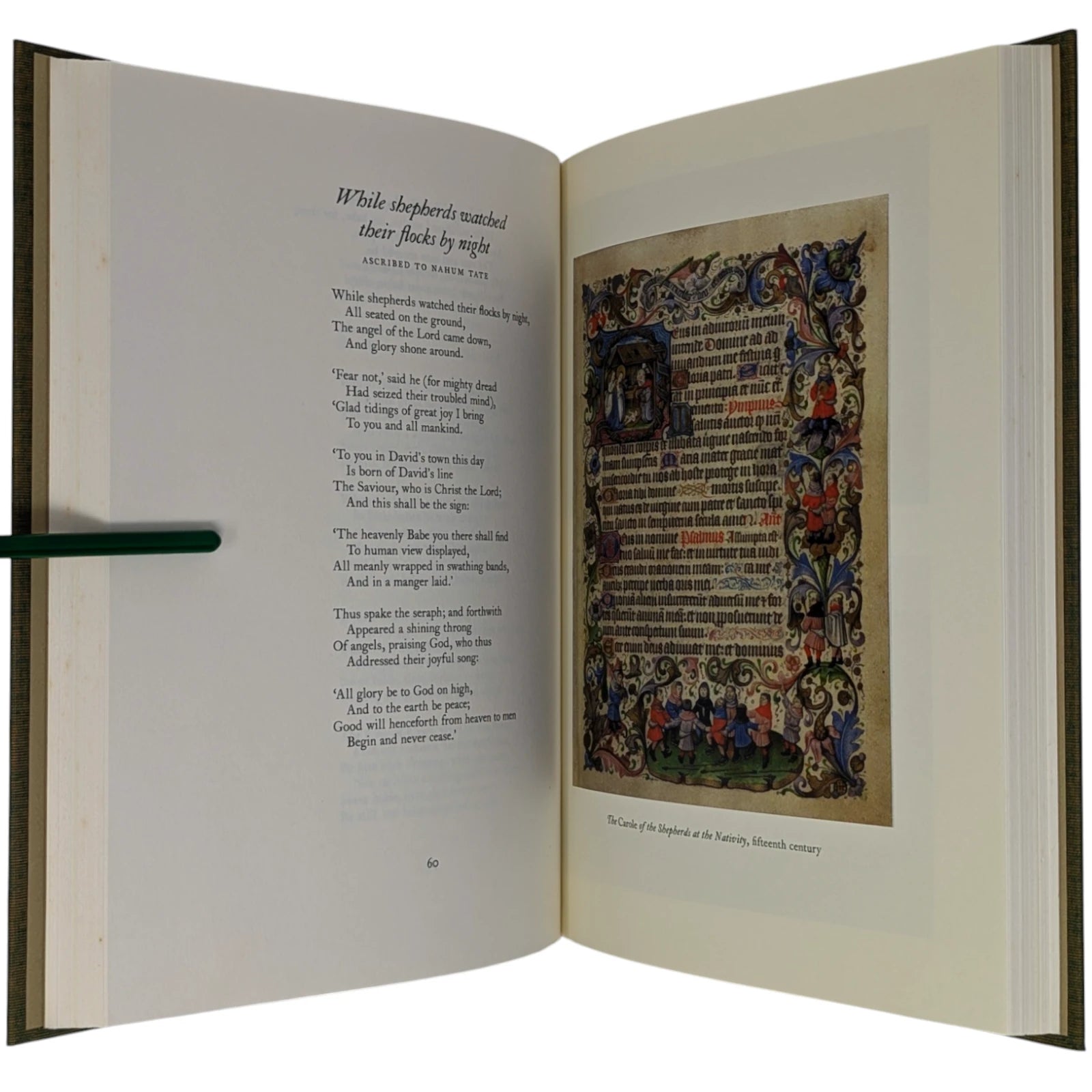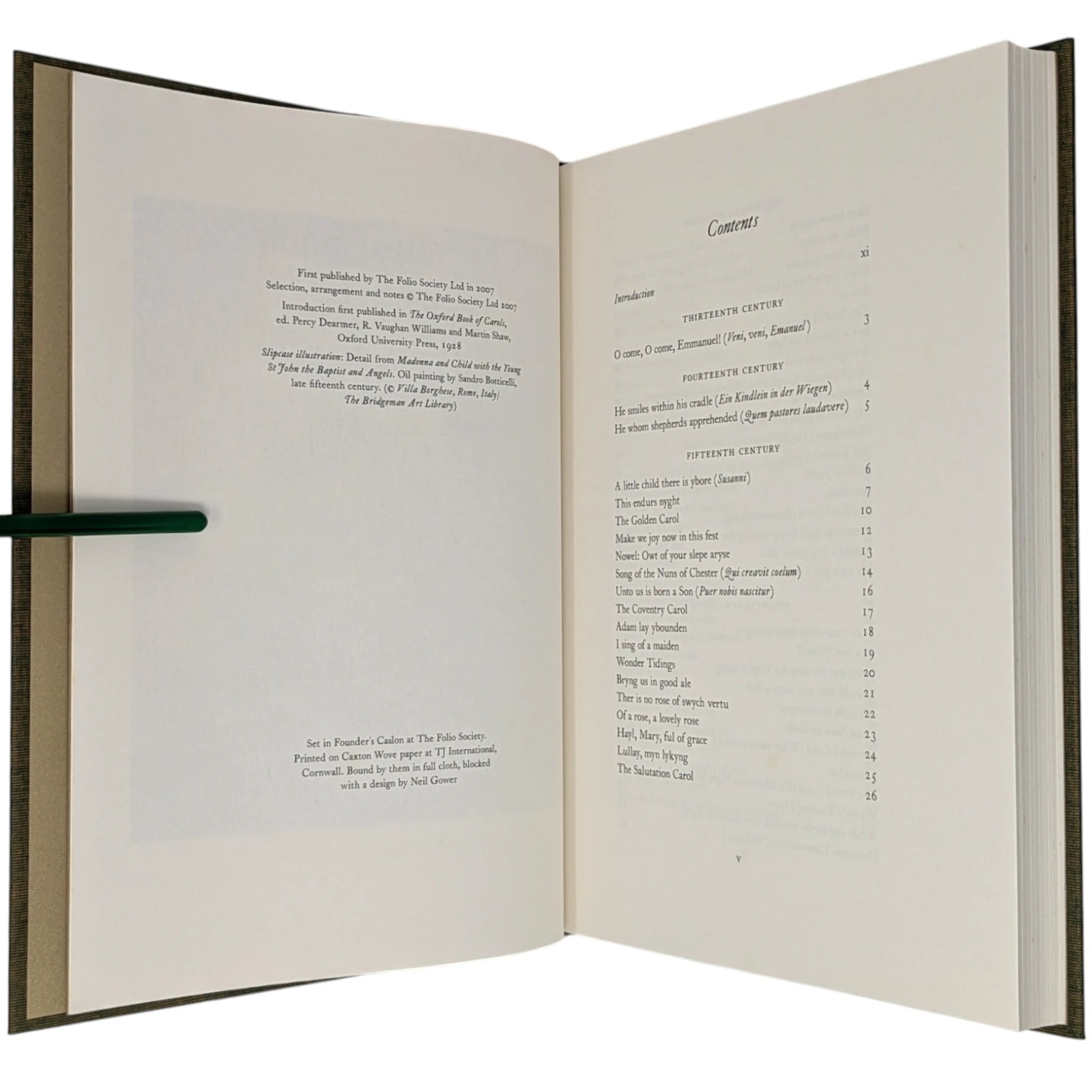 The Folio Book of Carols. London: The Folio Society, 2007. First printing thus. Introduction by Percy Dearmer. 262 × 191 × 22 mm. Pp. [i–iv] v–xx, [1–2] 3–138 [139–140]: [7] leaves of colour plates (facing p. [iii] and between pp. 12–13, 60–61 and 108–109). Type: Caslon. Printed and bound by T.J. International in full green-yellow cloth blocked with a design in red and gold by Neil Gower; gold endleaves. Red slipcase with reproduction on front of a detail from a Sandro Botticelli oil painting.