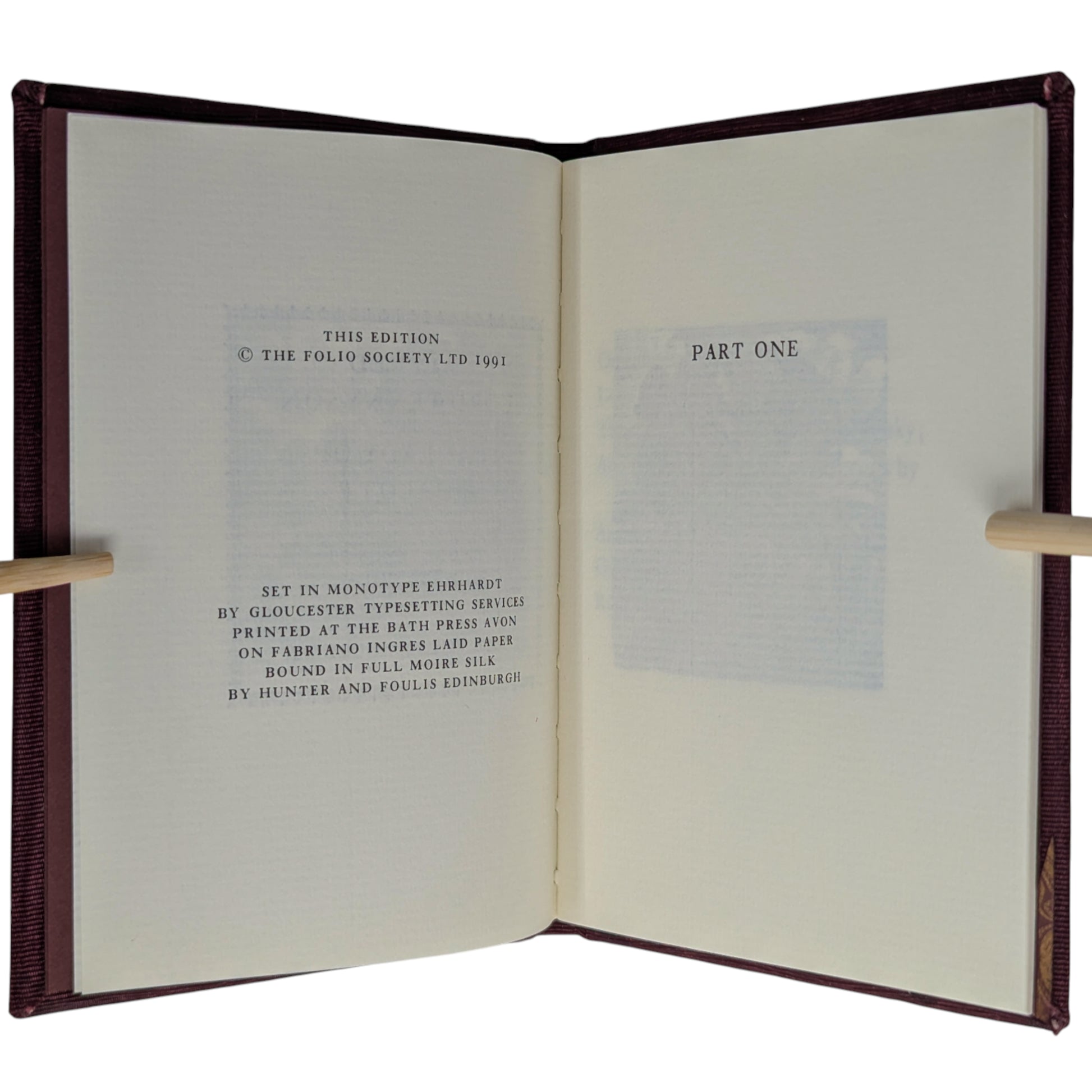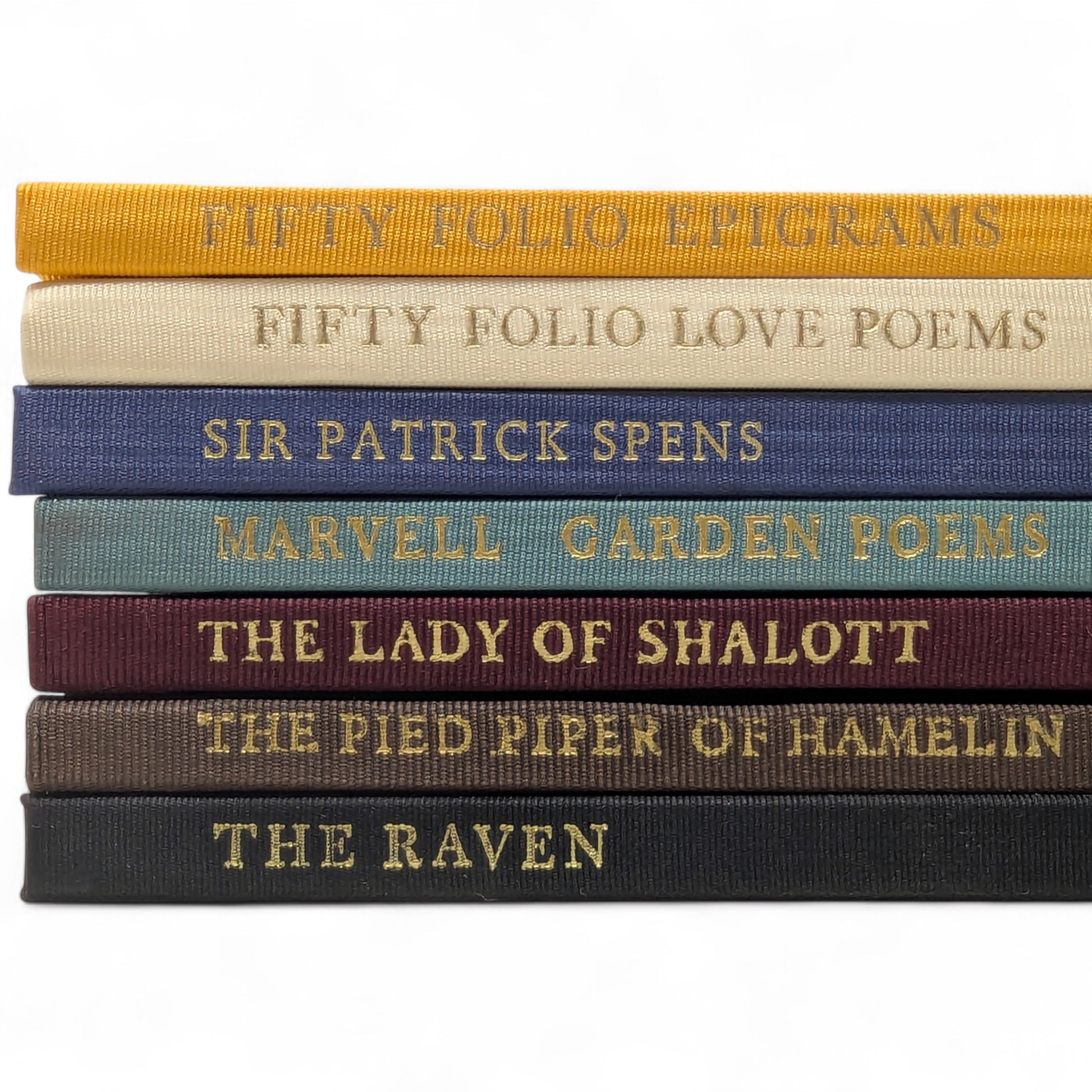The complete set of seven delightful miniature poetry books published by The Folio Society in series between 1991 and 1997, all sized around 12 x 8.5 cm, printed letterpress on high-quality paper, bound uniformly in shimmering moiré silk in different colours, and each housed in thin gold slipcases. Each miniature book is illustrated with exquisite wood engravings from leading contemporary artists, including Howard Phipps, John Lawrence, Harry Brockway, Jane Lydbury, George Tute, Peter Forster, and Simon Brett. All are first printings thus.