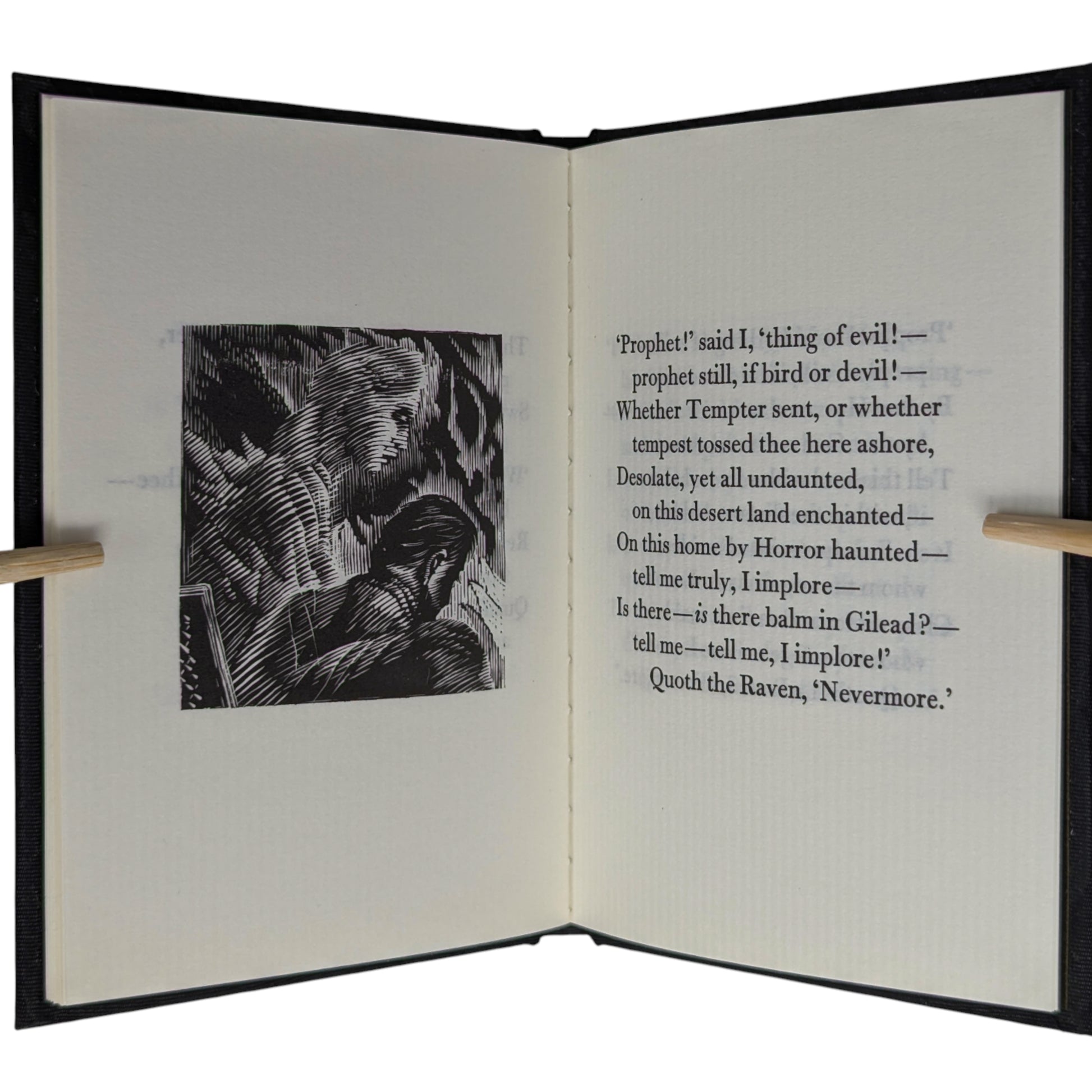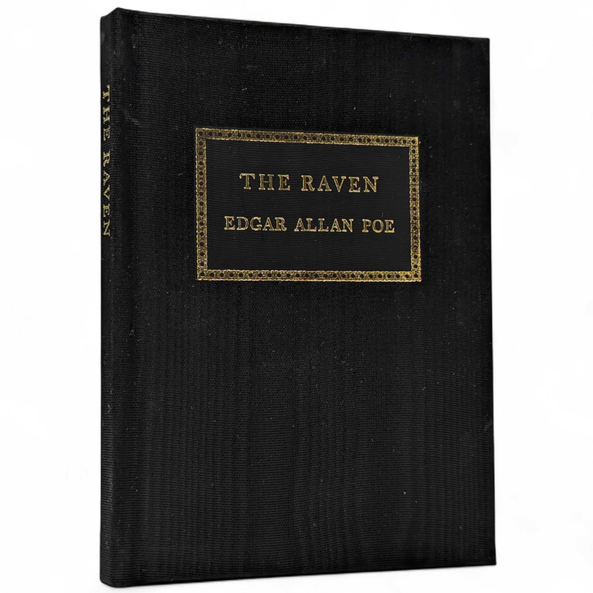 - POE, Edgar Allan. The Raven. London: The Folio Society, 1995. [wood-] engravings by George Tute. 117 × 85 × 7 mm. Pp. [1–32]. Type: Bulmer. Typeset by Gloucester Typesetting, printed and bound by Mandarin Offset. Black series binding; black endleaves. There are seven small wood-engravings by Tute. When exposed to light, the binding cloth fades to grey.