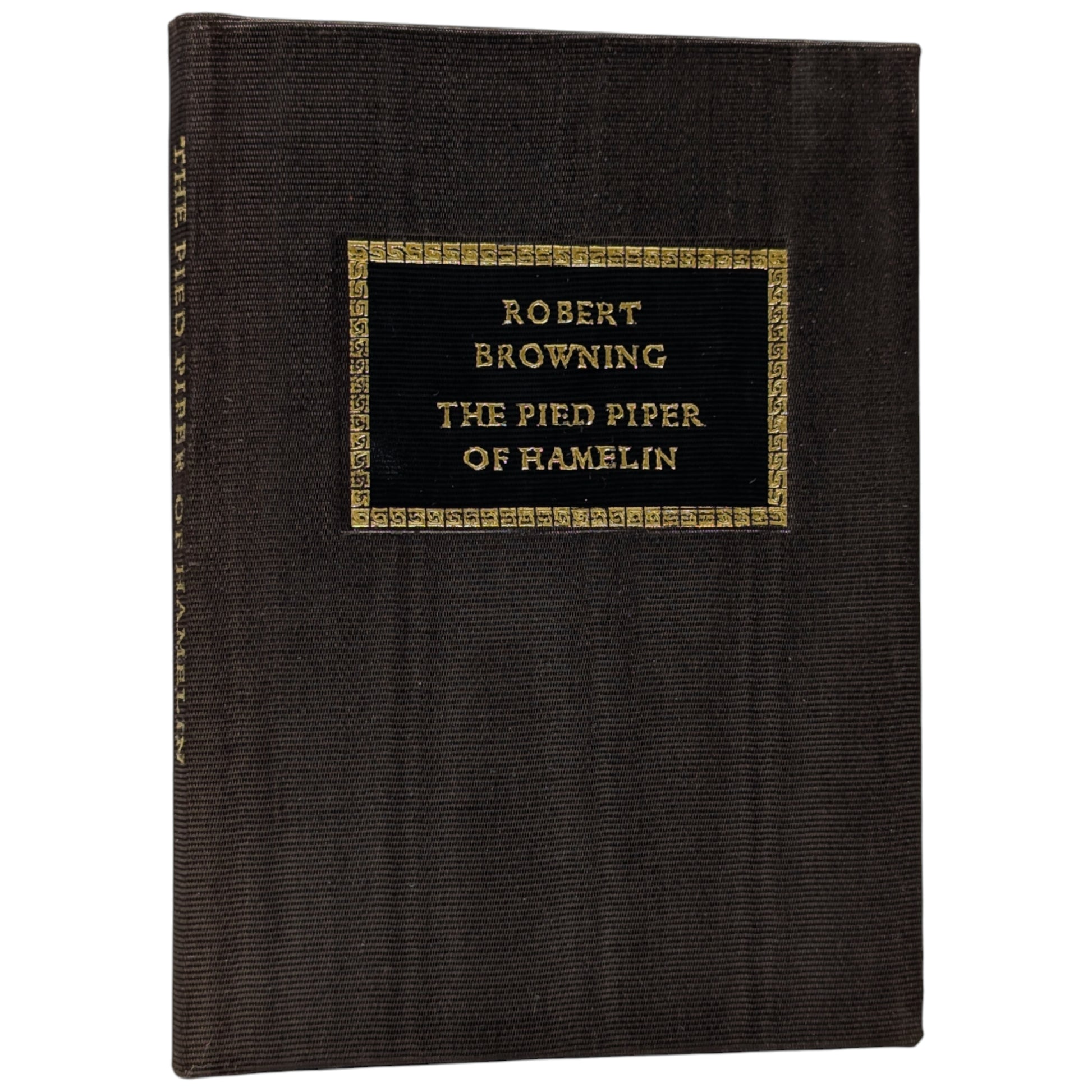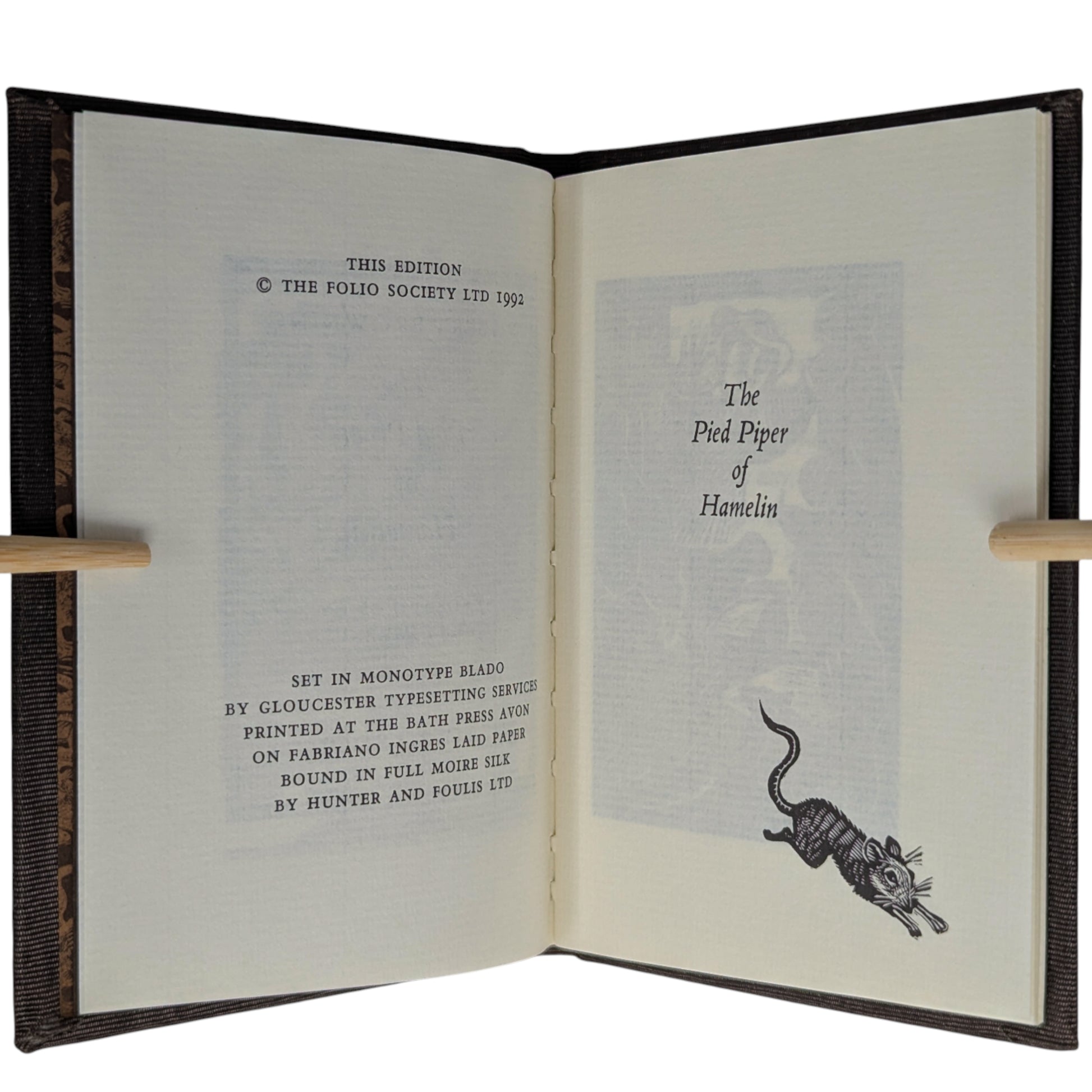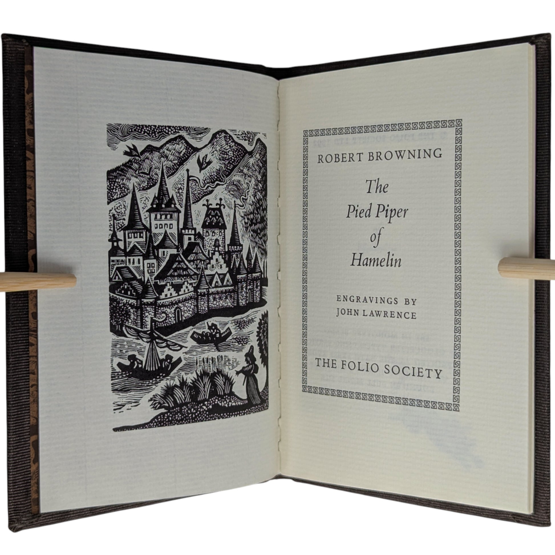 - BROWNING, Robert. The Pied Piper of Hamelin. London: The Folio Society, 1992. [wood-] engravings by John Lawrence. 116 × 85 × 7 mm. Pp. [1–32]. Type: Blado. Typeset by Gloucester Typesetting, printed by the Bath Press. Bound by Hunter and Foulis in dark brown series binding; dark red endleaves. There are six small wood-engravings by Lawrence printed in the text. A problem with blocking the cover decoration meant that the first copies were delivered in October 1992, while the remainder were bound later, using a different brass, and were not completed until December.