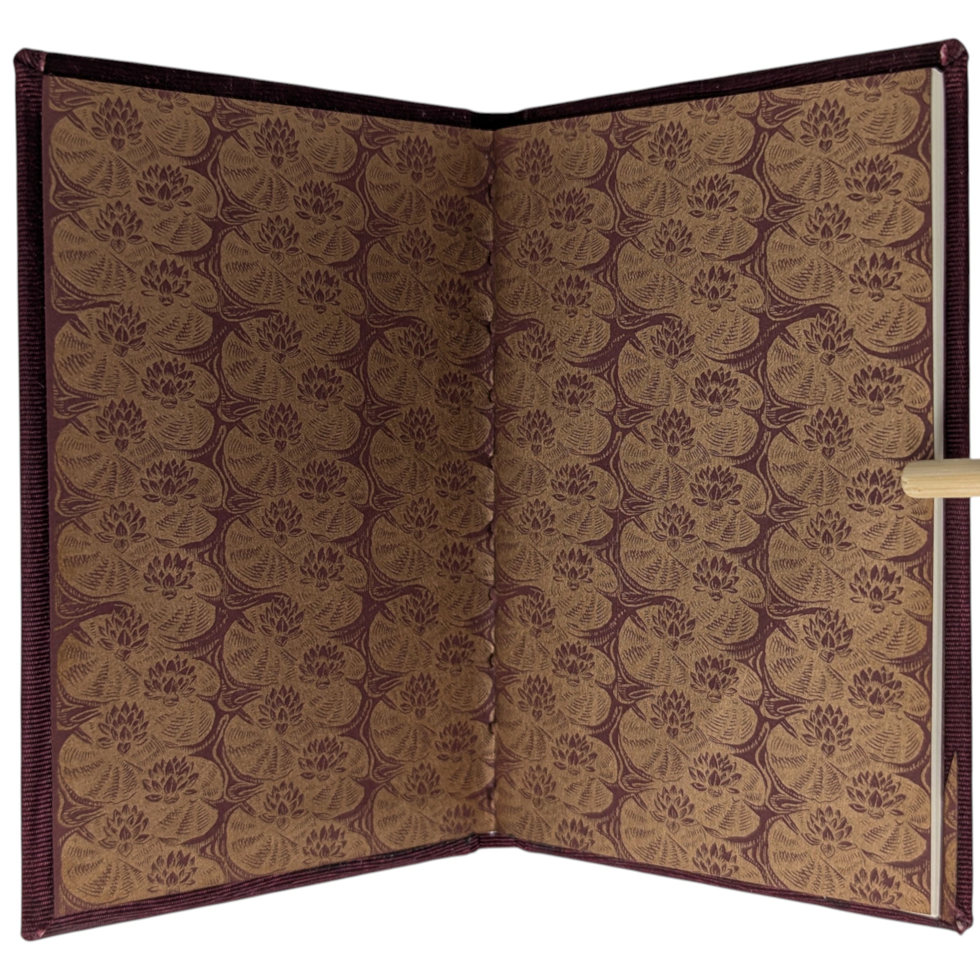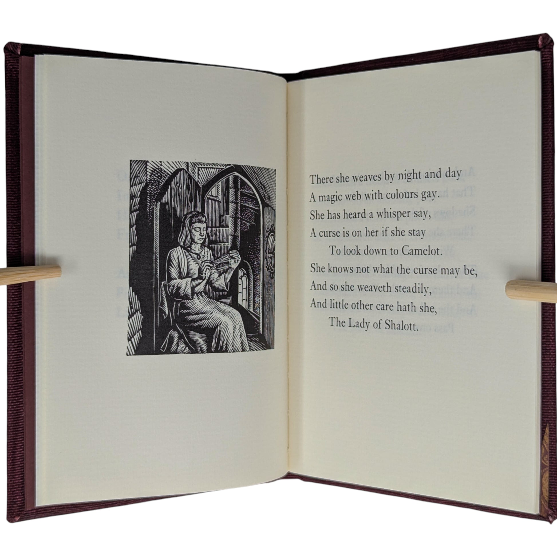 - TENNYSON, Alfred (Lord).The Lady of Shalott. London: The Folio Society, 1991. [wood-] engravings by Howard Phipps. 116 × 83 × 8 mm. Pp. [1–32]. Type: Ehrhardt. Typeset by Gloucester Typesetting, printed by the Bath Press. Bound by Hunter and Foulis in full dark red artificial moiré silk, lettered in gold on a black panel; dark red endleaves with a repeat pattern in gold by Phipps. Gold slip case. There are five small wood-engravings by Phipps. This was the first of a new series of miniature poetry books, each illustrated with wood-engravings, and with a typographical border on the title-page. They were issued in a uniform binding of artificial moiré silk, with patterned end leaves and a gold slip case.