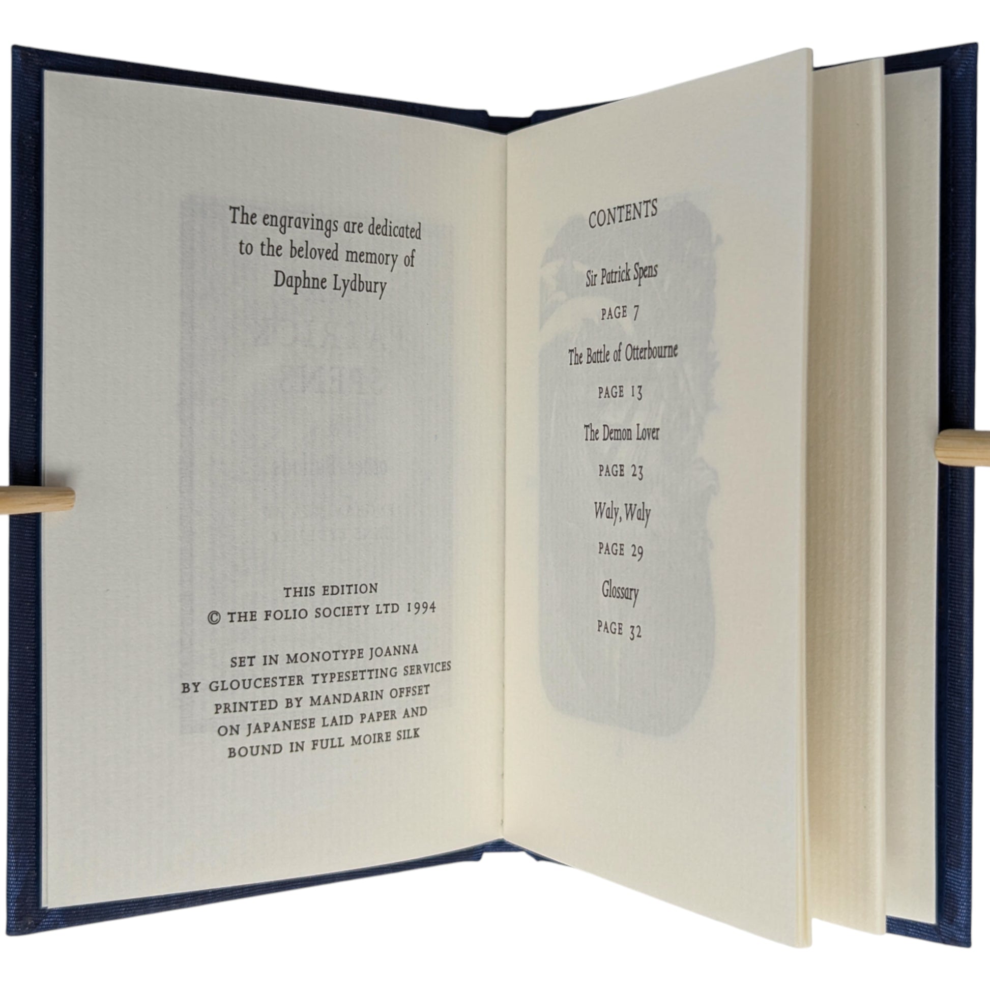 - Sir Patrick Spens & Other Ballads. London: The Folio Society, 1994. [wood-] engravings by Jane Lydbury. 117 × 86 × 8 mm. Pp. [1–6] 7–32. Type: Joanna italic. Typeset by Gloucester Typesetting, printed and bound by Mandarin Offset. Dark blue series binding; dark blue endleaves. There are five small wood-engravings by Lydbury. When exposed to sunlight the binding cloth fades to purple.