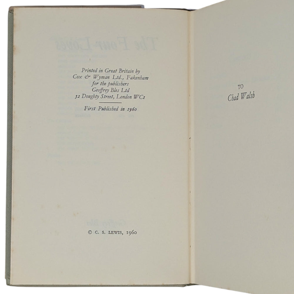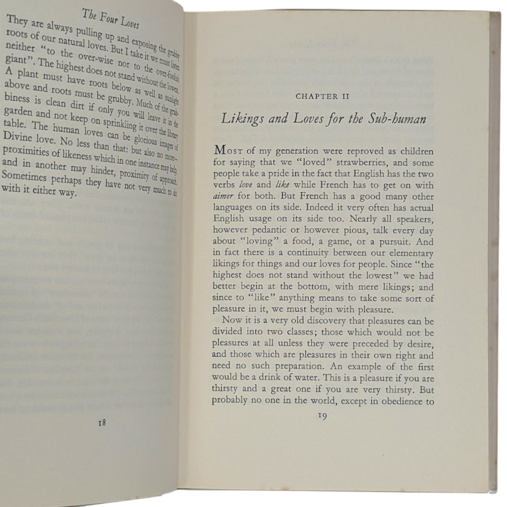 LEWIS, C. S. The Four Loves. London: Geoffrey Bles, 1960. First edition, first printing of Lewis' exploration of the nature of love from a Christian and philosophical perspective through thought experiments.
