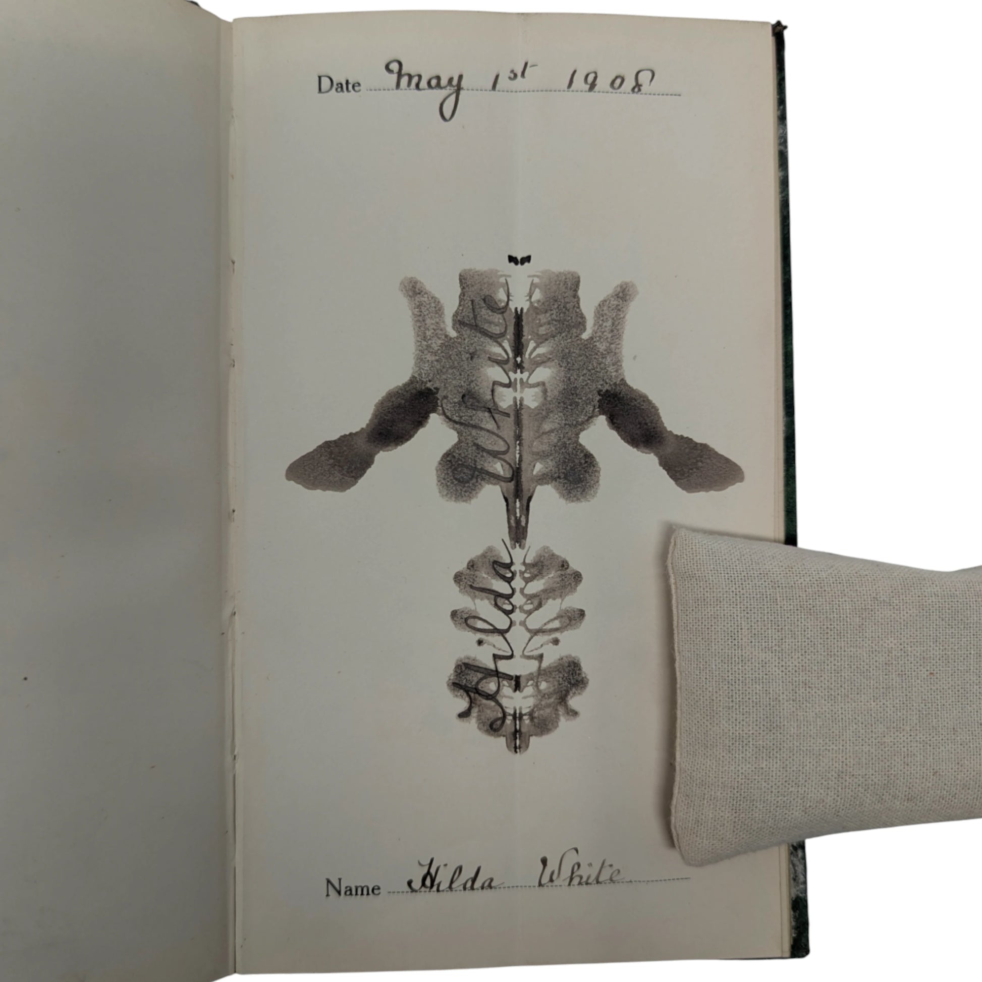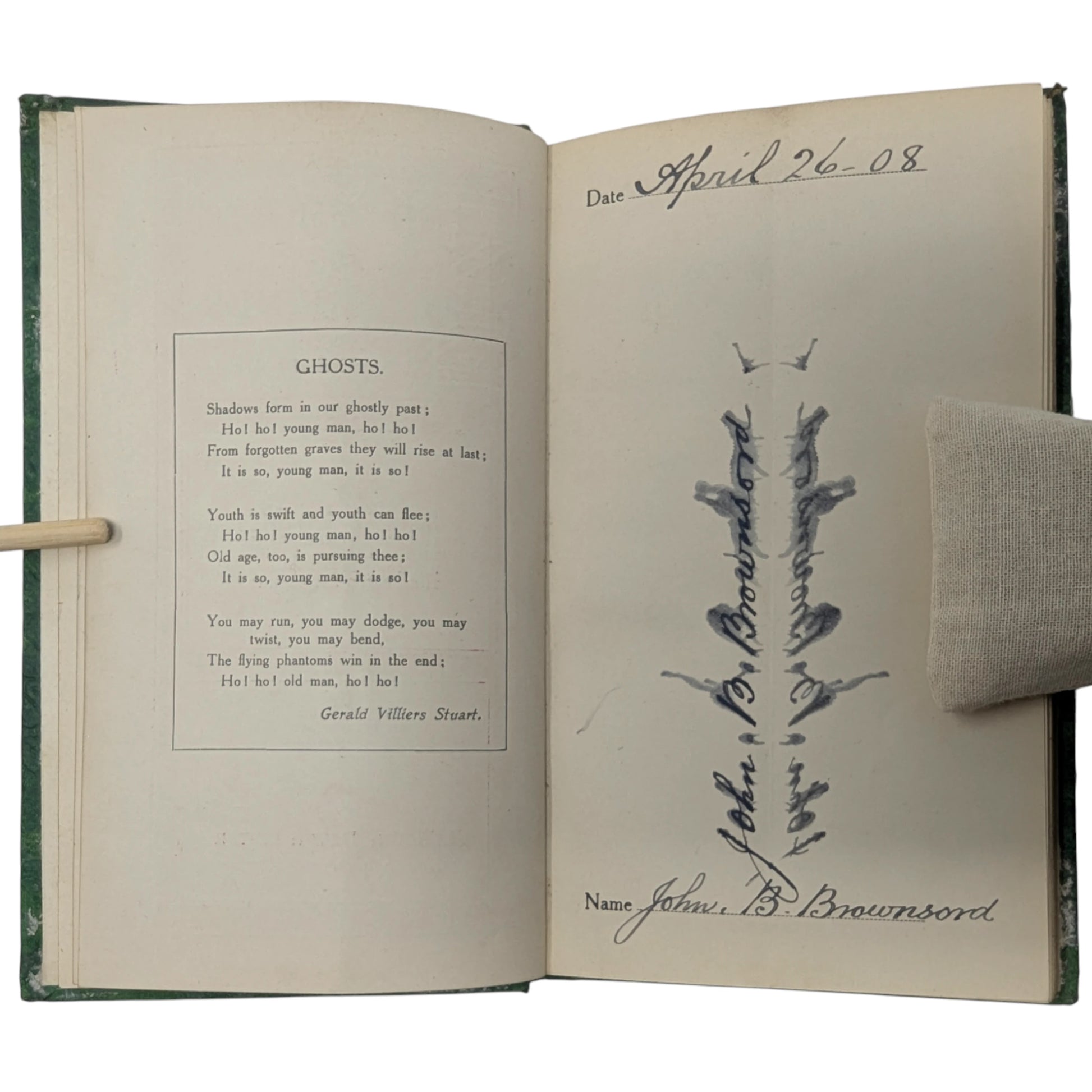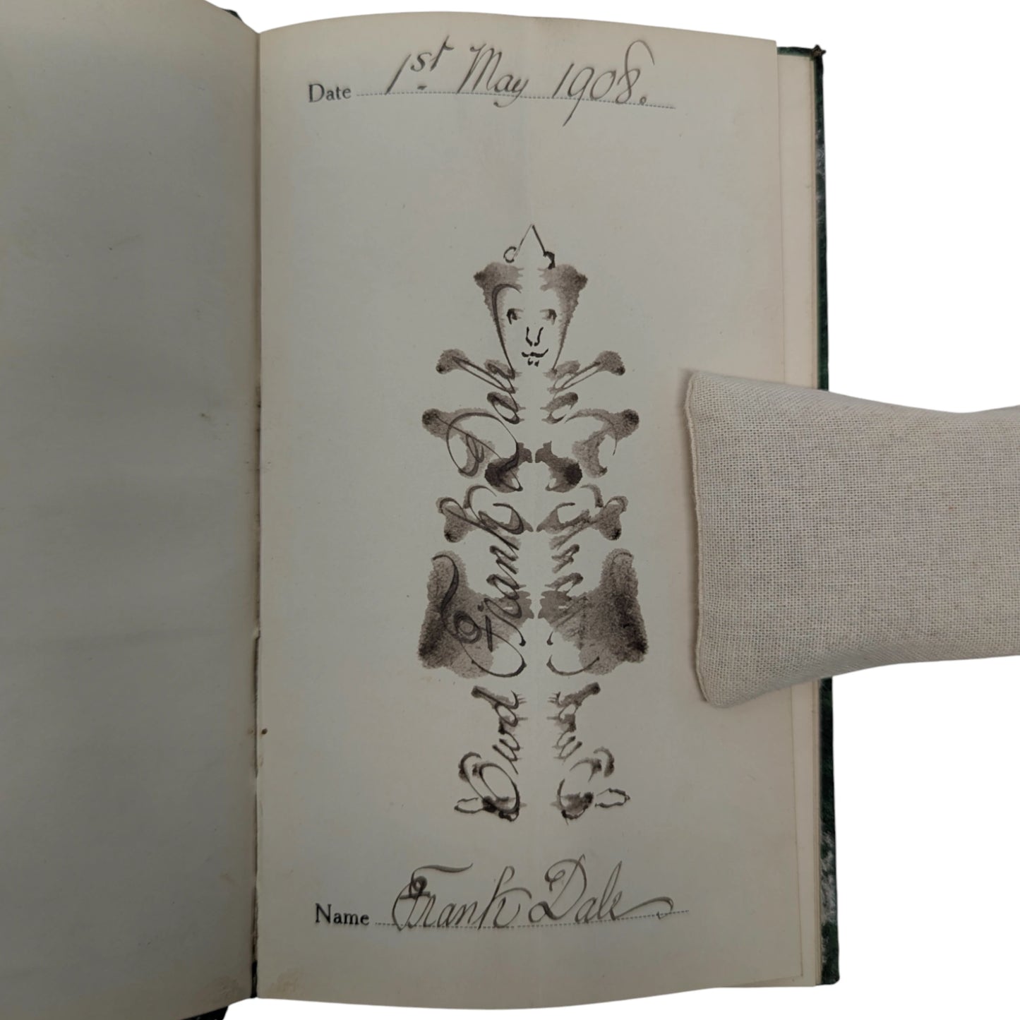 Arranged by Cecil Henland, 'The Ghost Of My Friends' is an autograph book of 'Ghost Signatures' that enjoyed a surge of popularity during the early 1900s. To create the effect, a person would sign along the fold of the paper with a fountain pen, and the paper was then folded back upon itself. The slow-drying India ink created Rorschach - like inkblots test. In this volume is an array of strange and lovely forms created by 38 pages of signatures from 1908 to 1918, with a few left blank.