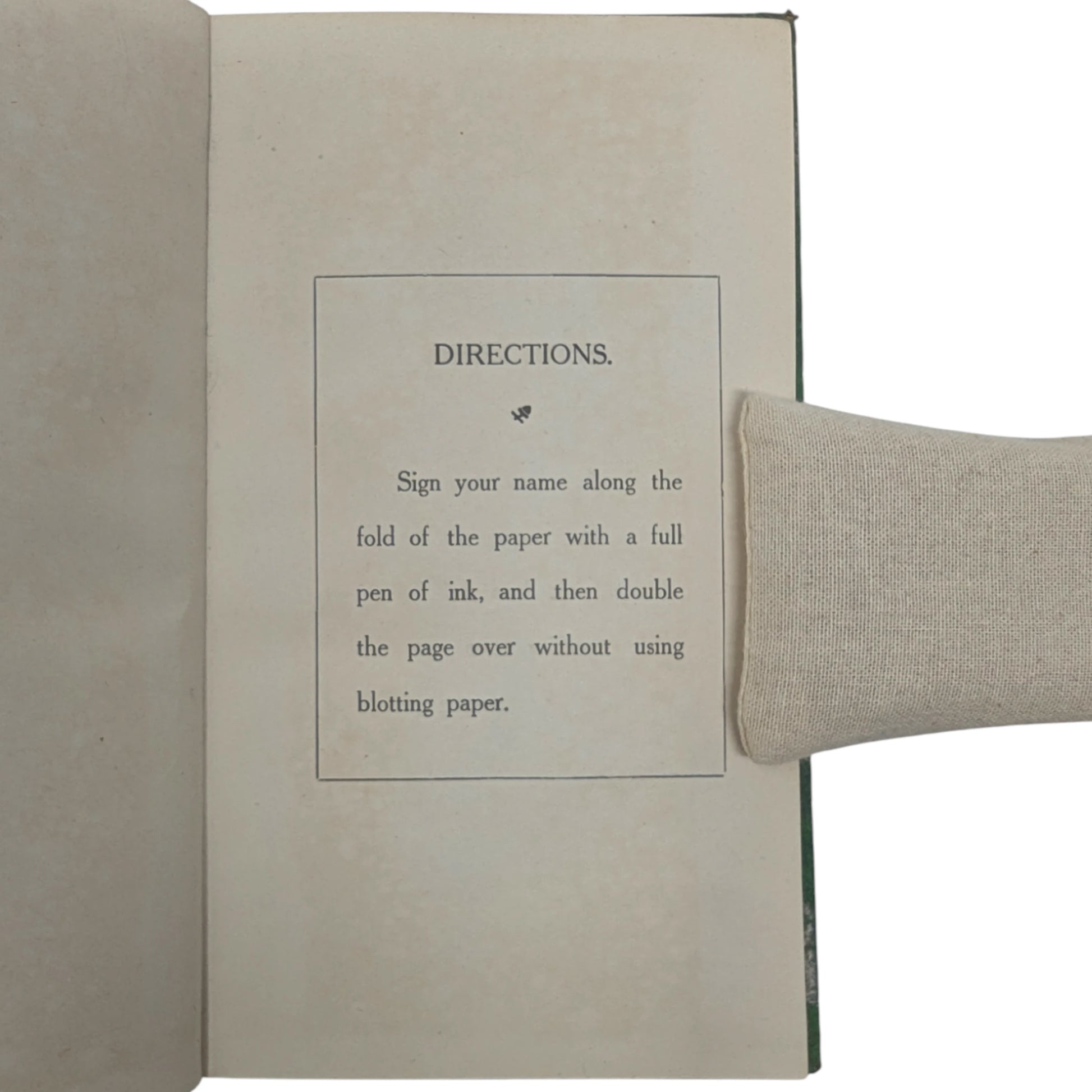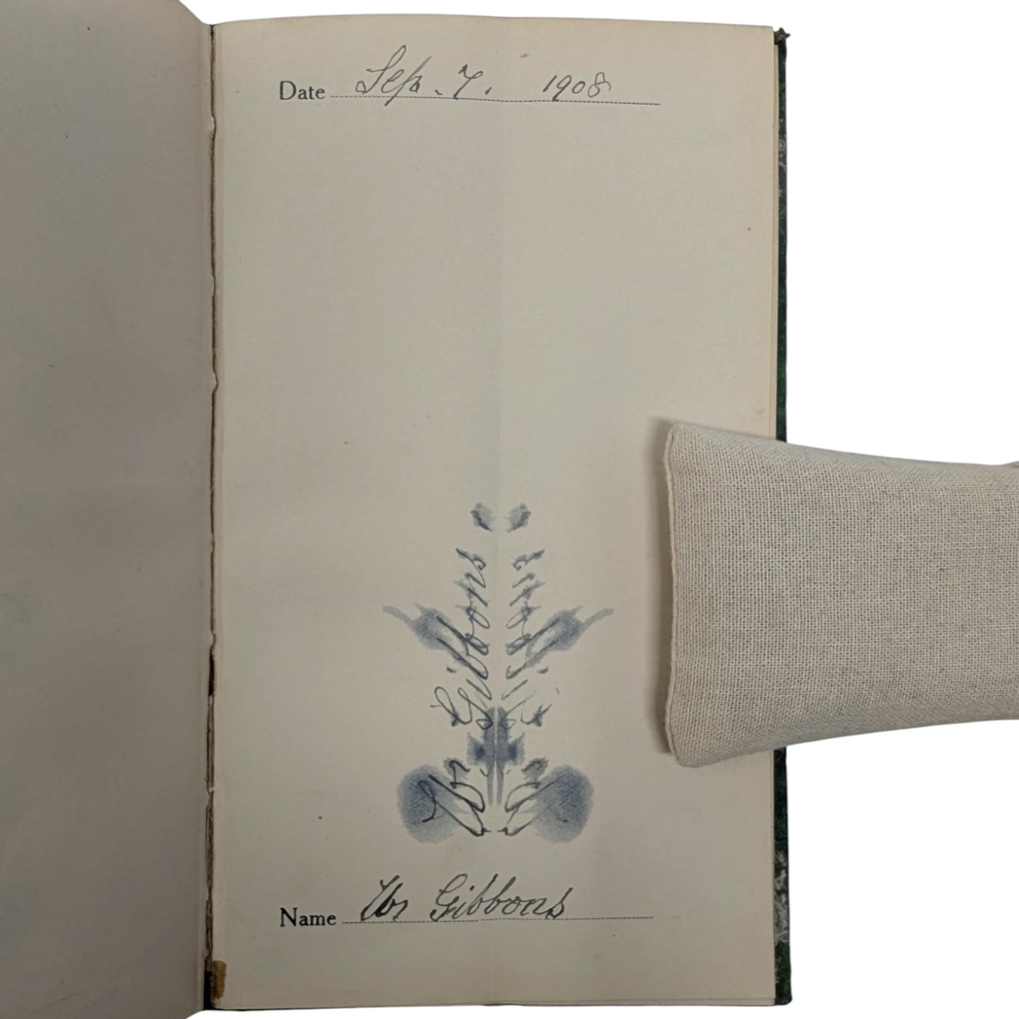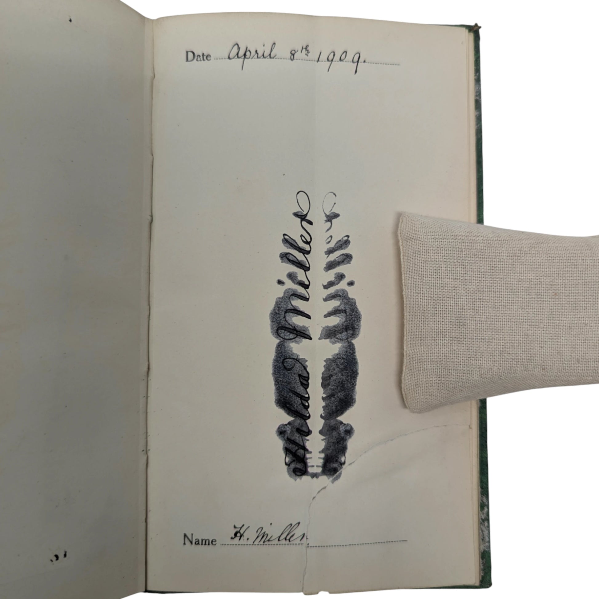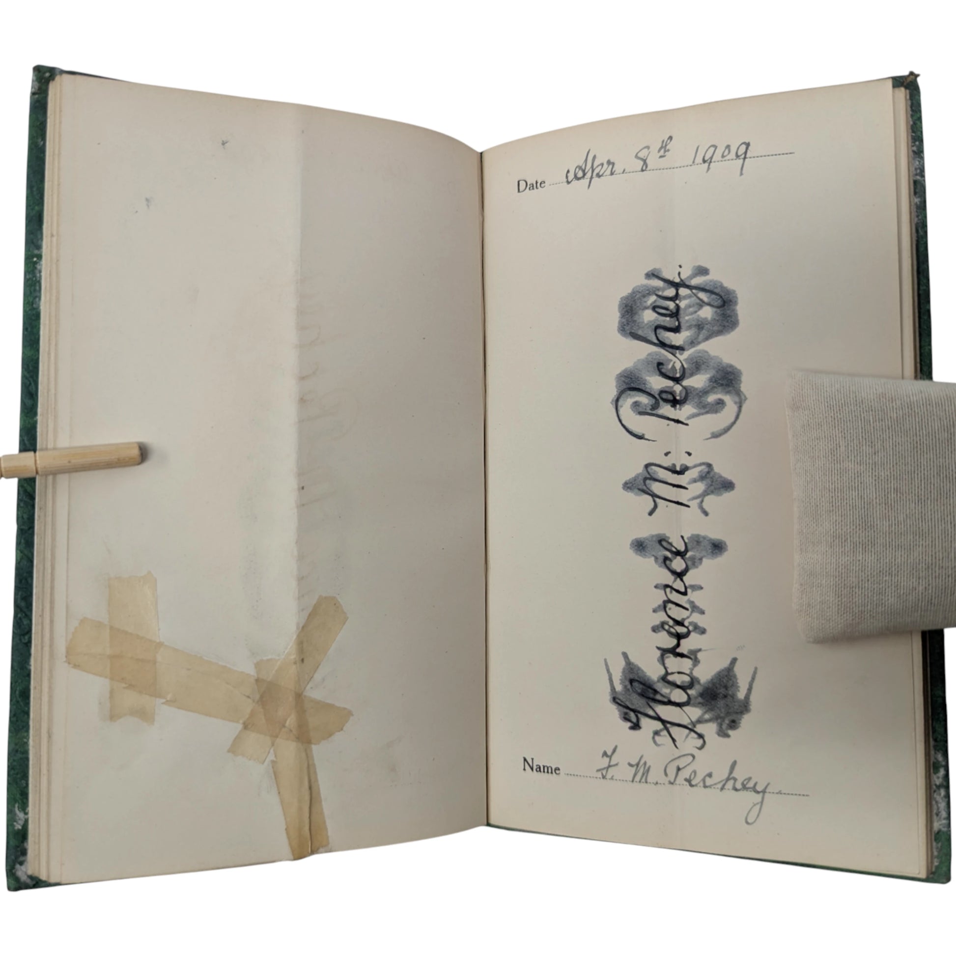 Arranged by Cecil Henland, 'The Ghost Of My Friends' is an autograph book of 'Ghost Signatures' that enjoyed a surge of popularity during the early 1900s. To create the effect, a person would sign along the fold of the paper with a fountain pen, and the paper was then folded back upon itself. The slow-drying India ink created Rorschach - like inkblots test. In this volume is an array of strange and lovely forms created by 38 pages of signatures from 1908 to 1918, with a few left blank.