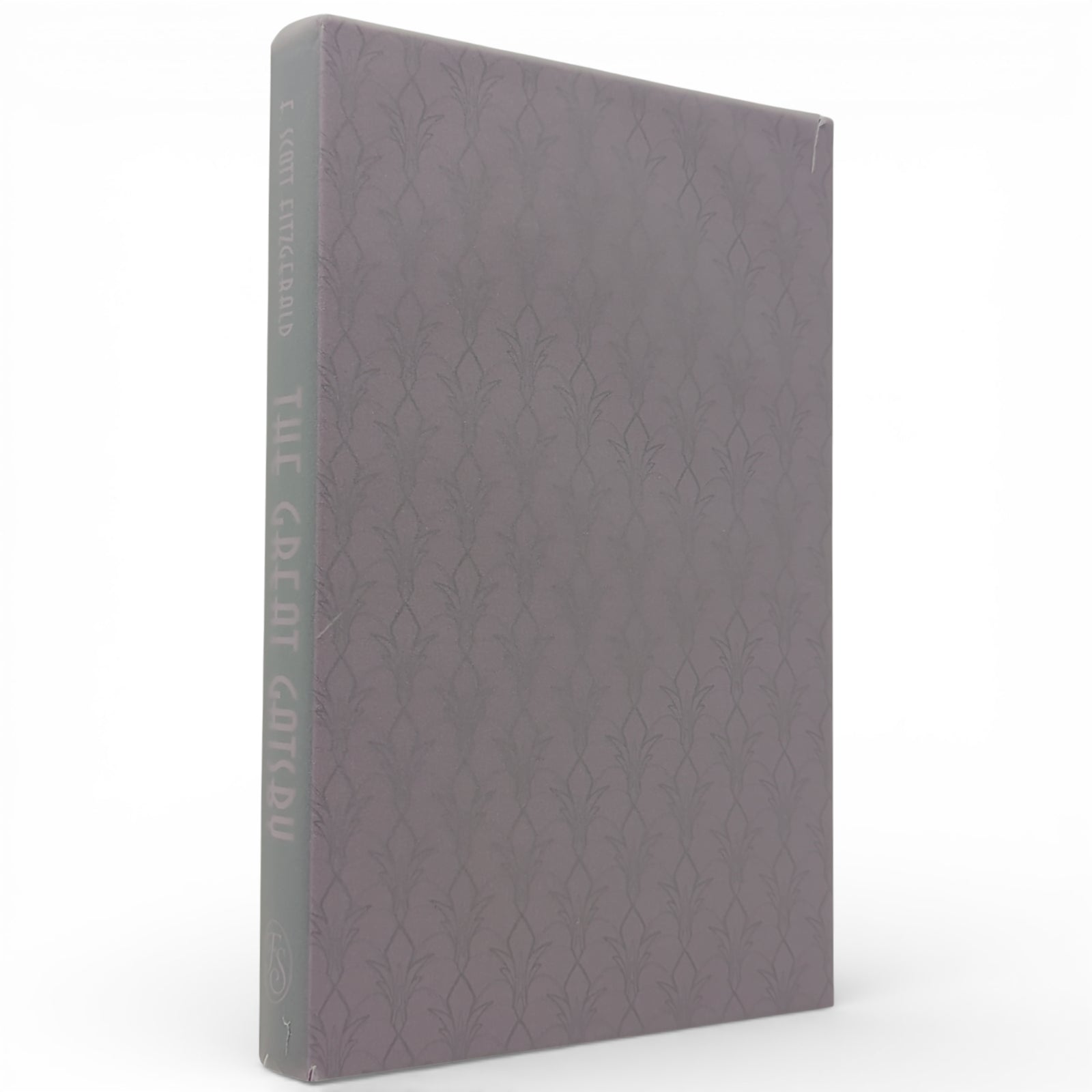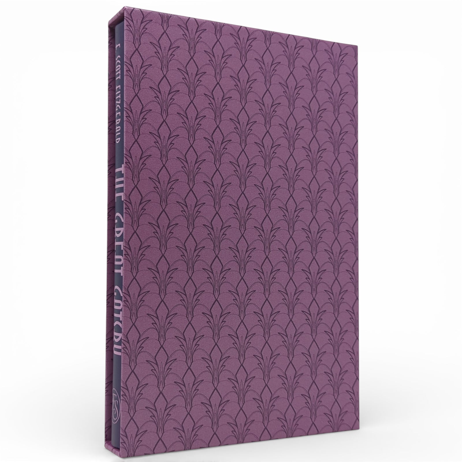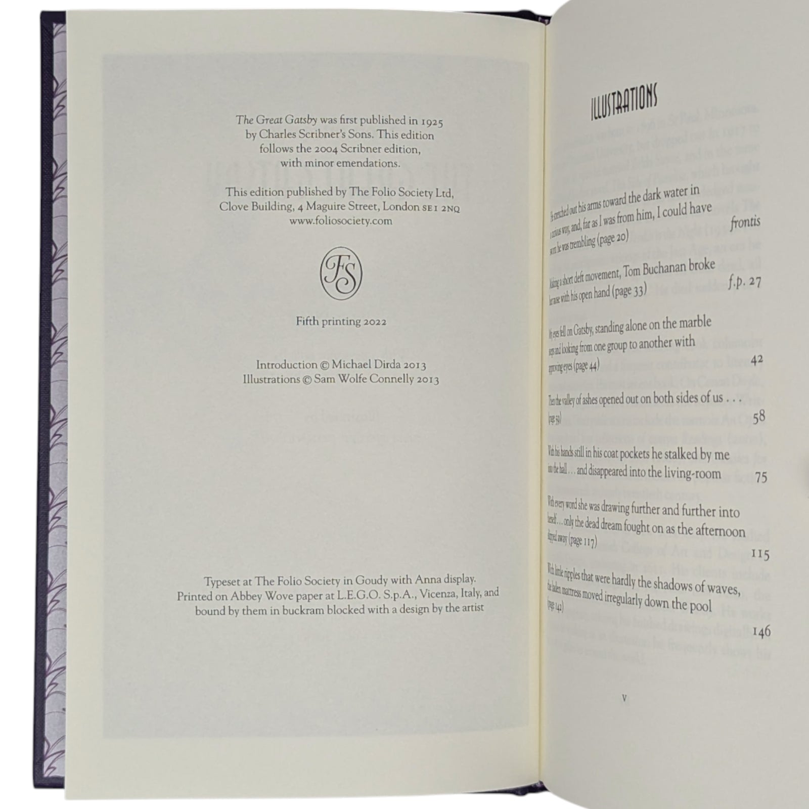 F. Scott Fitzgerald, The Great Gatsby. London: The Folio Society, 2013. Fifth printing thus, 2022. Introduced by Michael Dirda, with a personal note by Francis Ford Coppola, illustrated by Sam Wolfe Connelly. 229 × 150 × 22 mm. Pp. [i–iv] v–xx [xxi–xxii], [1–2] 3–158 [159–162]: [7] leaves of colour plates (facing pp. [iii], 27, 42, 58, 75, 115 and 146). Type: Goudy with Anna for display. Printed and bound by L.E.G.O. in full dark purple buckram blocked with a design in black and pink by the artist; metallic pale pink endleaves printed with repeat pattern in dark purple. Metallic dark pink slip case printed in unison with endleaves.