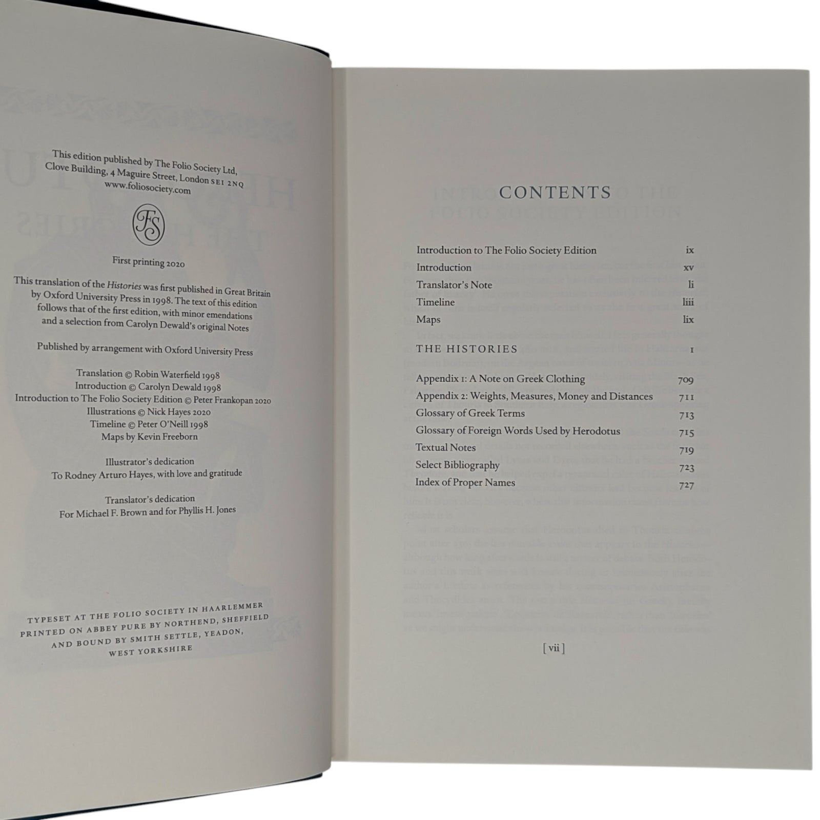 Bound by Smith Settle in Yorkshire in full-grain leather blocked in gold and black foils with a design by Nick Hayes. Limitation tip blocked in gold foil signed by Robin Waterfield, Nick Hayes and Peter Frankopan. Translated by Robin Waterfield. Introduced by Peter Frankopan. Editorial material by Carolyn Dewald Frontispiece and nine two-colour illustrations by Nick Hayes. Two two-colour maps. 824 pages set in Haarlemmer. Printed on Abbey Pure paper. Woodstock endpapers printed in gold with a design by Nick Hayes. Gilded page tops. Ribbon marker. 11½" x 8". Presented in a cloth-covered slipcase blocked with a design by Nick Hayes Slipcase lining printed with a design by Nick Hayes.