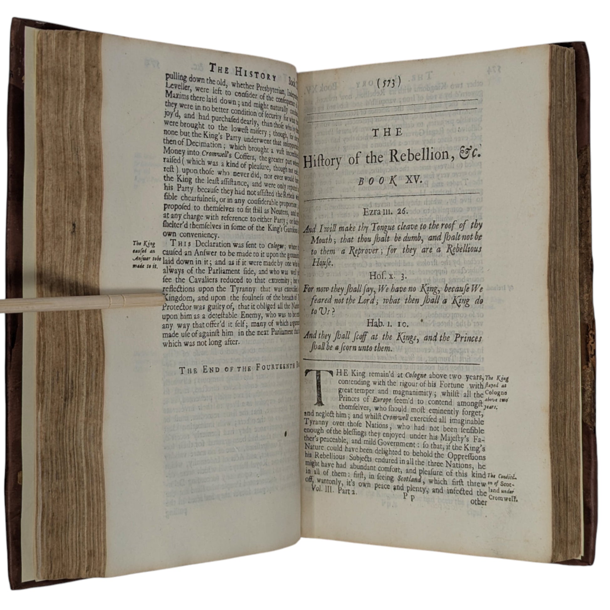 The History of the Rebellion is Edward Hyde’s firsthand chronicle of the English Civil War. In it, he records and critiques the strategies employed by both Royalist and Parliamentary forces; though a Royalist himself, Hyde was often scathing in his assessment of Royalist commanders and deeply shocked by the execution of Charles I. When Charles II sought to reclaim the throne, Hyde joined him, becoming his chief adviser and later Lord Chancellor. He believed the Stuart monarchs’ greatest failing was allowing their sound judgement to be undermined by the influence of court favourites. Recognised as one of the most important historians of his era, Hyde’s work proved highly influential on publication. He was also the grandfather of Queens Mary II and Anne.