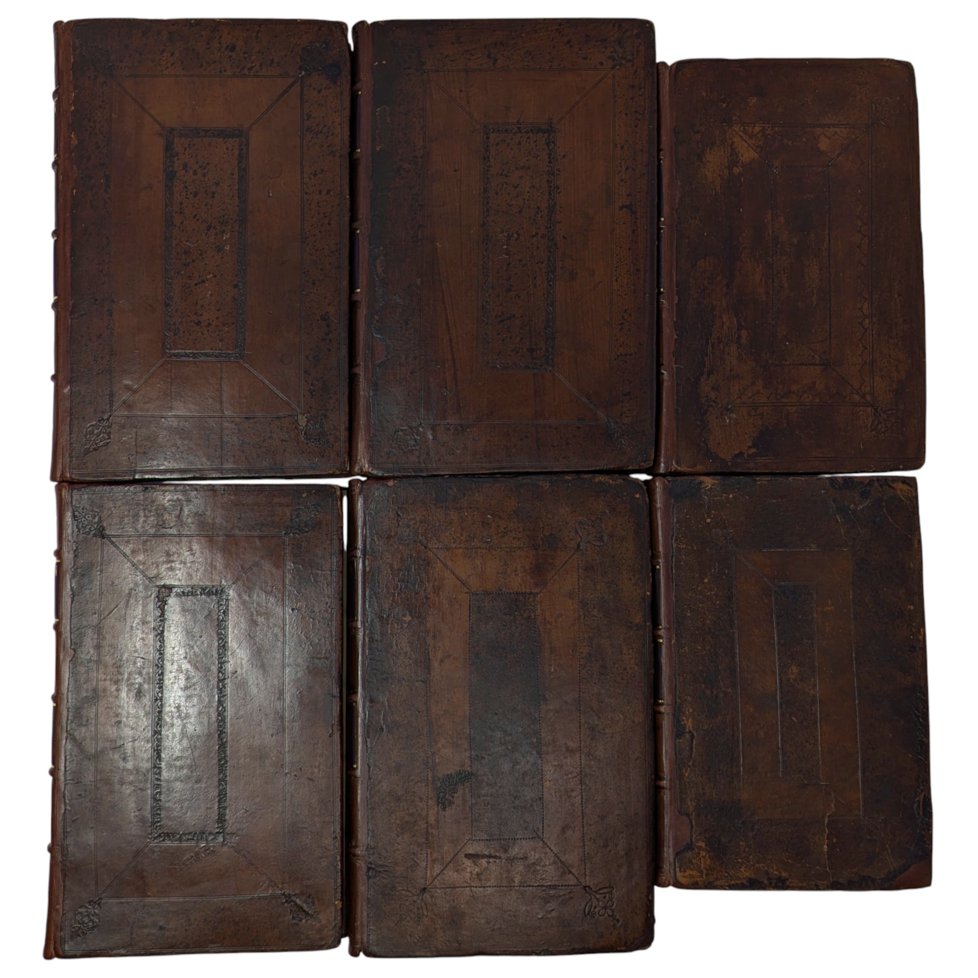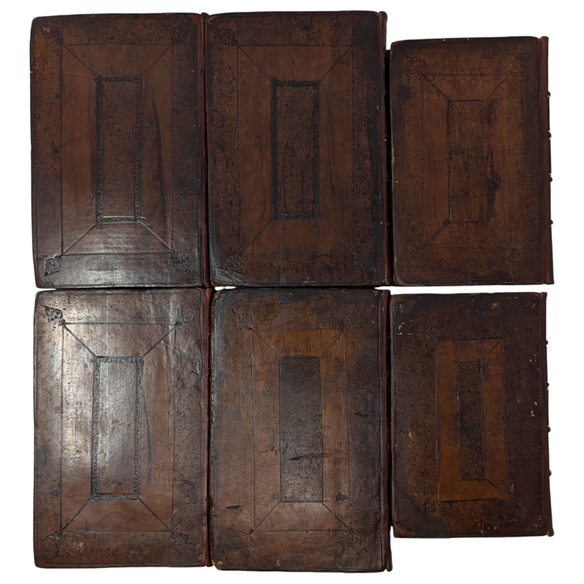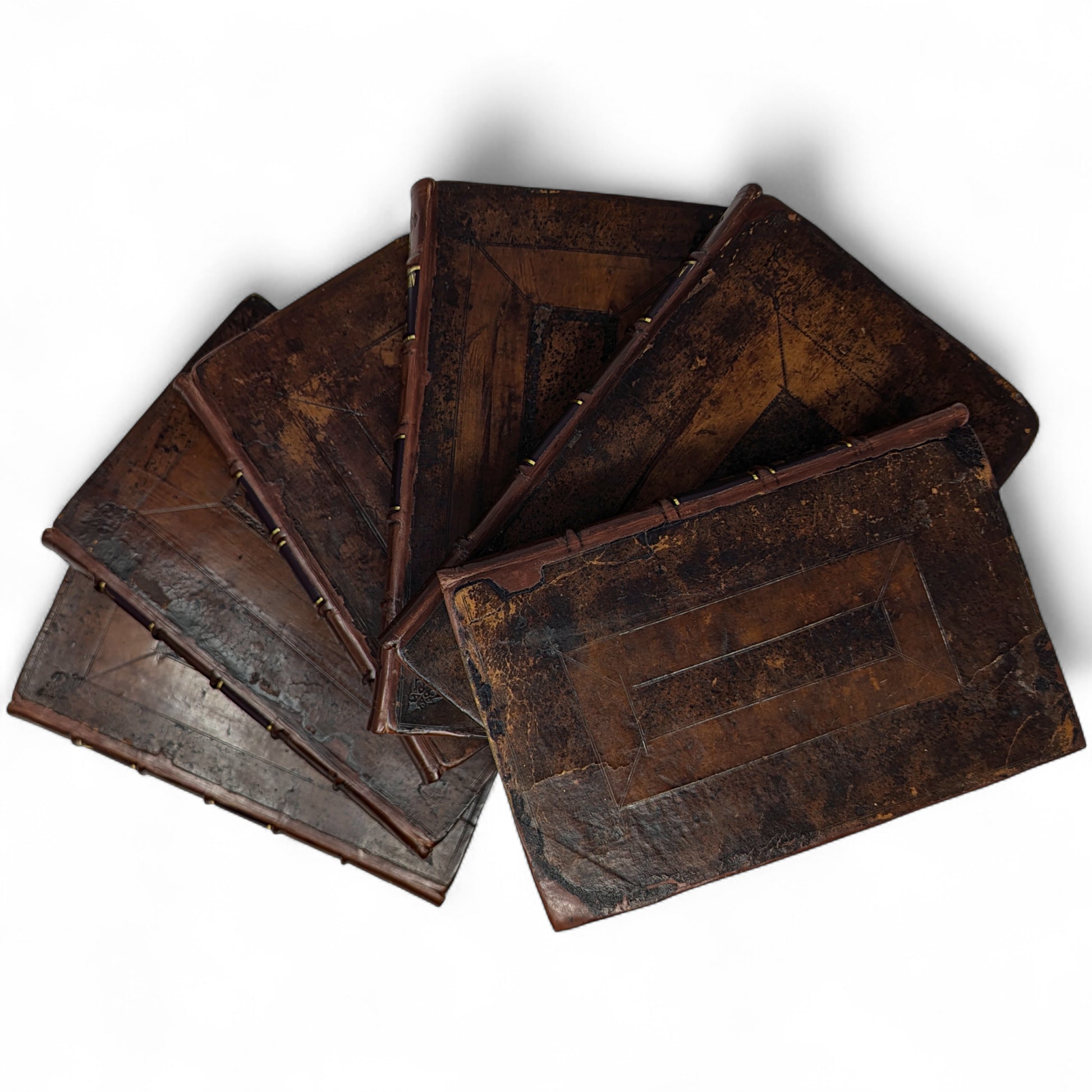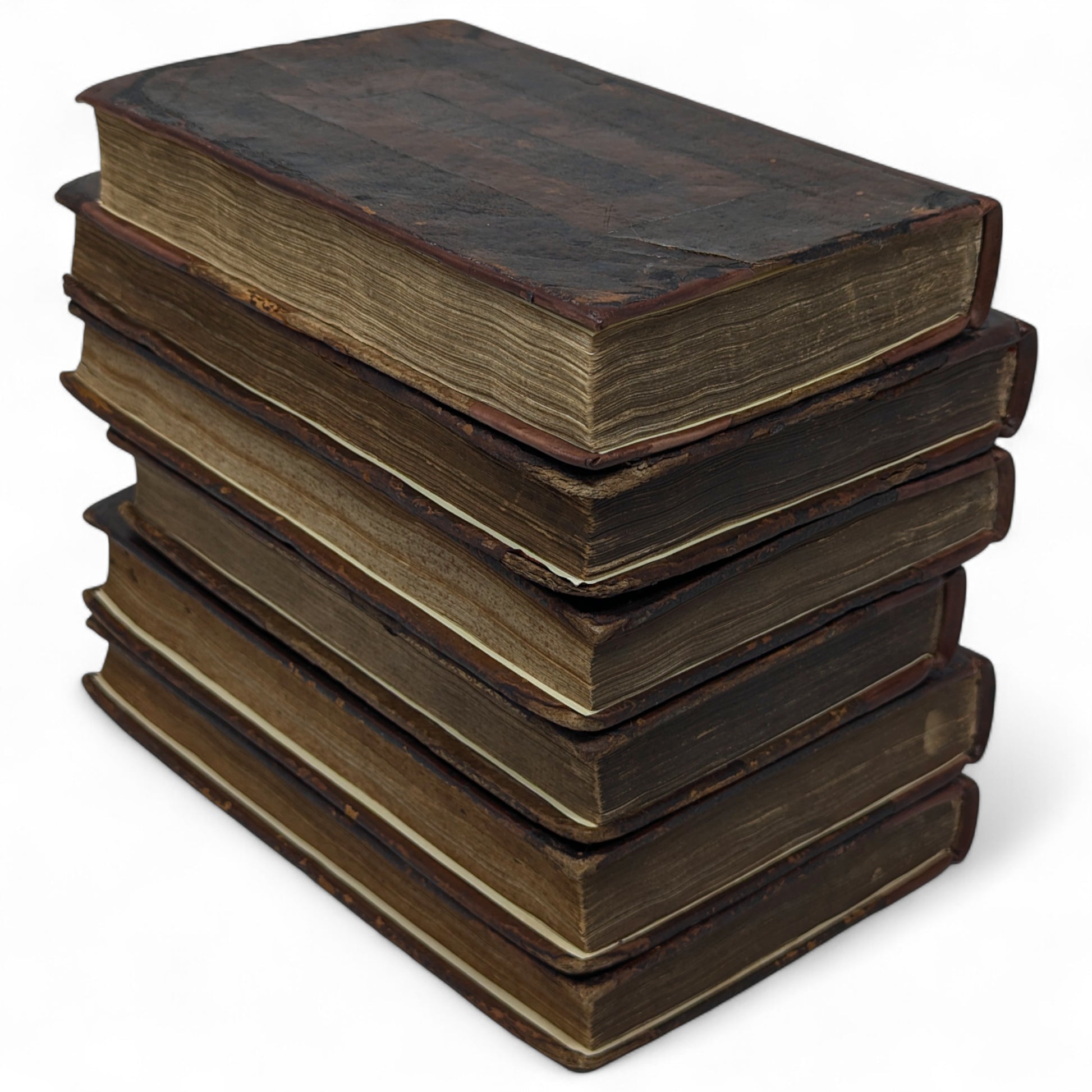 Contemporary panelled calf, black morocco labels to spines, five raised bands to the four taller volumes, four to the two shorter ones, ruling to label compartments, blind tooling to others, top edge coloured on three volumes (perhaps discoloured to the others). Professionally repaired with the original boards retained and superimposed, and new endpapers.