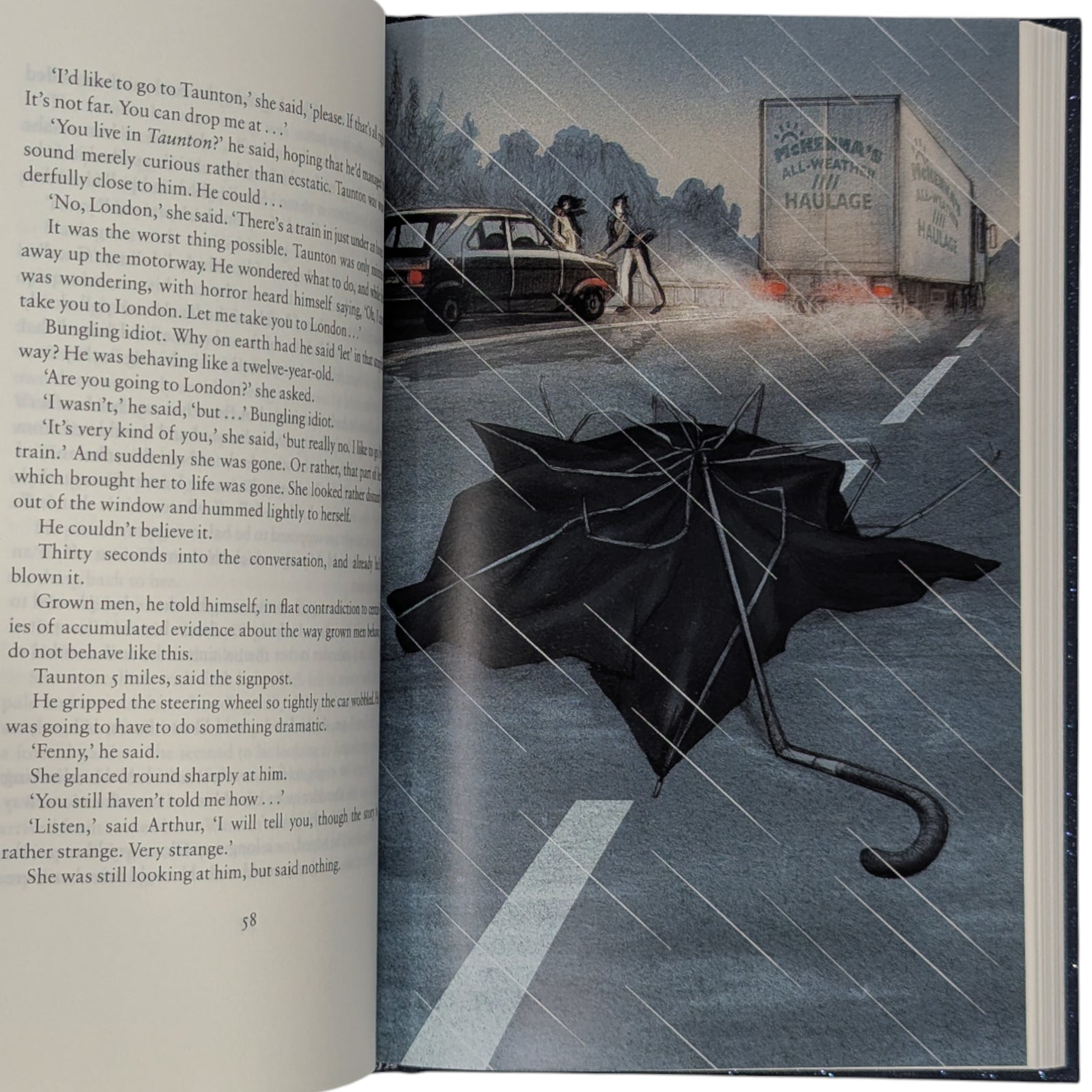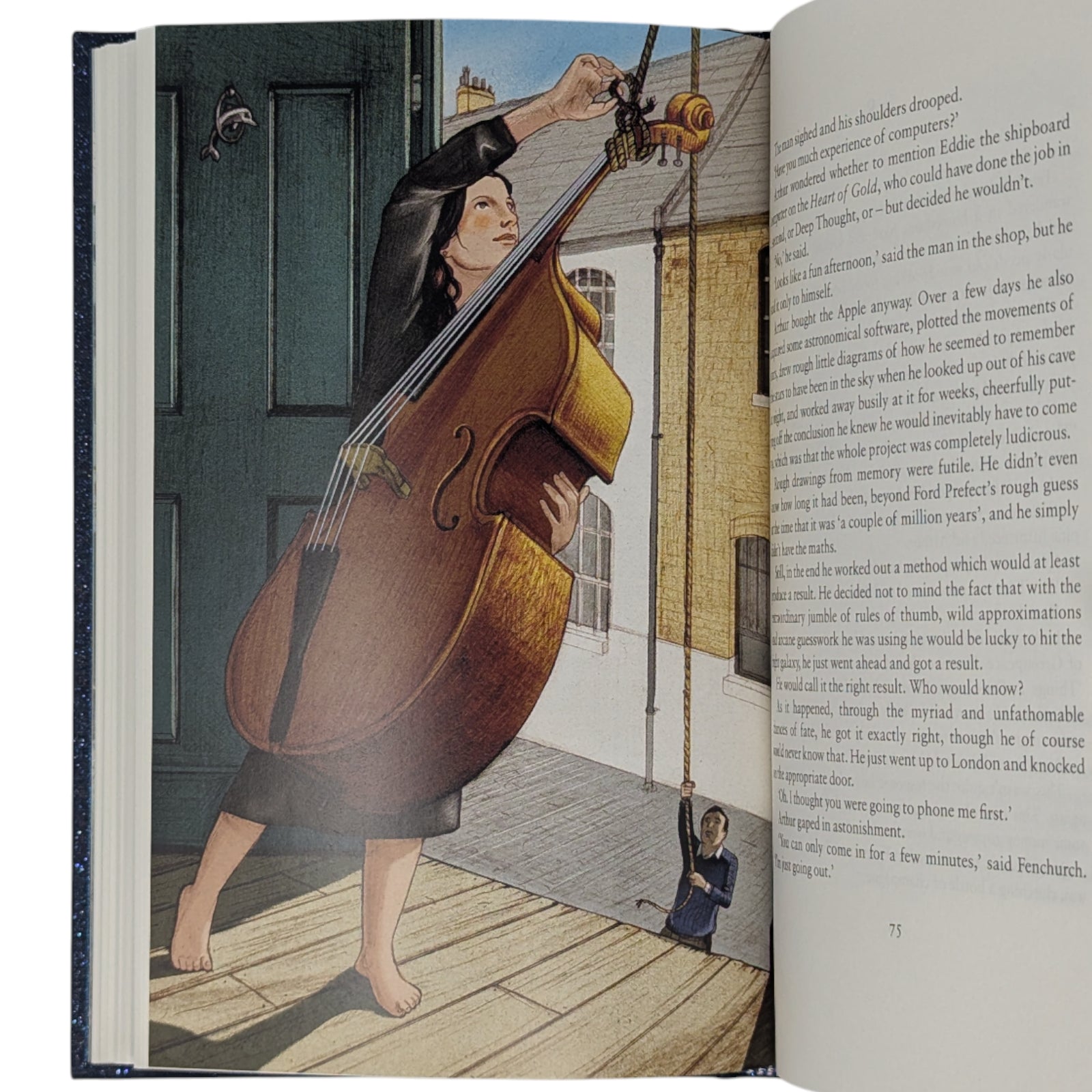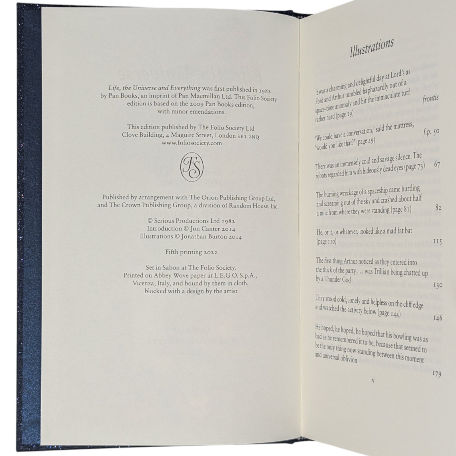- Life, the Universe and Everything, by Douglas Adams. London: The Folio Society, 2014. Fifth printing thus, 2022. Introduced by Jon Canter, illustrated by Jonathan Burton. 228 × 151 × 24 mm. Pp. [i–iv] v–xiii [xiv], [1–4] 5–194: [8] leaves of colour plates (facing pp. [iii], 50, 67, 82, 115, 130, 146 and 179). Type: Sabon. Printed and bound by L.E.G.O. in full dark blue cloth flecked with metallic greens, blocked with design in silver and metallic green by Burton; metallic blue endleaves. Metallic blue slip case. Burton’s work was shortlisted in the 2015 V&A Illustration Awards.