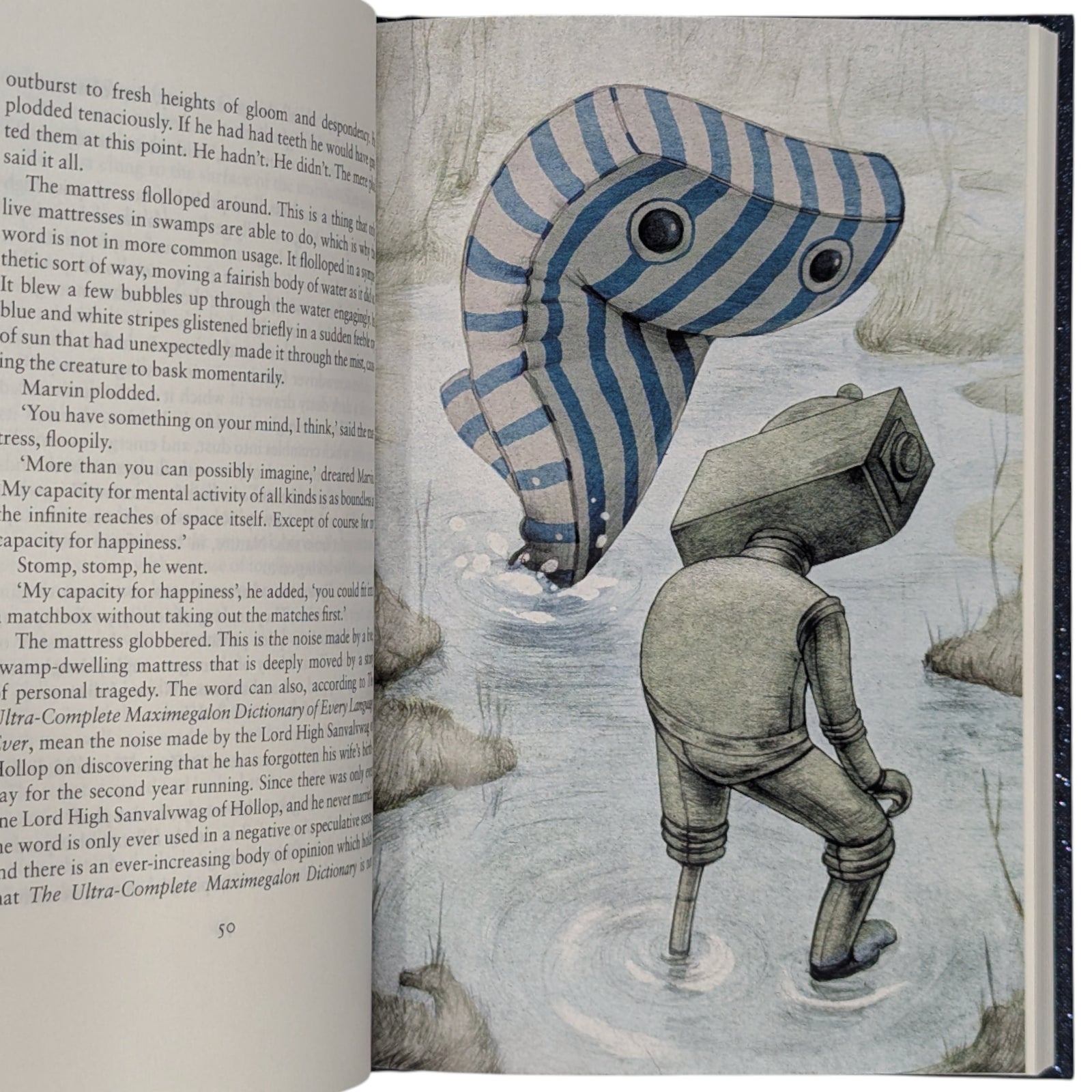 The Hitchhiker's Guide to the Galaxy: A Trilogy in Five Parts. The complete collection of Douglas Adams' five Hitch-Hiker's series novels published by The Folio Society between 2010 and 2016, illustrated by Jonathan Burton, all later printings.