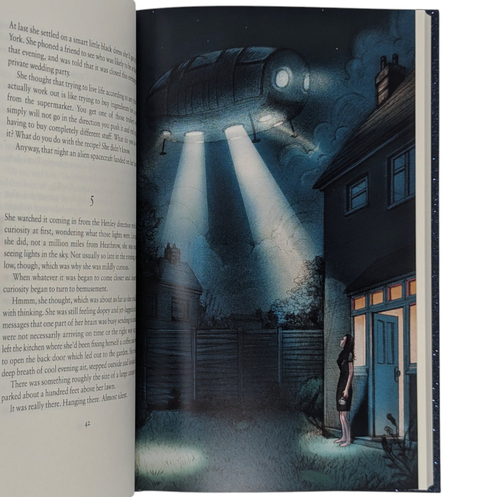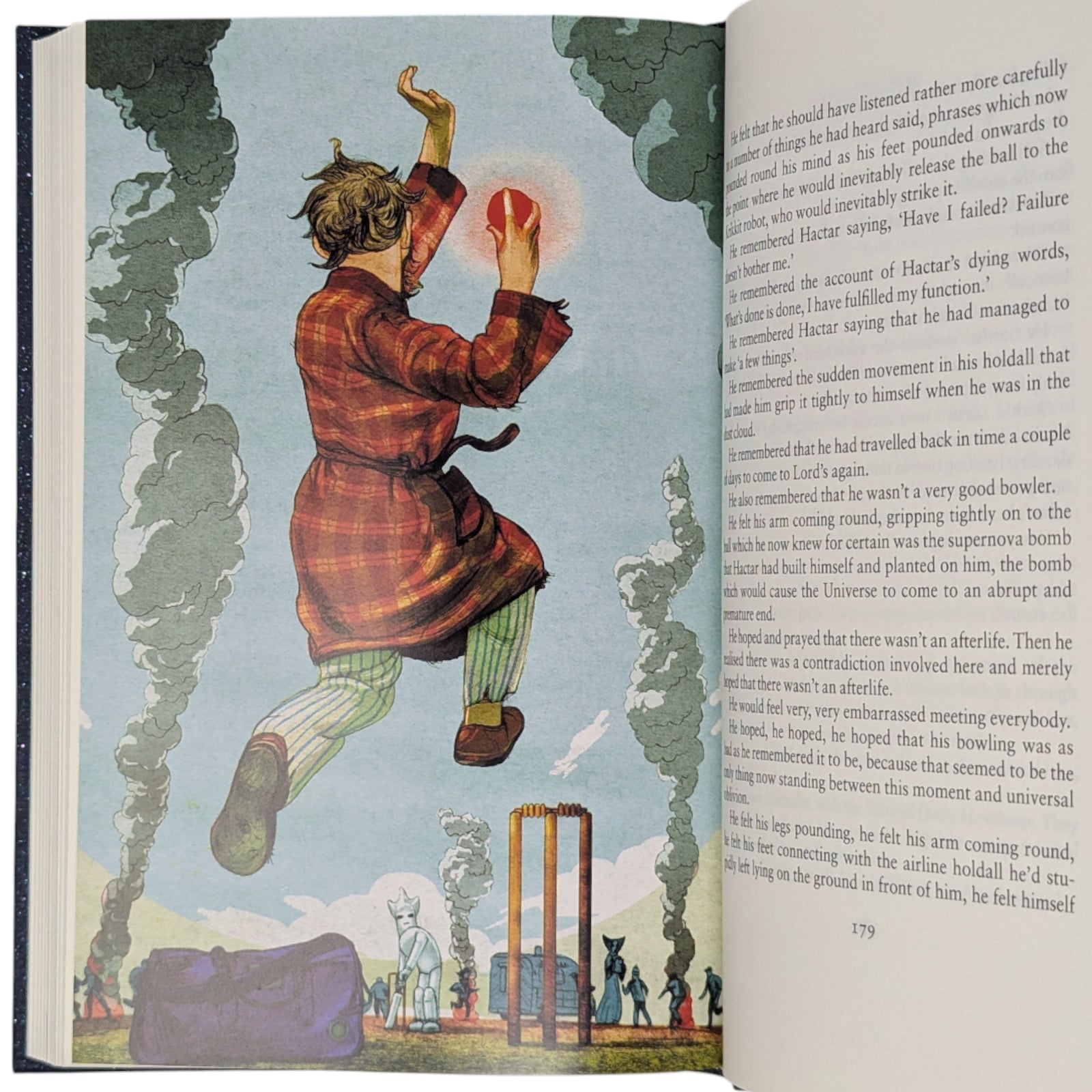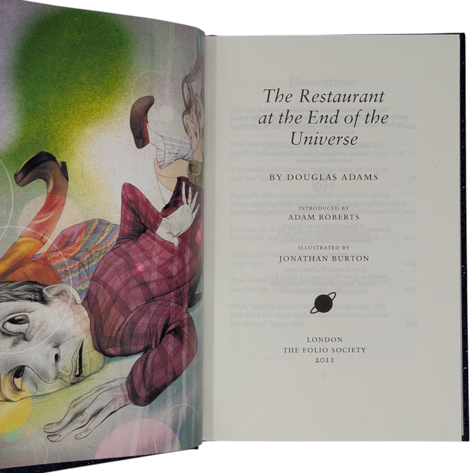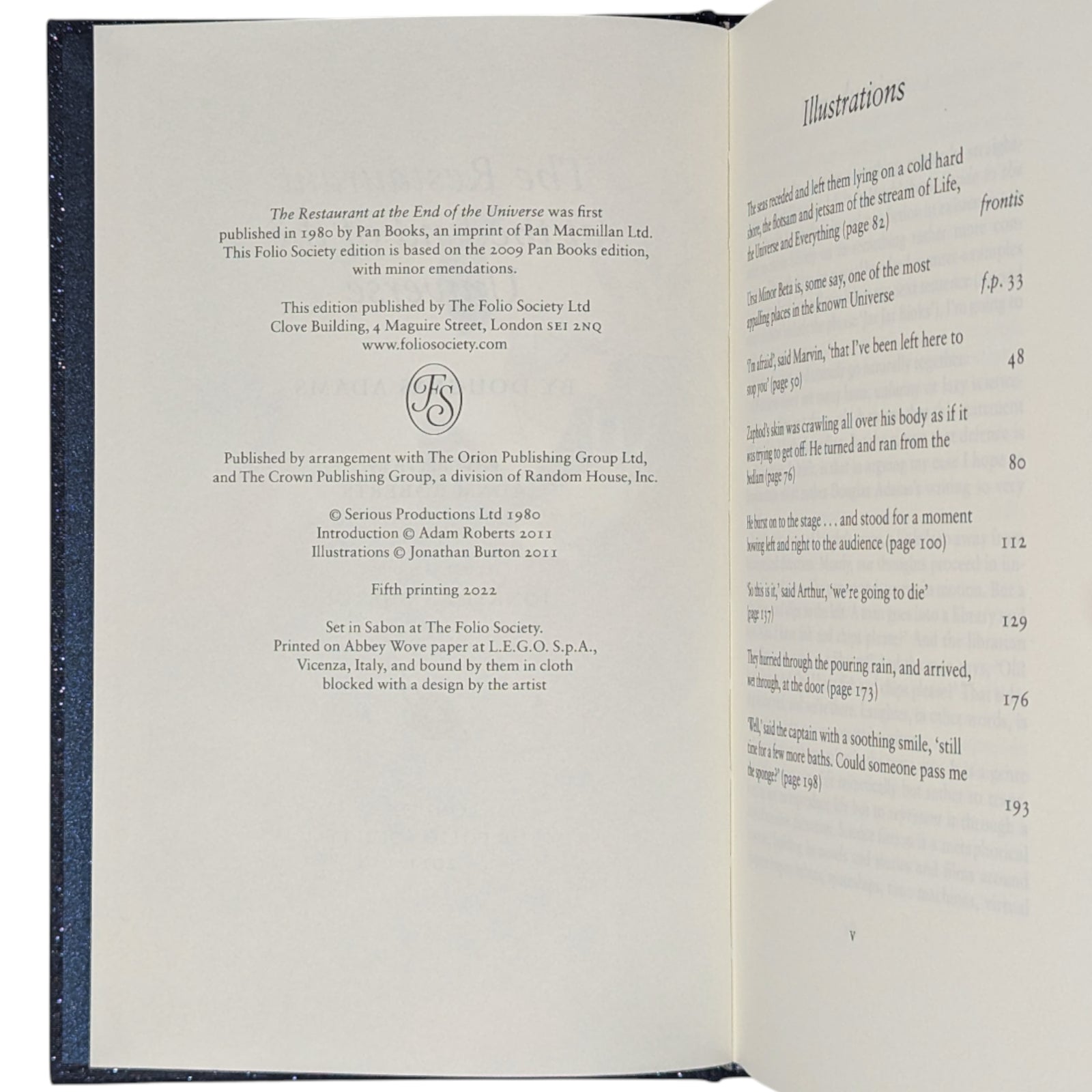 - The Restaurant at the End of the Universe, by Douglas Adams. London: The Folio Society, 2011. Fifth printing thus, 2022. Introduced by Adam Roberts, illustrated by Jonathan Burton. 228 × 149 × 23 mm. Pp. [i–iv] v–xvi, [1–8] 9–208: [8] leaves of colour plates (facing pp. [iii], 33, 48, 80, 112, 129, 176 and 193). Type: Sabon. Printed and bound by L.E.G.O. in full dark blue cloth flecked with metallic greens, blocked with design in gold and silver by Burton; metallic blue endleaves. Metallic blue slip case.