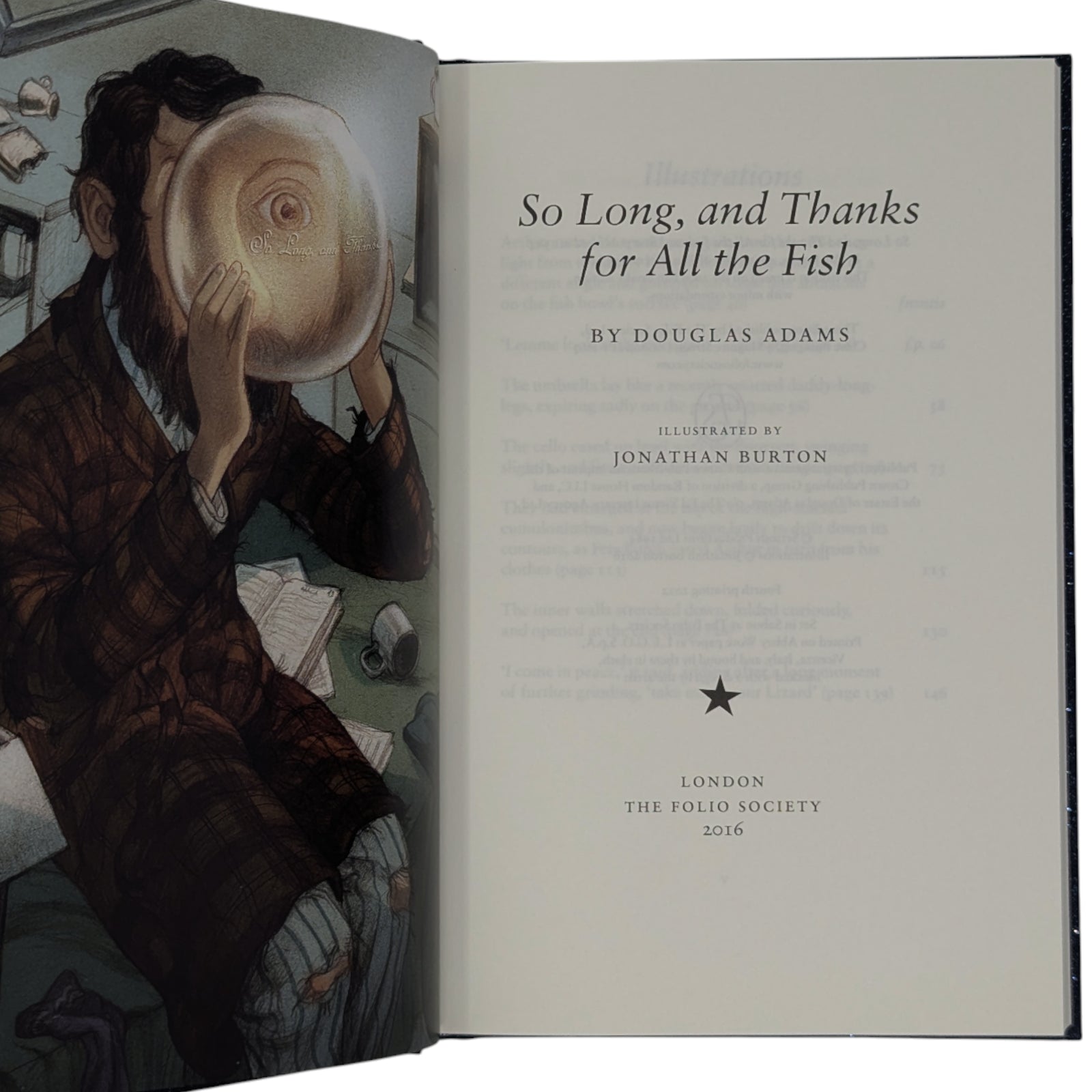 - So Long, and Thanks for All the Fish, by Douglas Adams. London: The Folio Society, 2016. Fourth printing thus, 2022. Illustrated by Jonathan Burton. 228 × 150 × 20 mm. Pp. [i–iv] v [vi], [1–4] 5–158 [159–162]: [7] leaves of colour plates (facing pp. [iii], 26, 58, 75, 115, 130 and 146). Type: Sabon. Printed and bound by L.E.G.O. in full dark blue cloth flecked with metallic greens, blocked with design in silver and metallic blue by Burton; metallic blue endleaves. Metallic blue slip case.