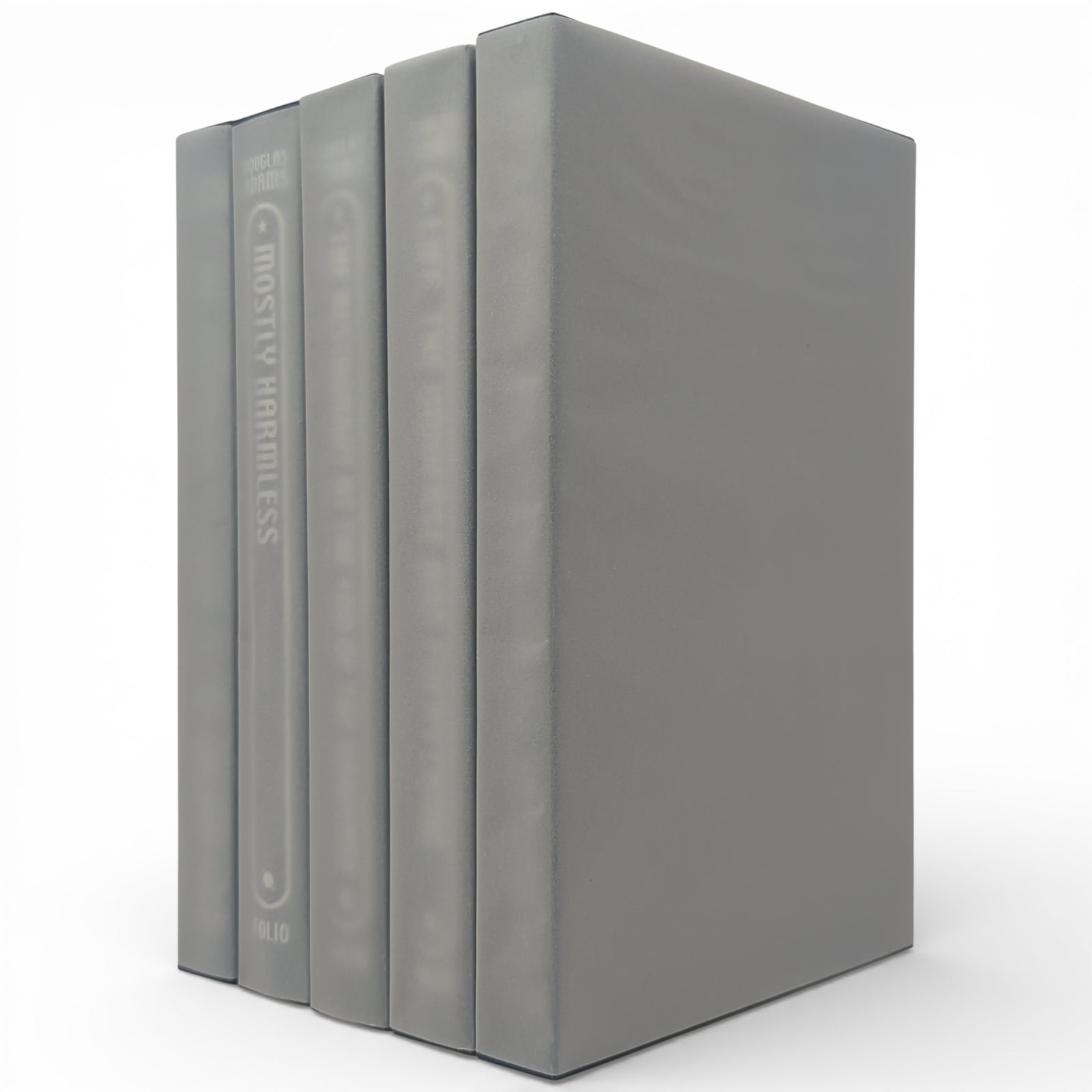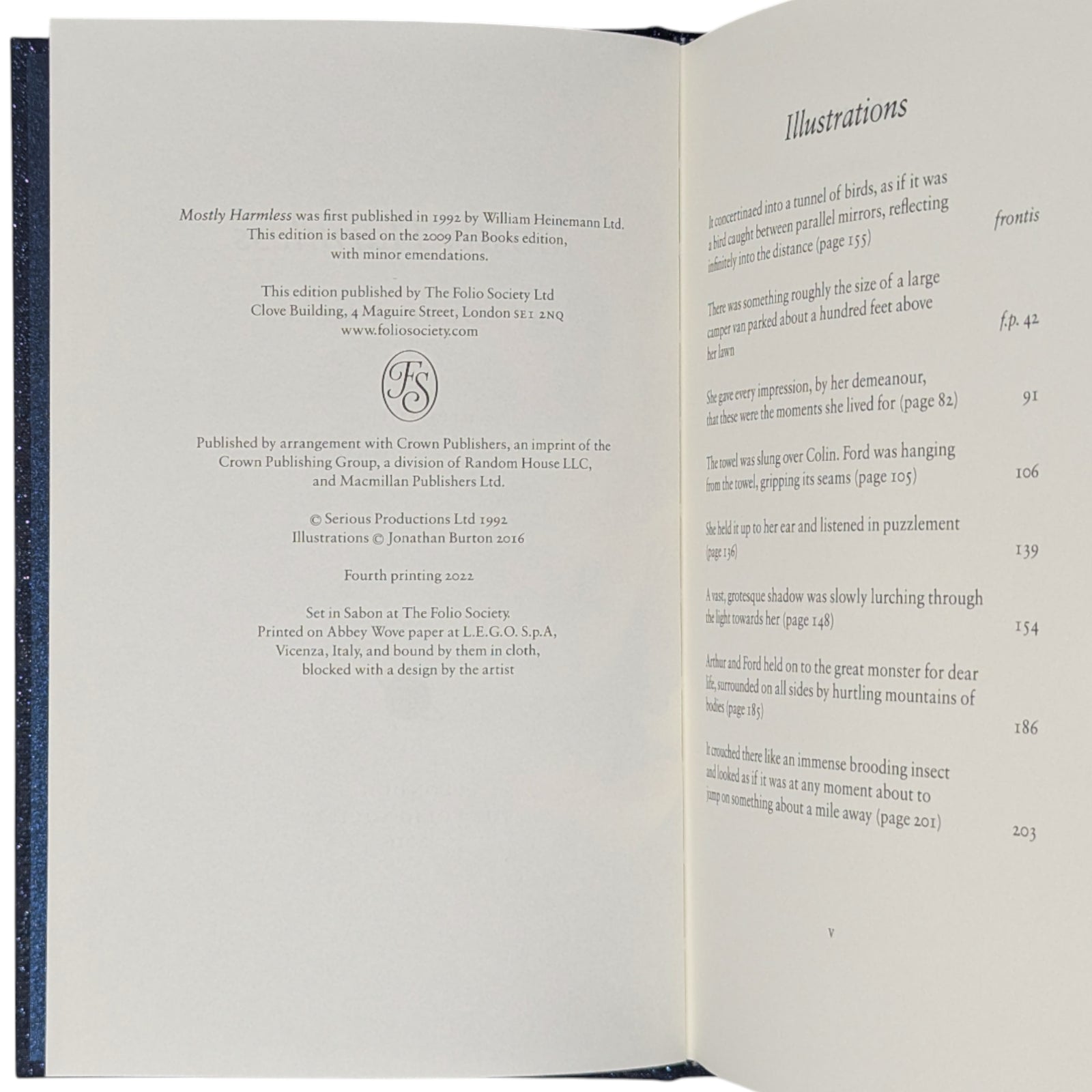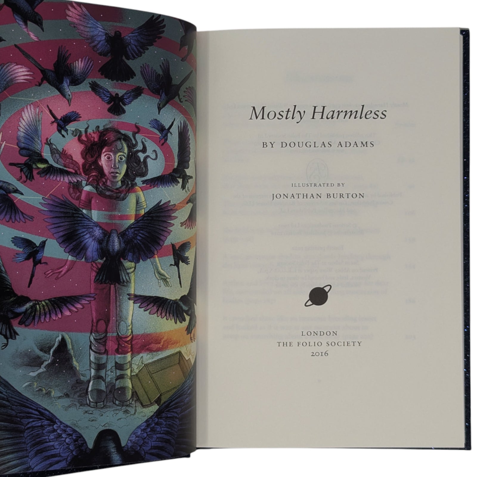 - Mostly Harmless, by Douglas Adams. London: The Folio Society, 2016. Fourth printing thus, 2022. Illustrated by Jonathan Burton. 228 × 150 × 26 mm. Pp. [i–iv] v [vi], [1–12] 13–221 [222–226]: [8] leaves of colour plates (facing pp. [iii], 42, 91, 106, 139, 154, 186 and 203). Type: Sabon. Printed and bound by L.E.G.O. in full dark blue cloth flecked with metallic greens, blocked with design in silver and metallic red by Burton; metallic blue endleaves. Metallic blue slip case. The final volume of Adams’s universe-spanning odyssey.