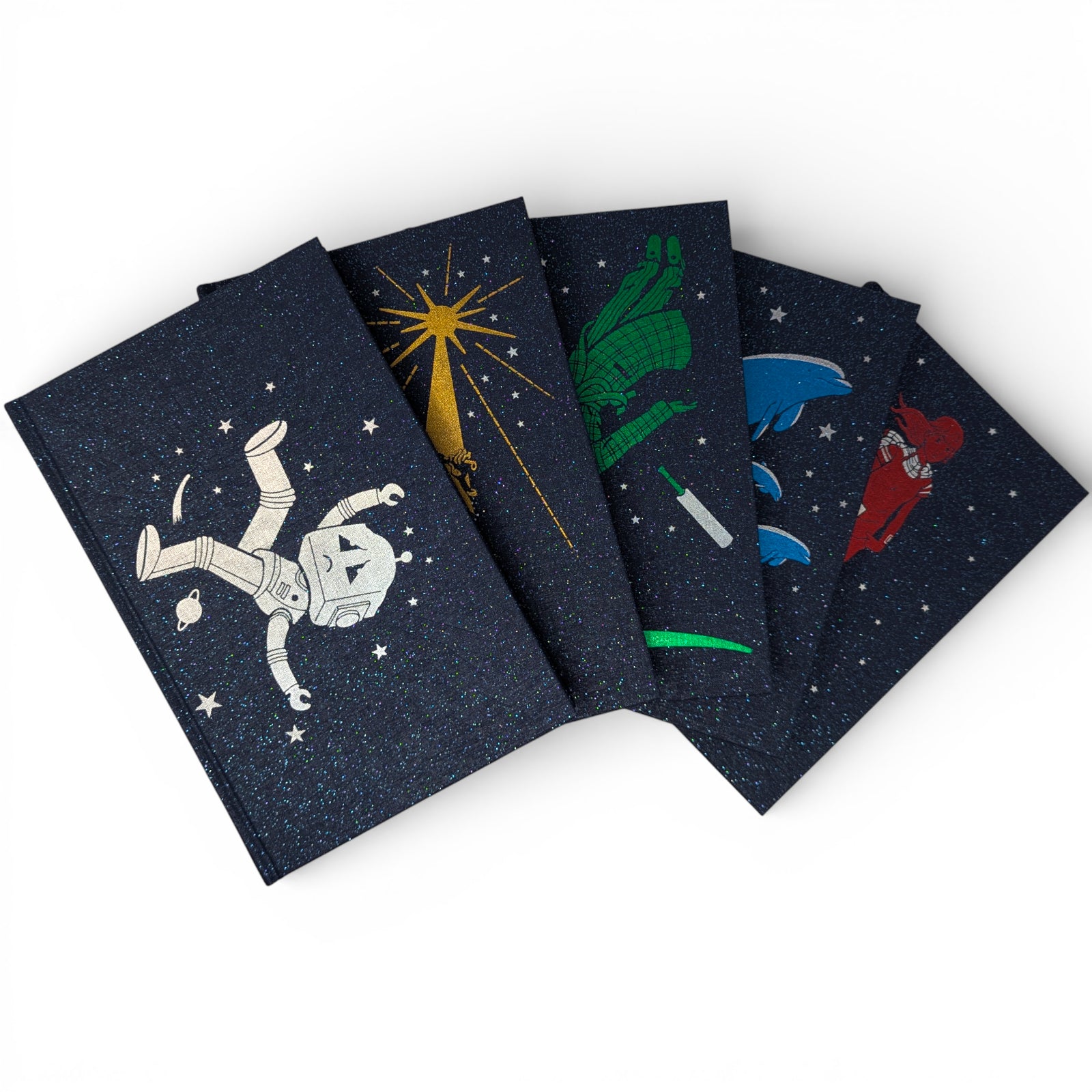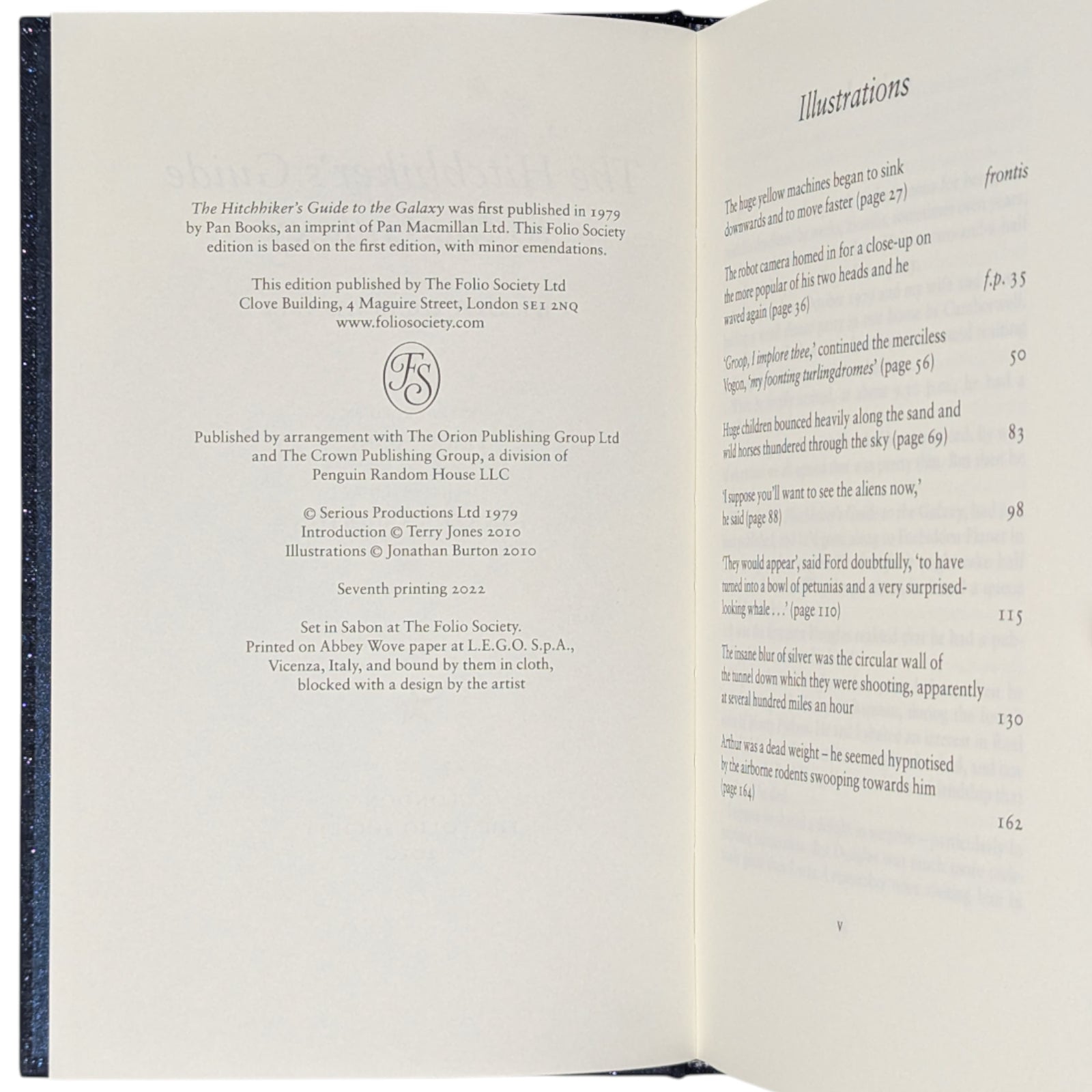 - The Hitchhiker’s Guide to the Galaxy, by Douglas Adams. London: The Folio Society, 2010. Seventh printing thus, 2022. Introduced by Terry Jones, illustrated by Jonathan Burton. 228 × 150 × 22 mm. Pp. [i–iv] v–xiv, [1–2] 3–174 [175–178]: [8] leaves of colour plates (facing pp. [iii], 35, 50, 83, 98, 115, 130 and 162). Type: Sabon. Printed and bound by L.E.G.O. in full dark blue cloth flecked with metallic greens, blocked with design in silver by Burton; metallic blue endleaves. Metallic blue slip case.