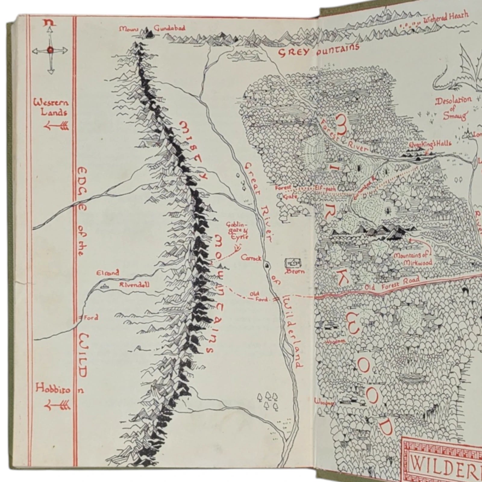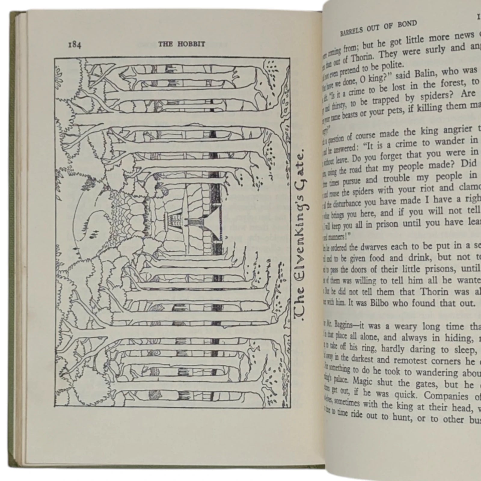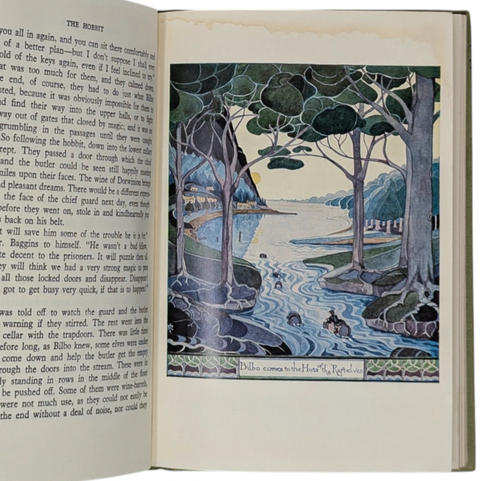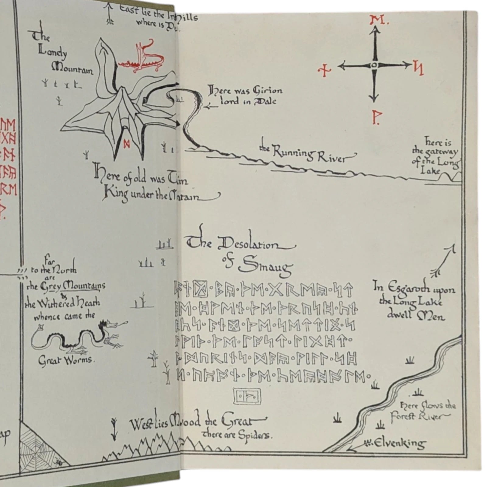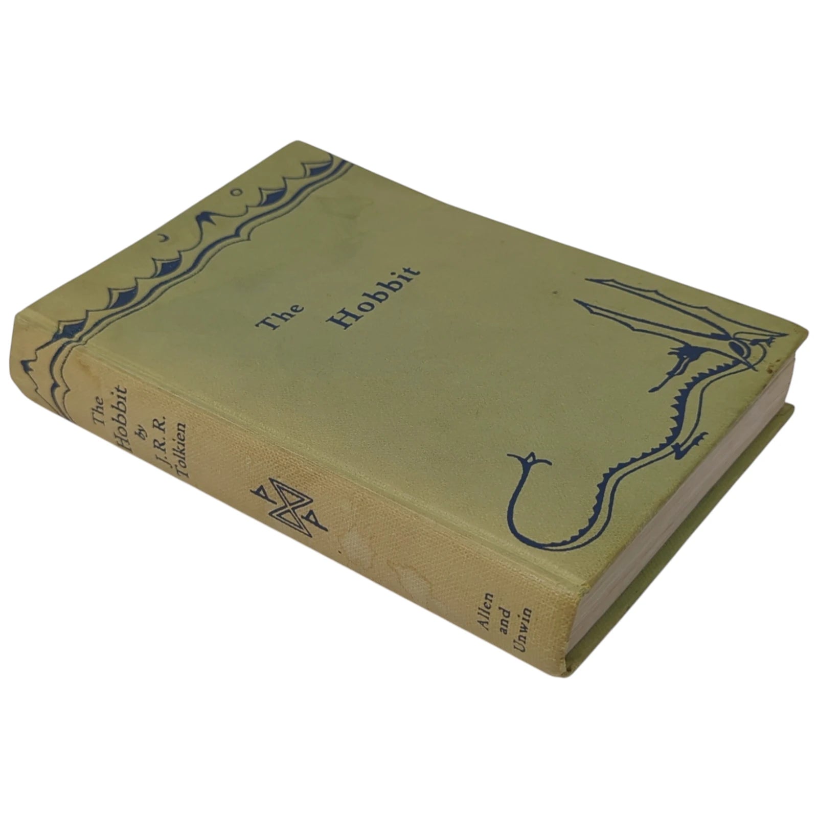 The Hobbit or There and Back Again, by J. R. R. Tolkien. London: George Allen & Unwin Ltd, [1937]. Third edition, seventeenth impression, 1967. Publisher's original green cloth binding, with black lettering and illustrations to boards and spine, and map endpapers. Missing the original dust wrapper. Illustrated by the author.